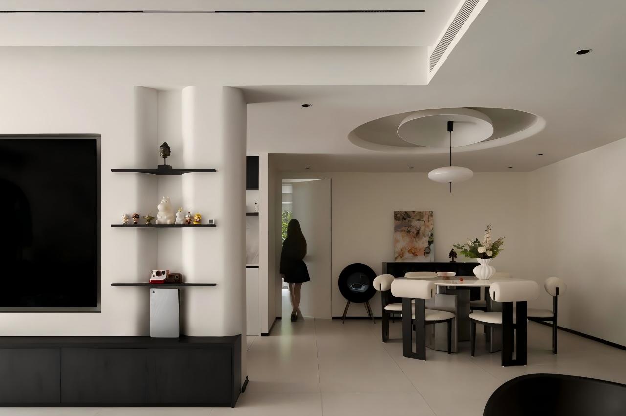 空间布局:采用回形动线设计,以电视背景墙为枢纽串联客厅与茶室,保障空间流通性与情感连接;茶室衔接餐厅与庭院,形成动静过渡枢纽;主卧采用一体化布局整合多元功能;餐厅圆形吊顶塑造视觉向心力,优化空间韵律。