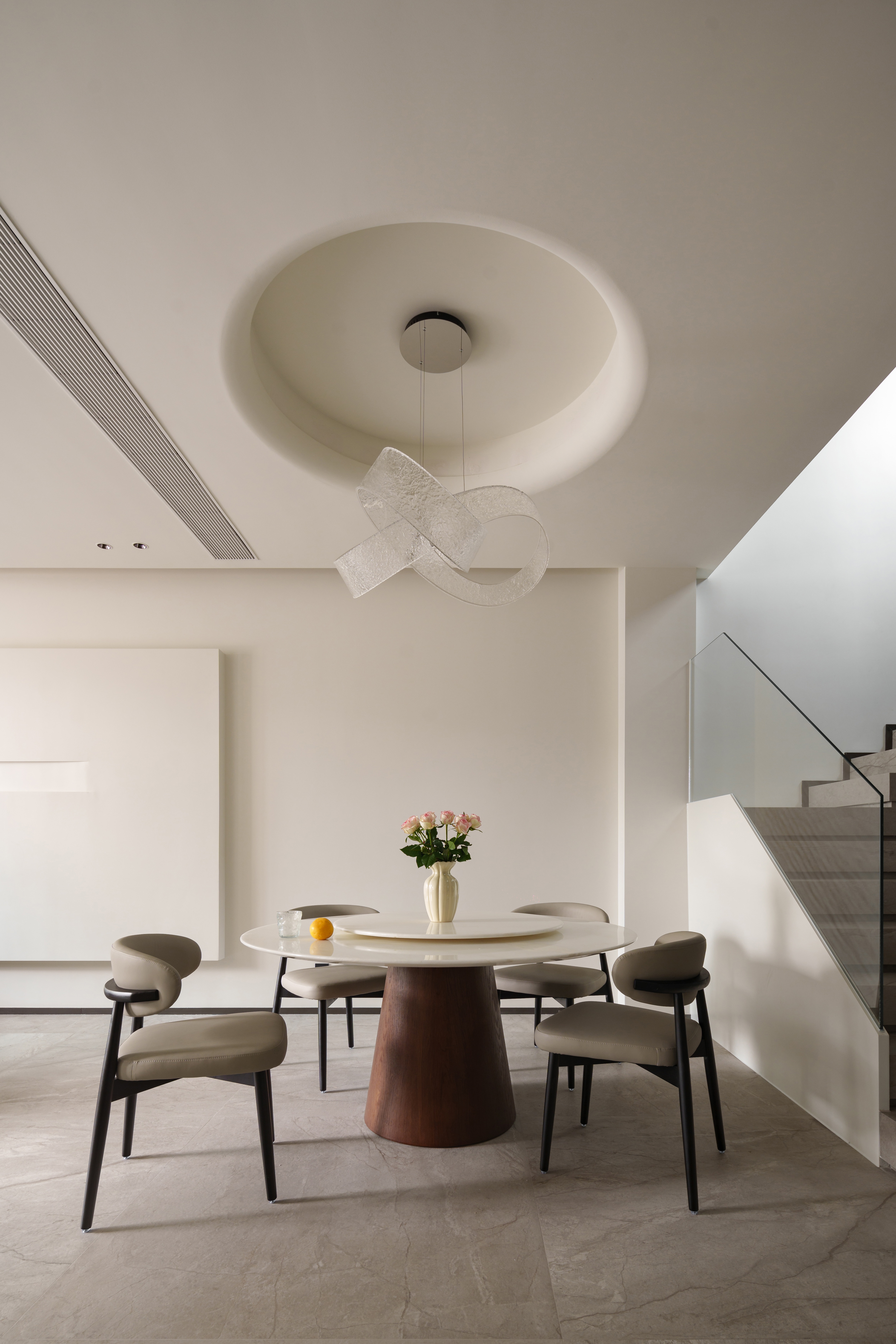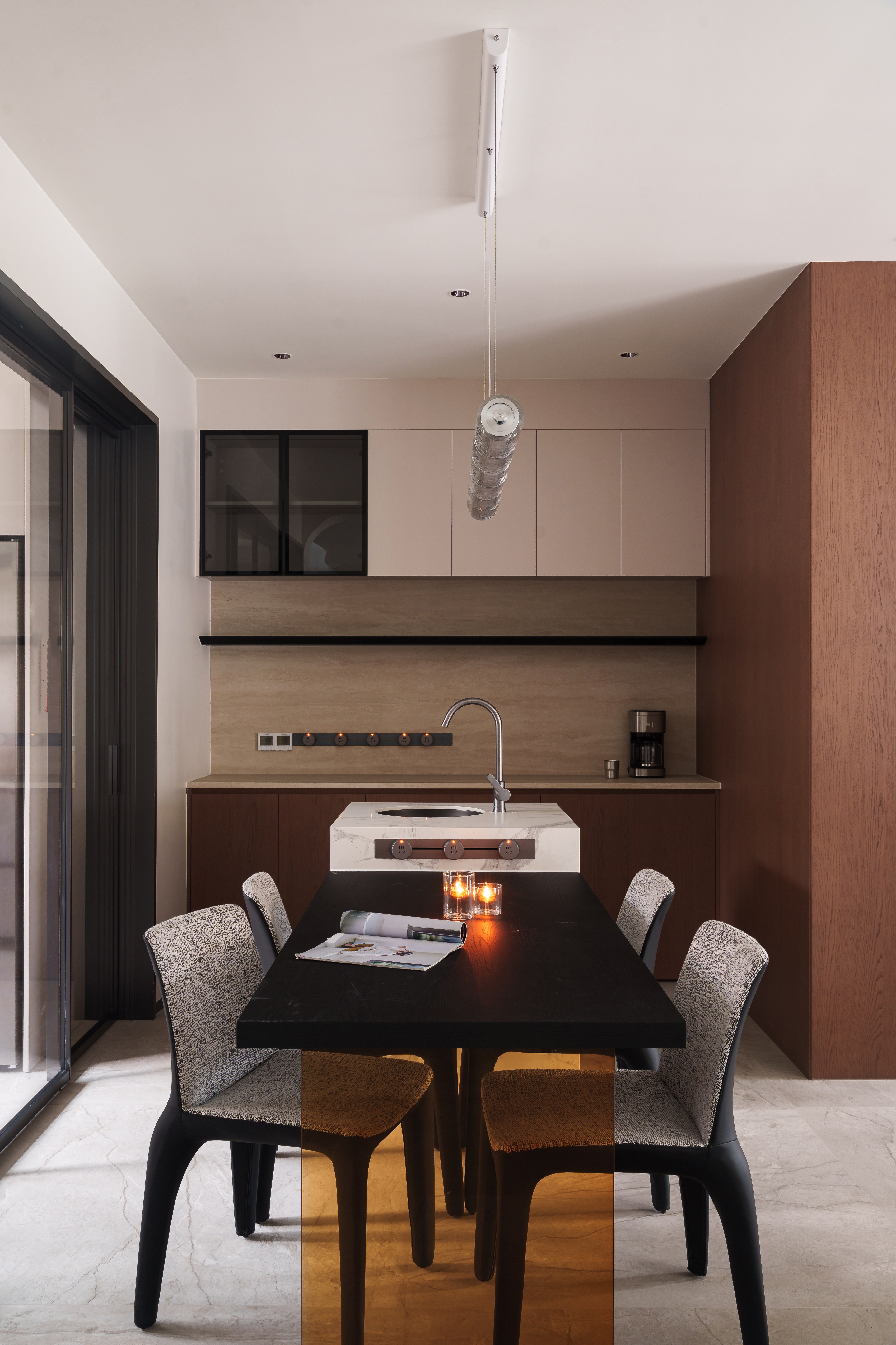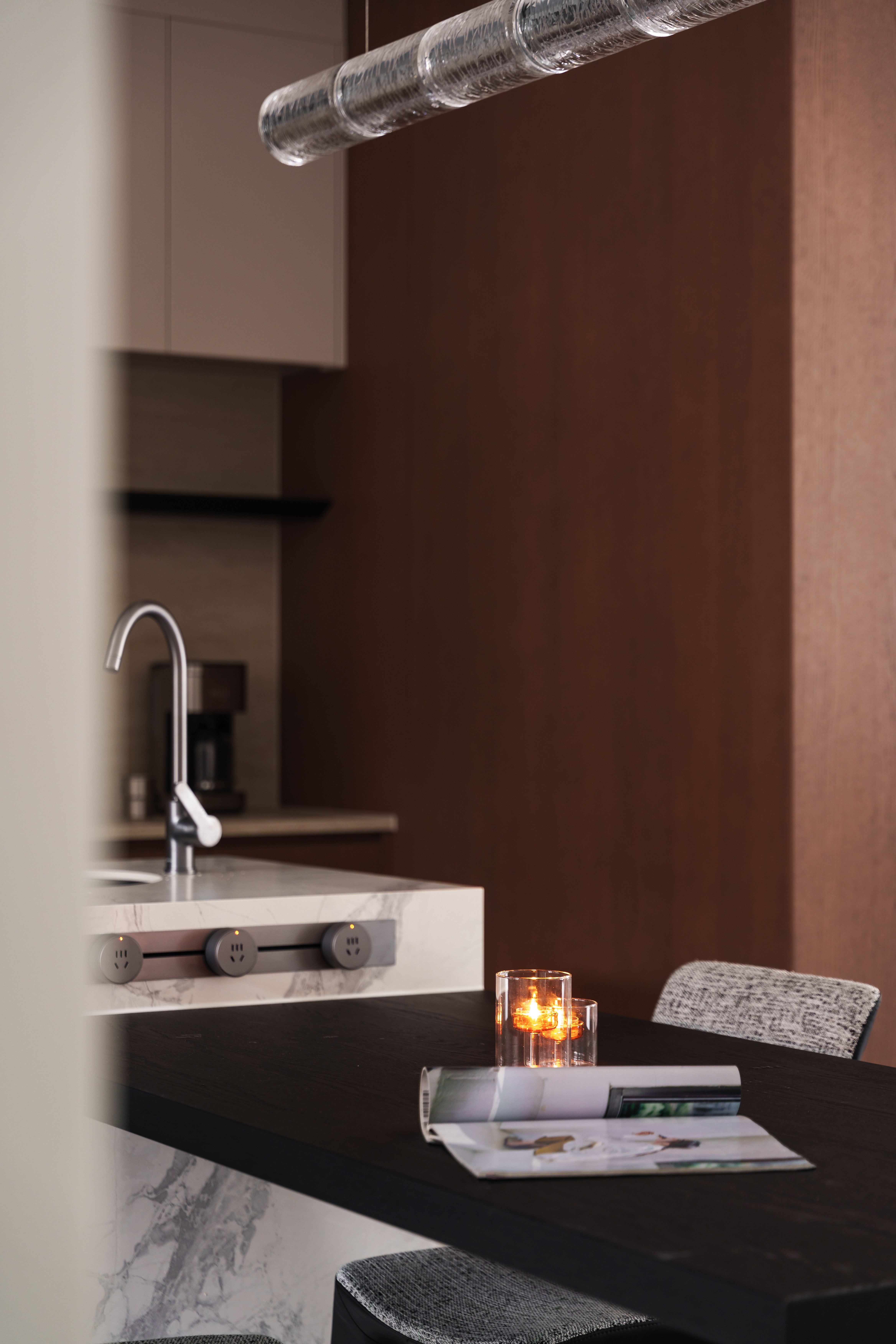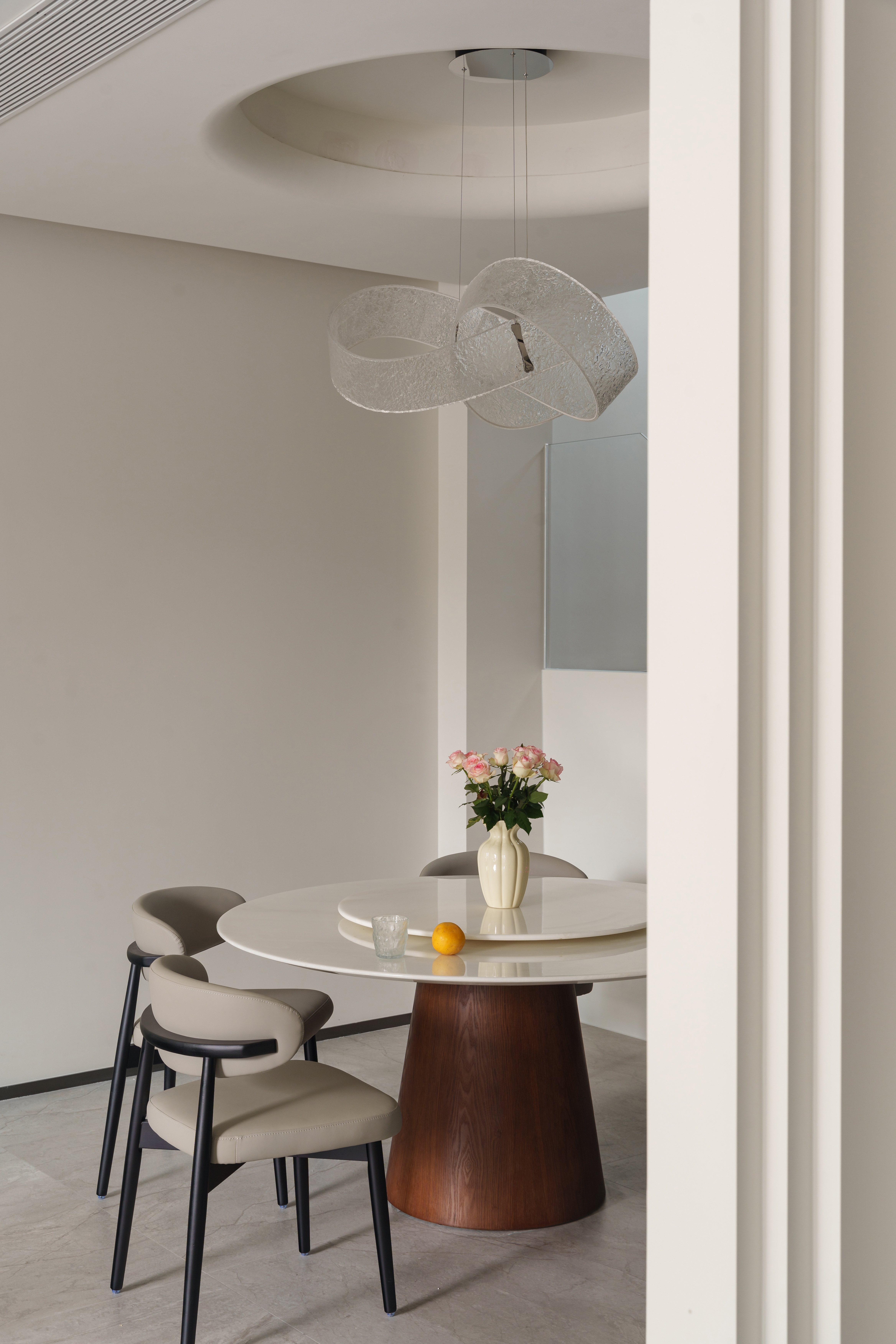 烟火格调 圆桌凝聚温度,线性吊灯落下几何光影。 岩板、金属与木质,在光下呈现精确的质感层次。烟火日常,于此升格为仪式。