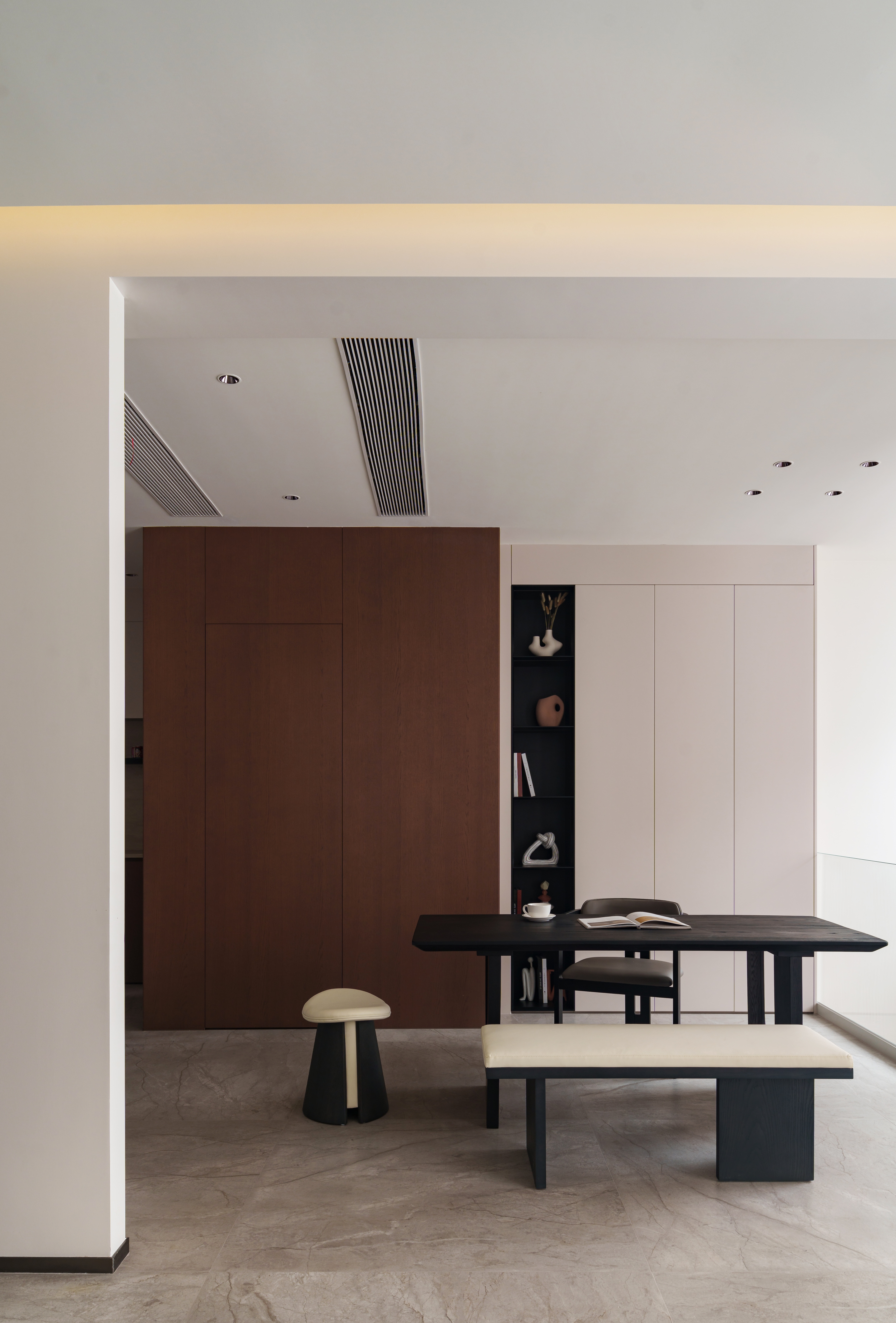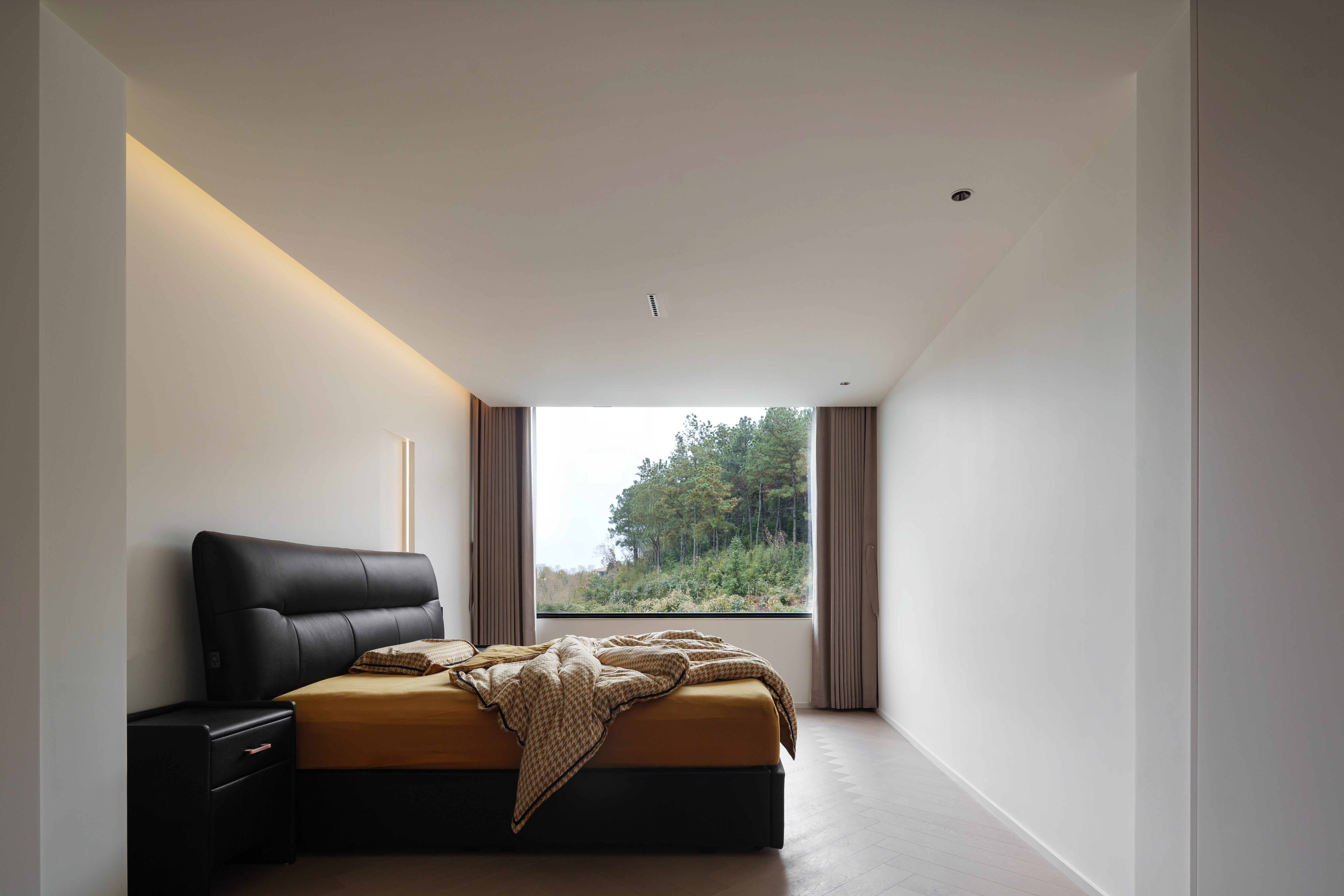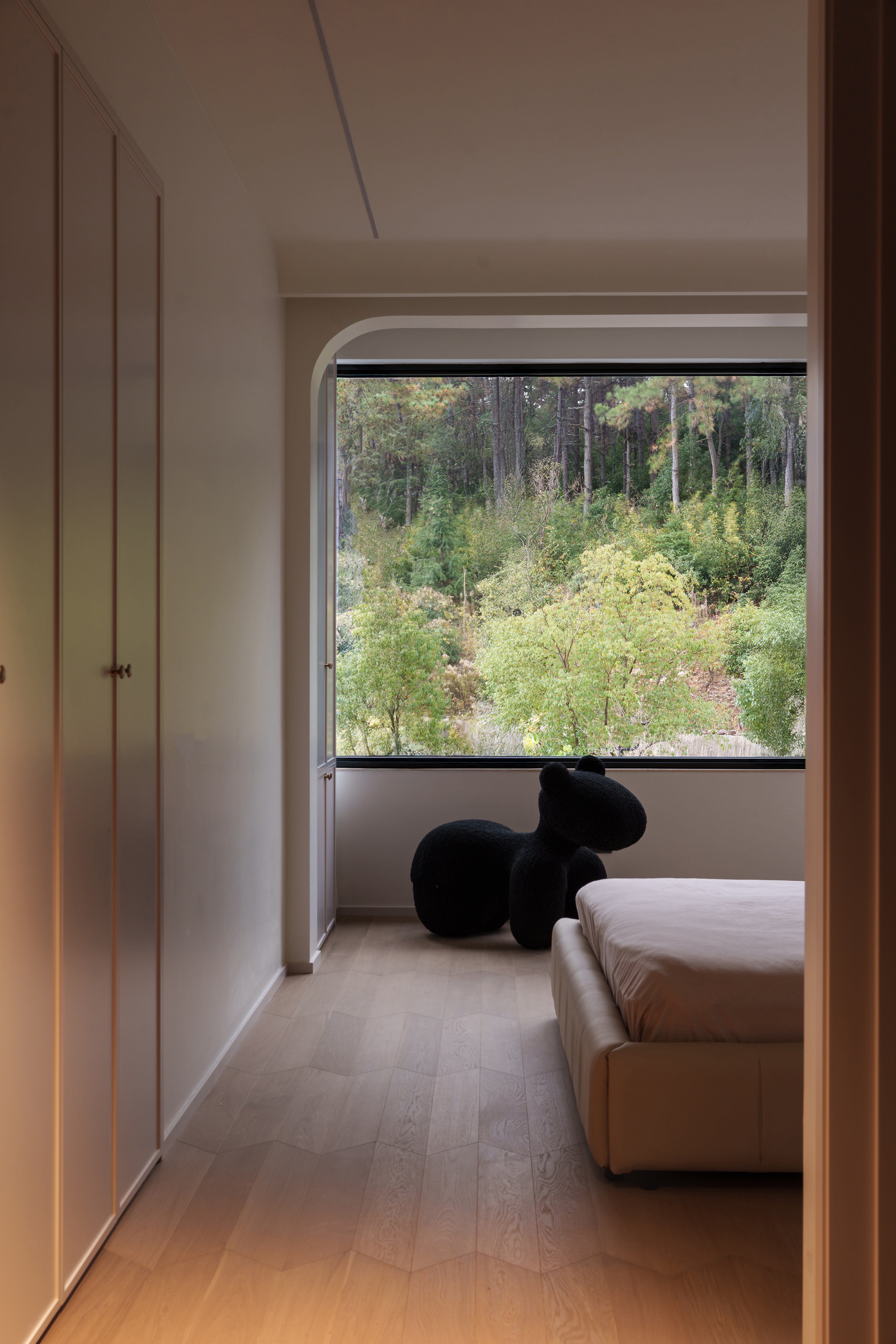 一处是克制的戏剧感:深色基底、宽幅窗景,光成为精准的点缀。 一处是匀质的包裹感:从墙到顶的浅色系,光线漫射,营造出失重般的舒缓。