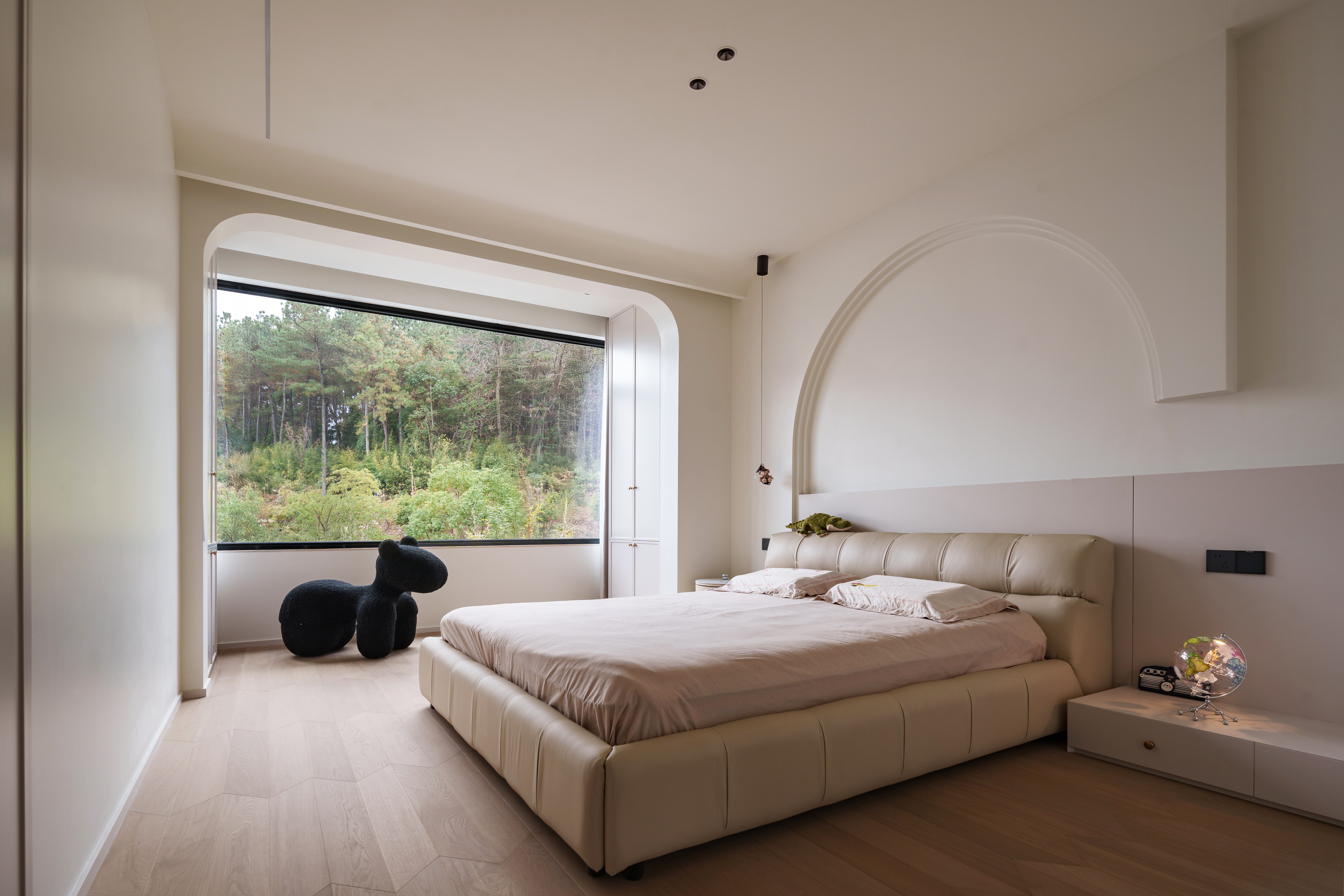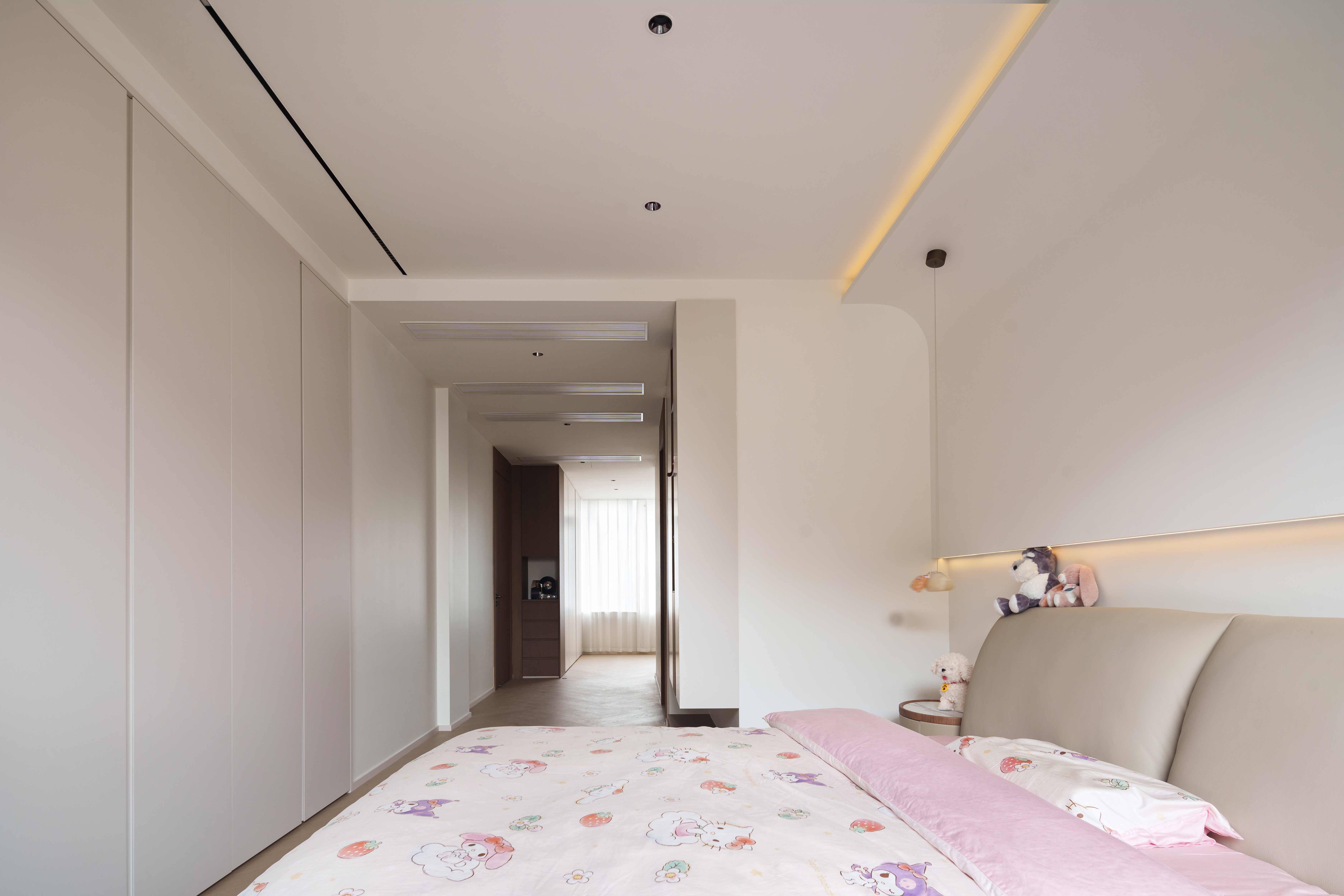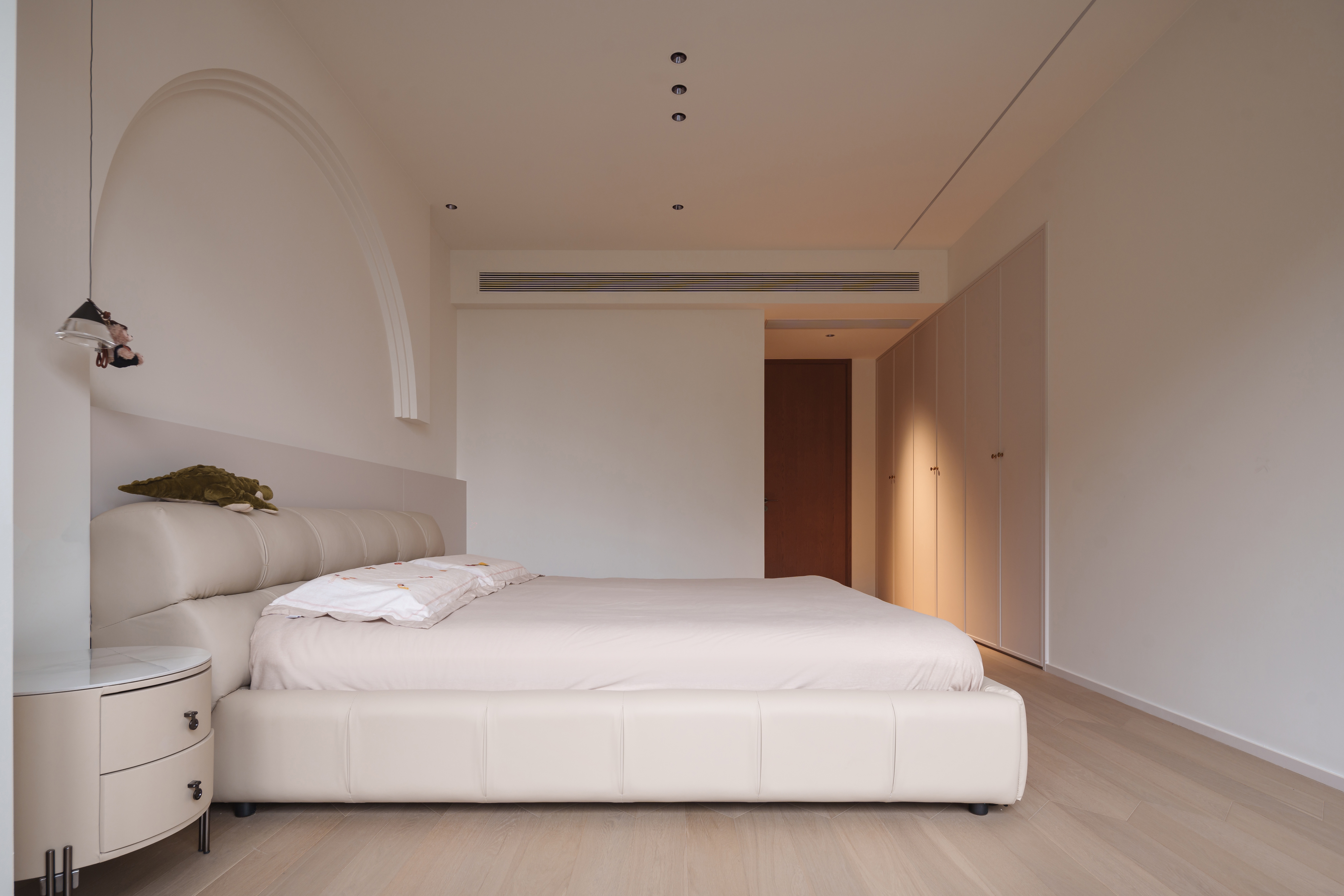光线被温柔地控制在均匀的饱和度里。弧形元素与嵌入式光带,构筑出一个安全、柔软的梦境孵化器。