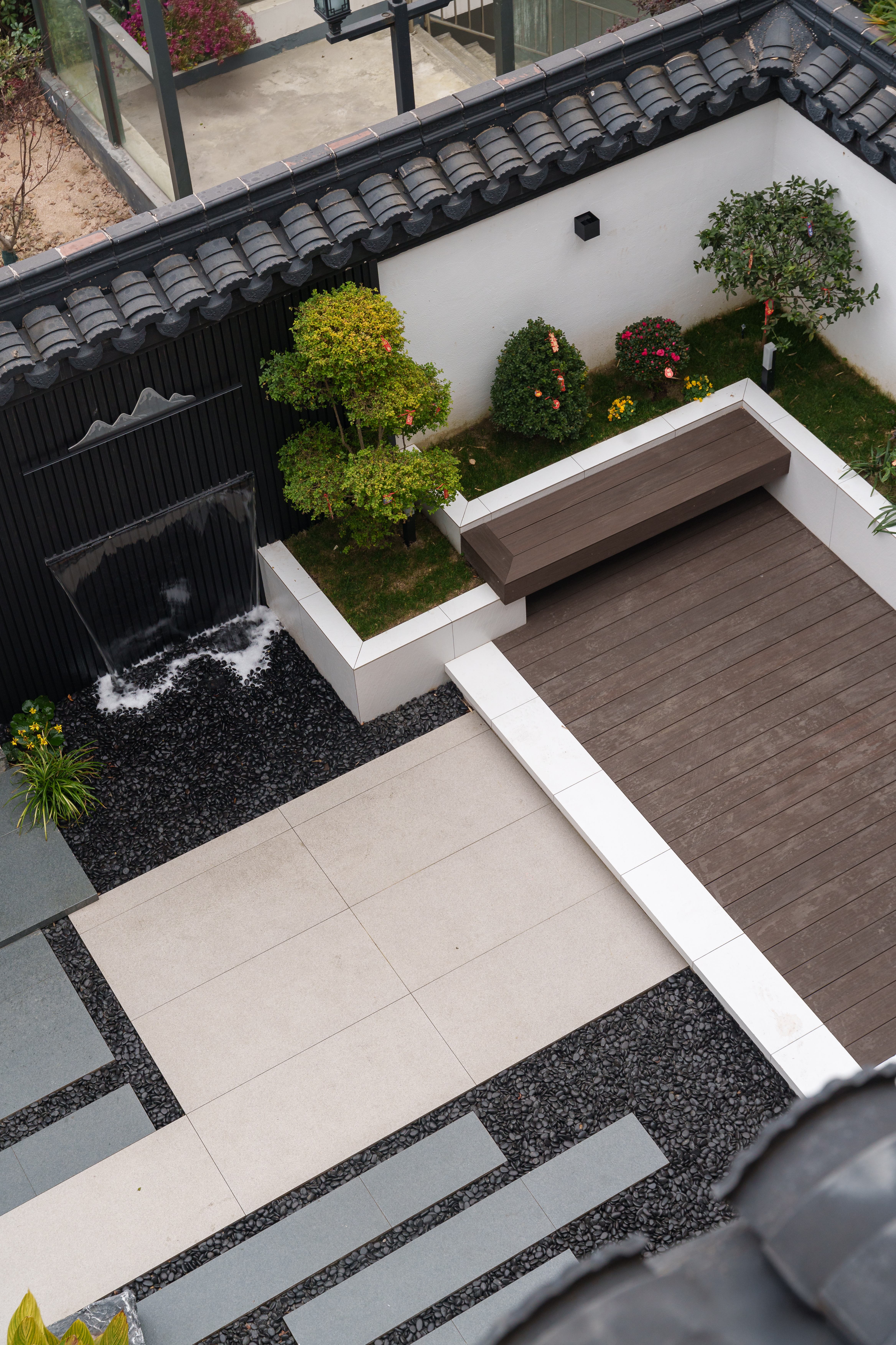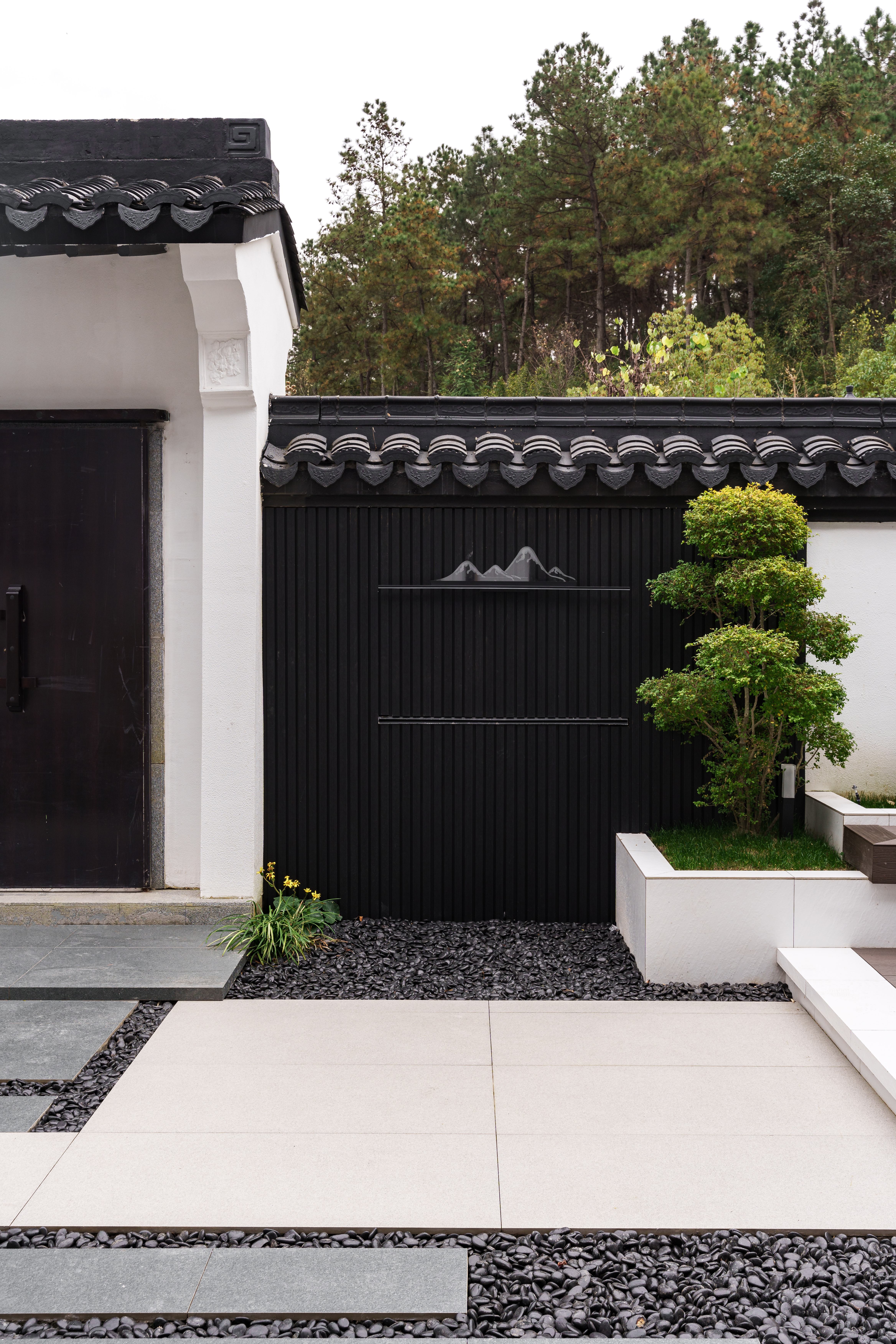 庭院,是空间的最终句读。 白墙为画布,黑色格栅勾勒线条,流水与绿植是唯一的动态笔触。 极简的东方意境,不诉诸符号,而归于材料与光影的纯粹对话。
