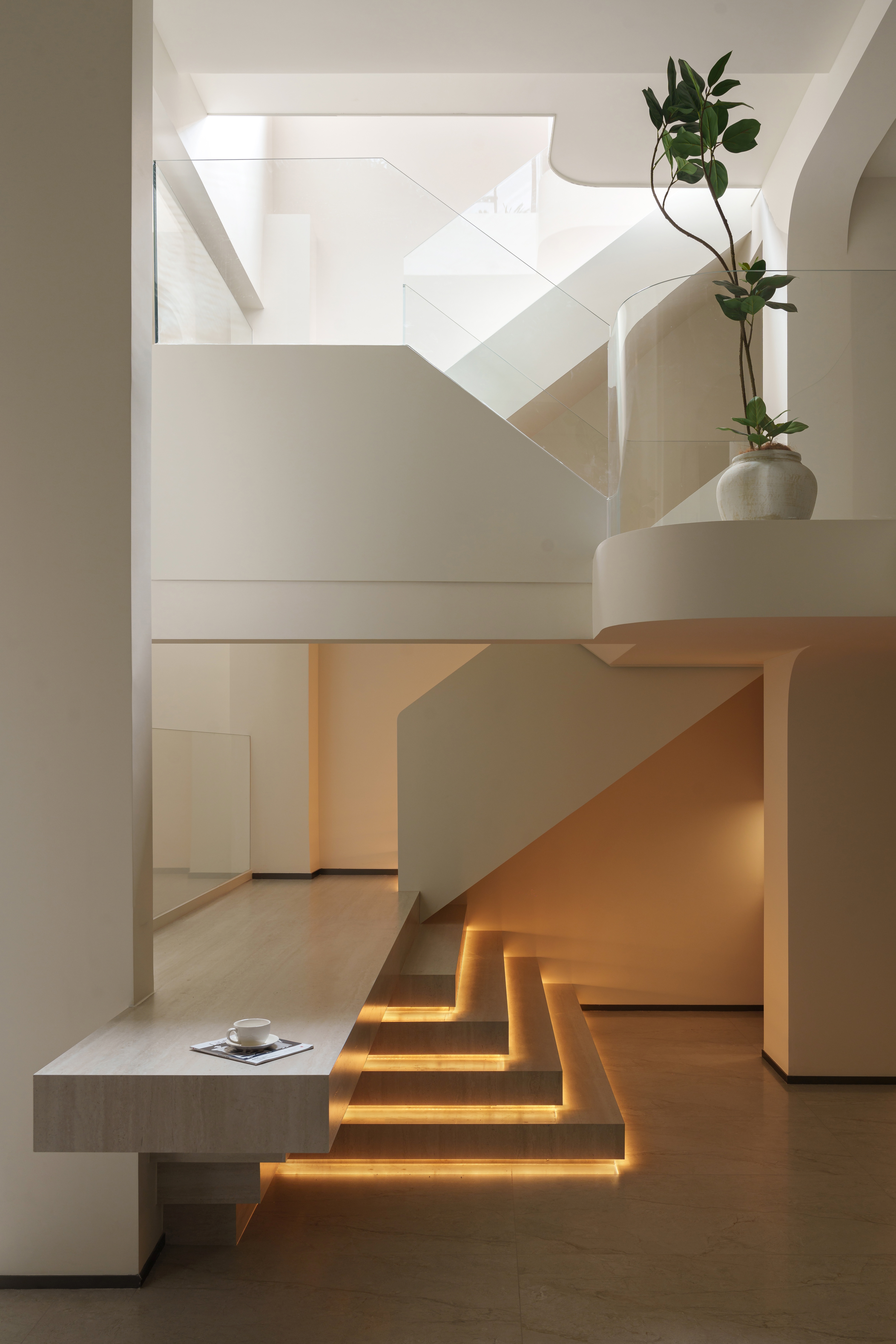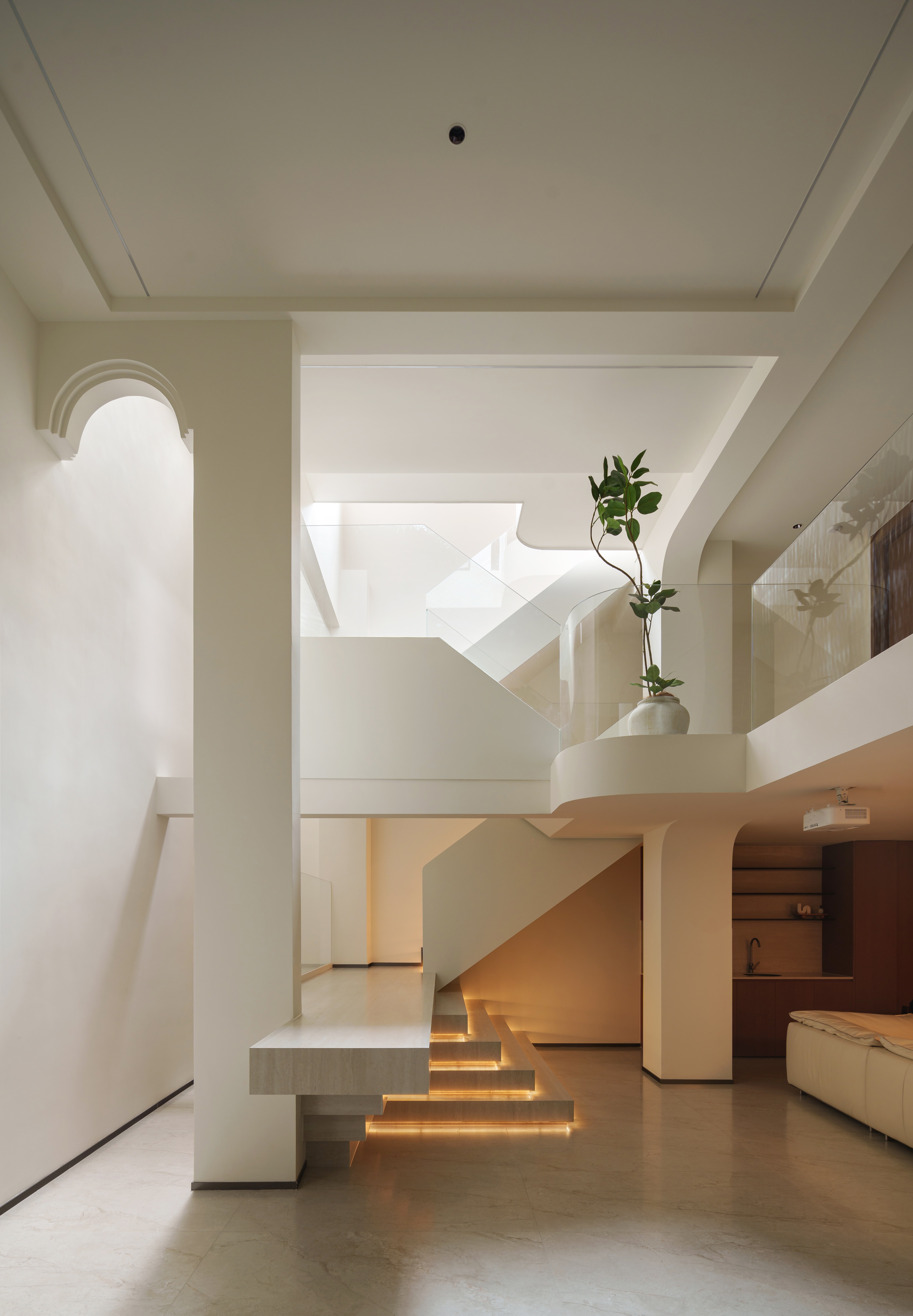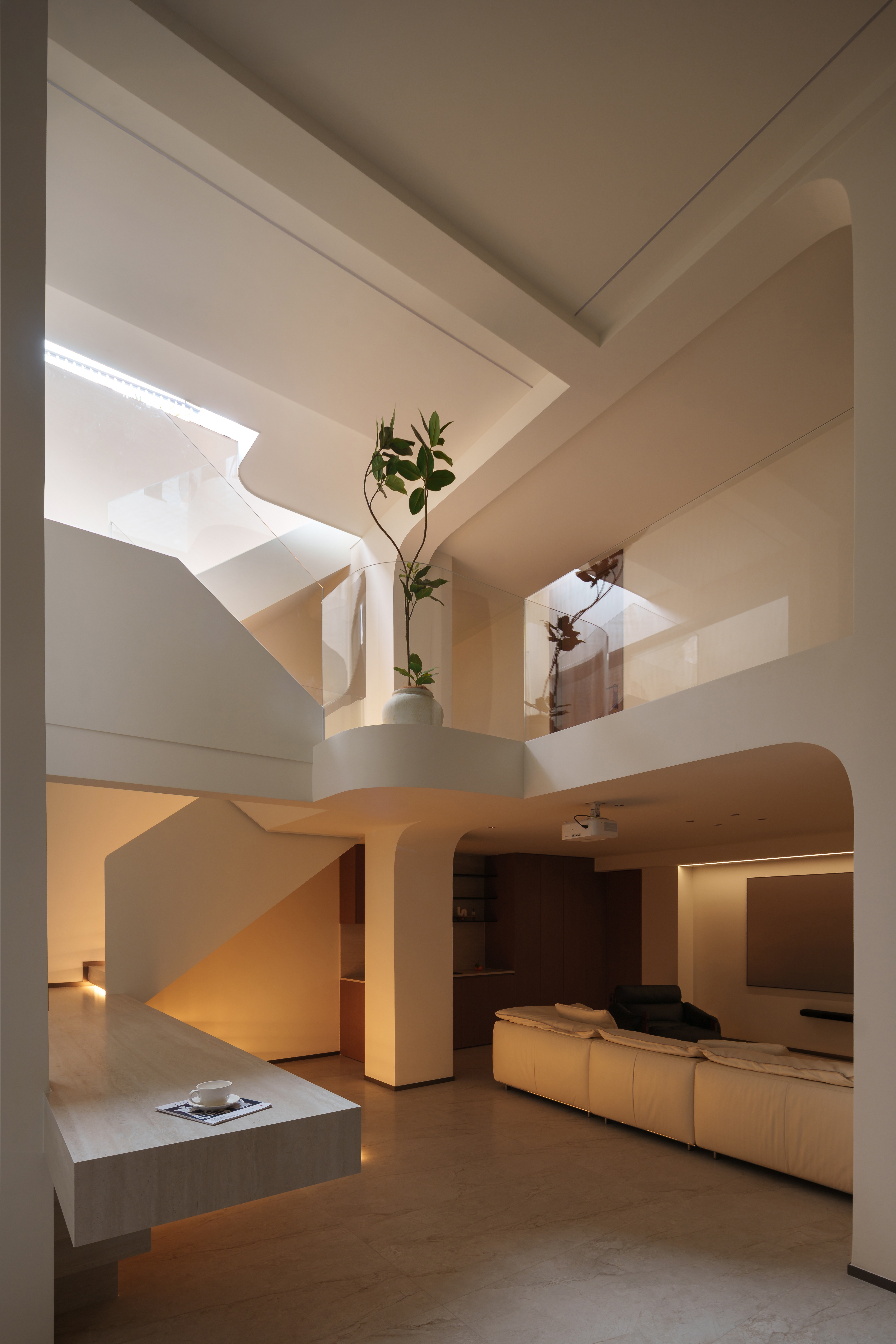 天光凿开穹顶,漫溢而下。 弧形的白墙将它接住、揉散;灯带如藤蔓,沿着阶梯攀爬生长。 玻璃叠映出光的层次,木与绿植在暗处呼吸——这里不再是地下,而是一座被光轻轻托起的岛屿。