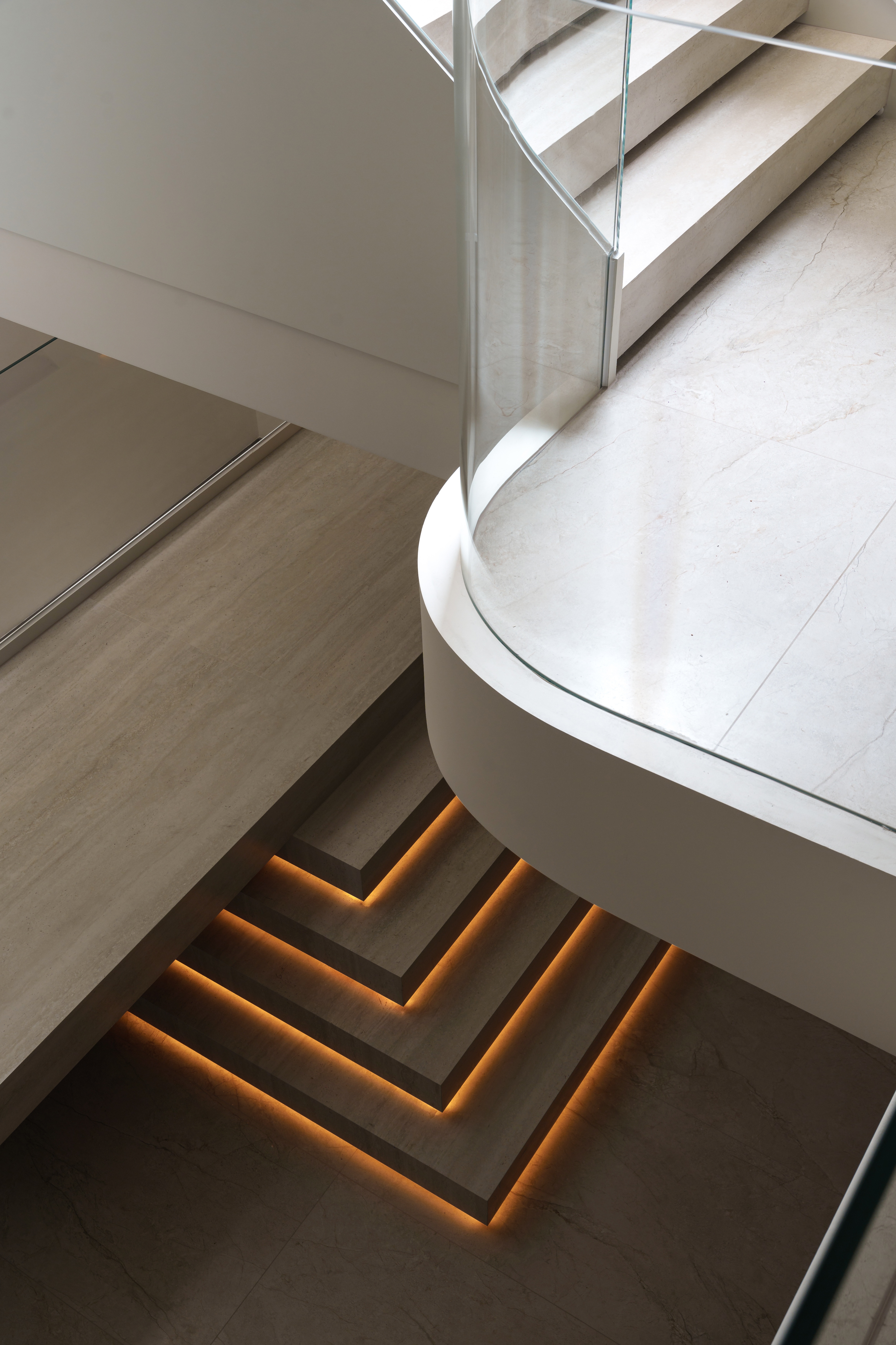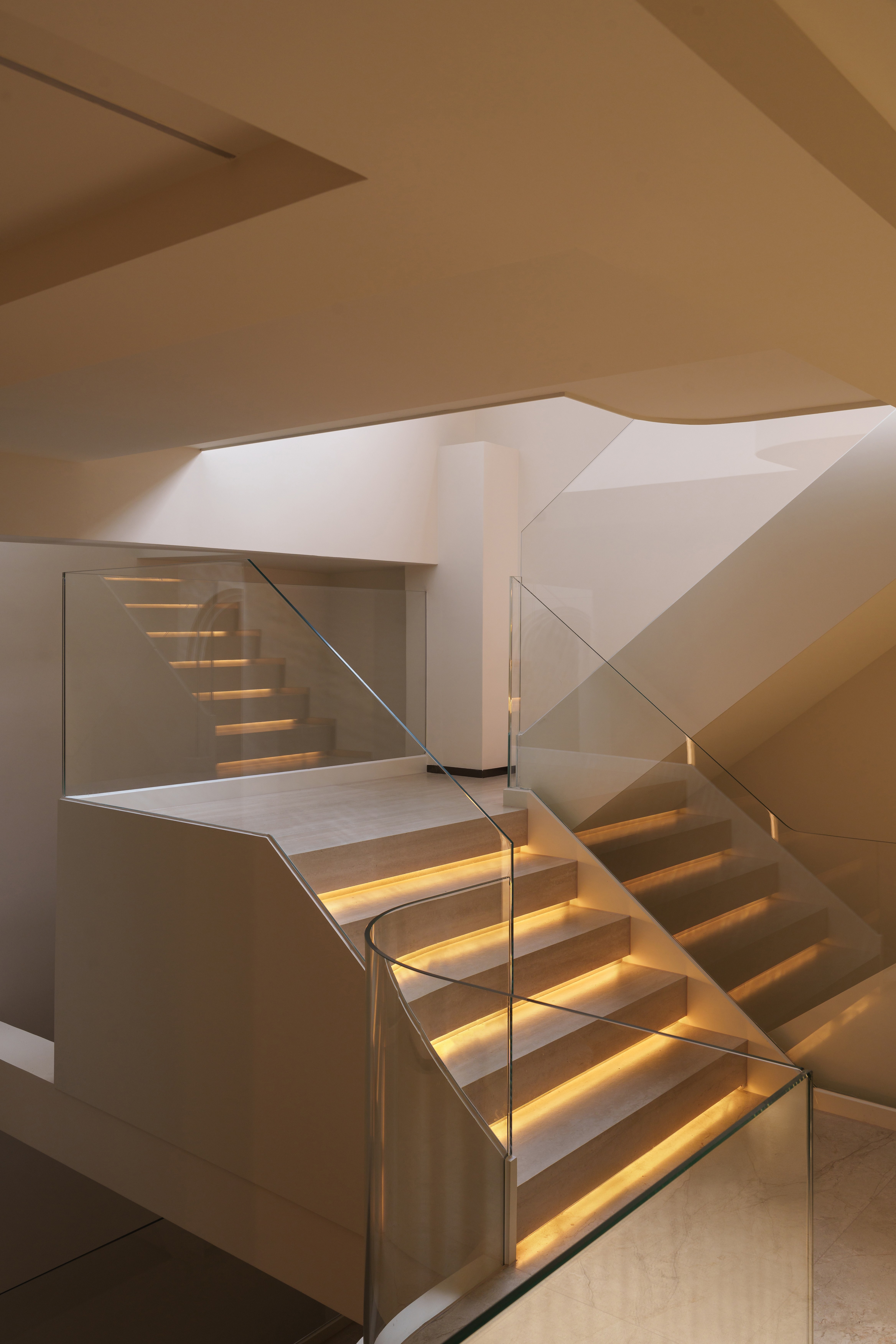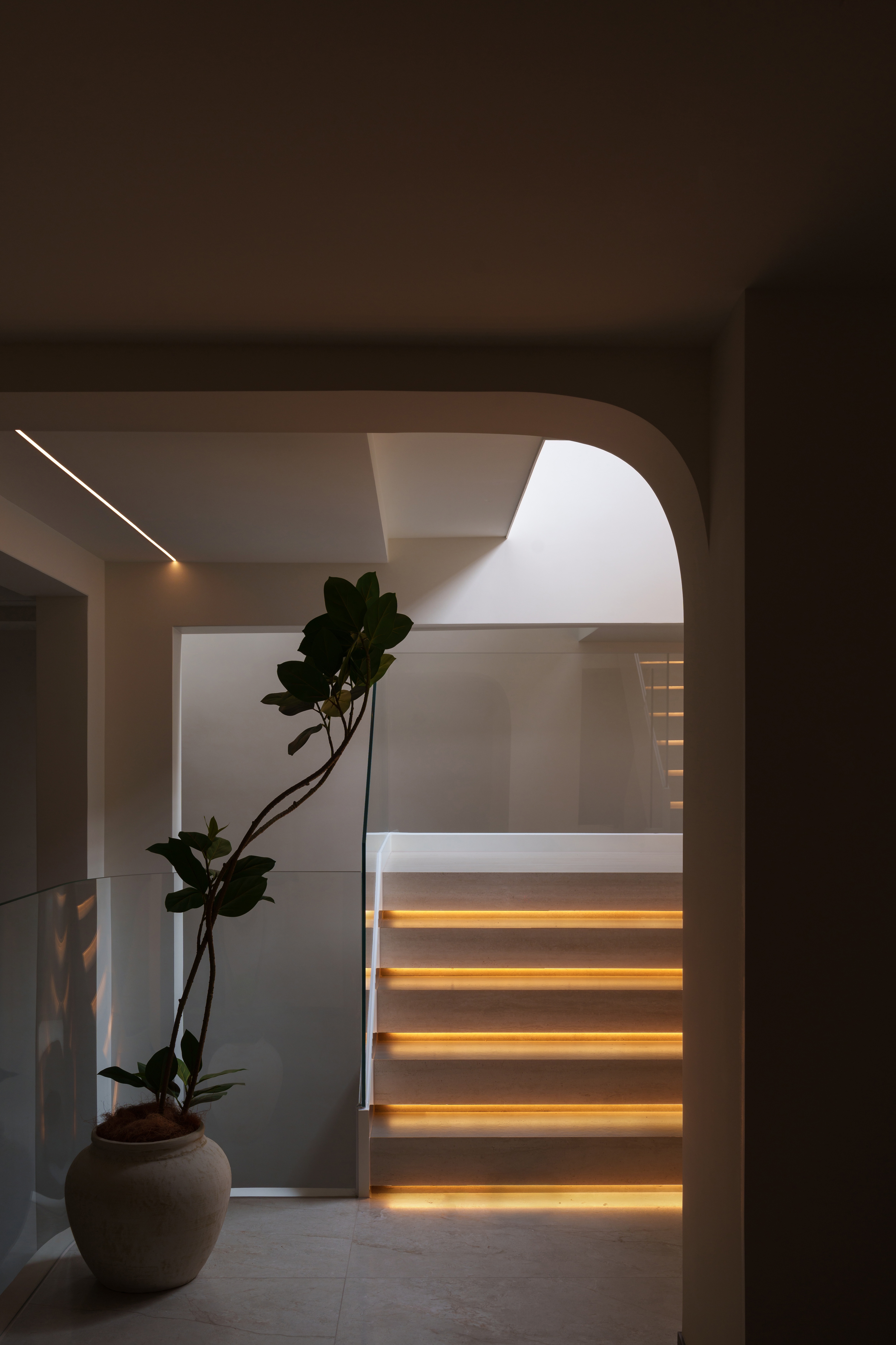 天光凿开穹顶,漫溢而下。 弧形的白墙将它接住、揉散;灯带如藤蔓,沿着阶梯攀爬生长。 玻璃叠映出光的层次,木与绿植在暗处呼吸——这里不再是地下,而是一座被光轻轻托起的岛屿。