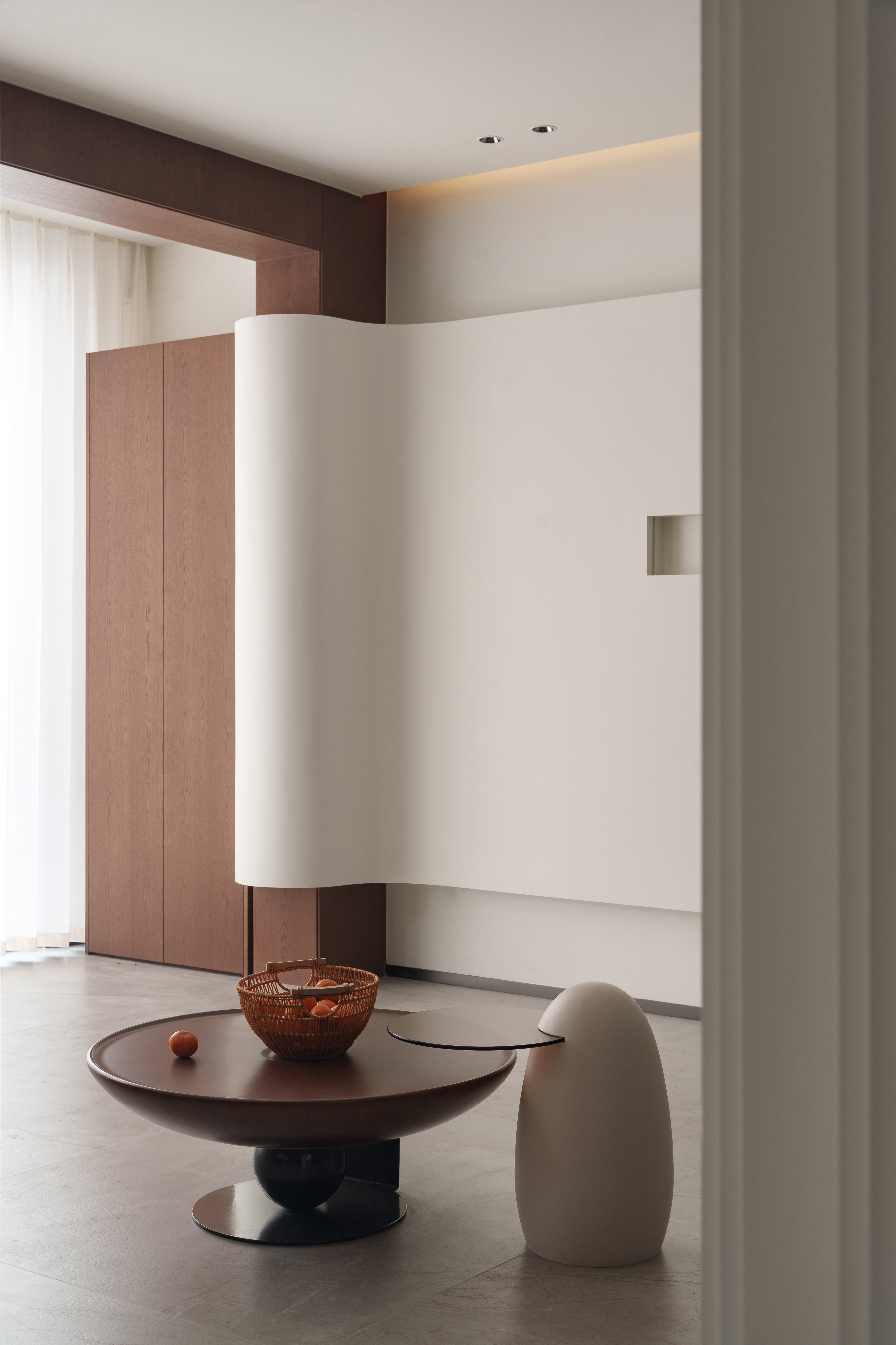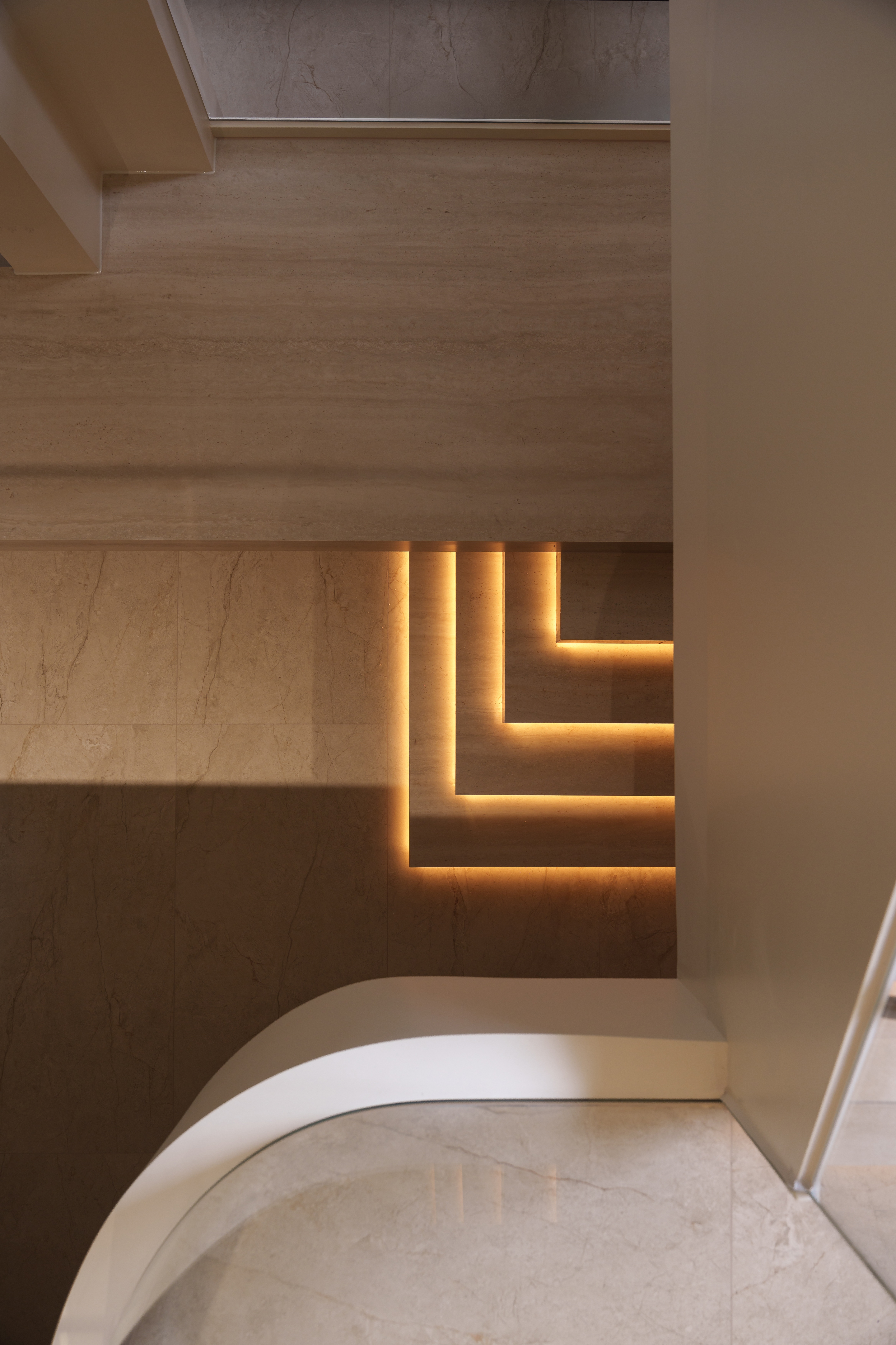 光凿开层次 一道被引入的天光,定义了地下的呼吸。 弧面解构了封闭感,灯带成为视觉的延长线。 木与玻璃介入,光线在其间折射、沉淀,形成首个平静的共鸣场。