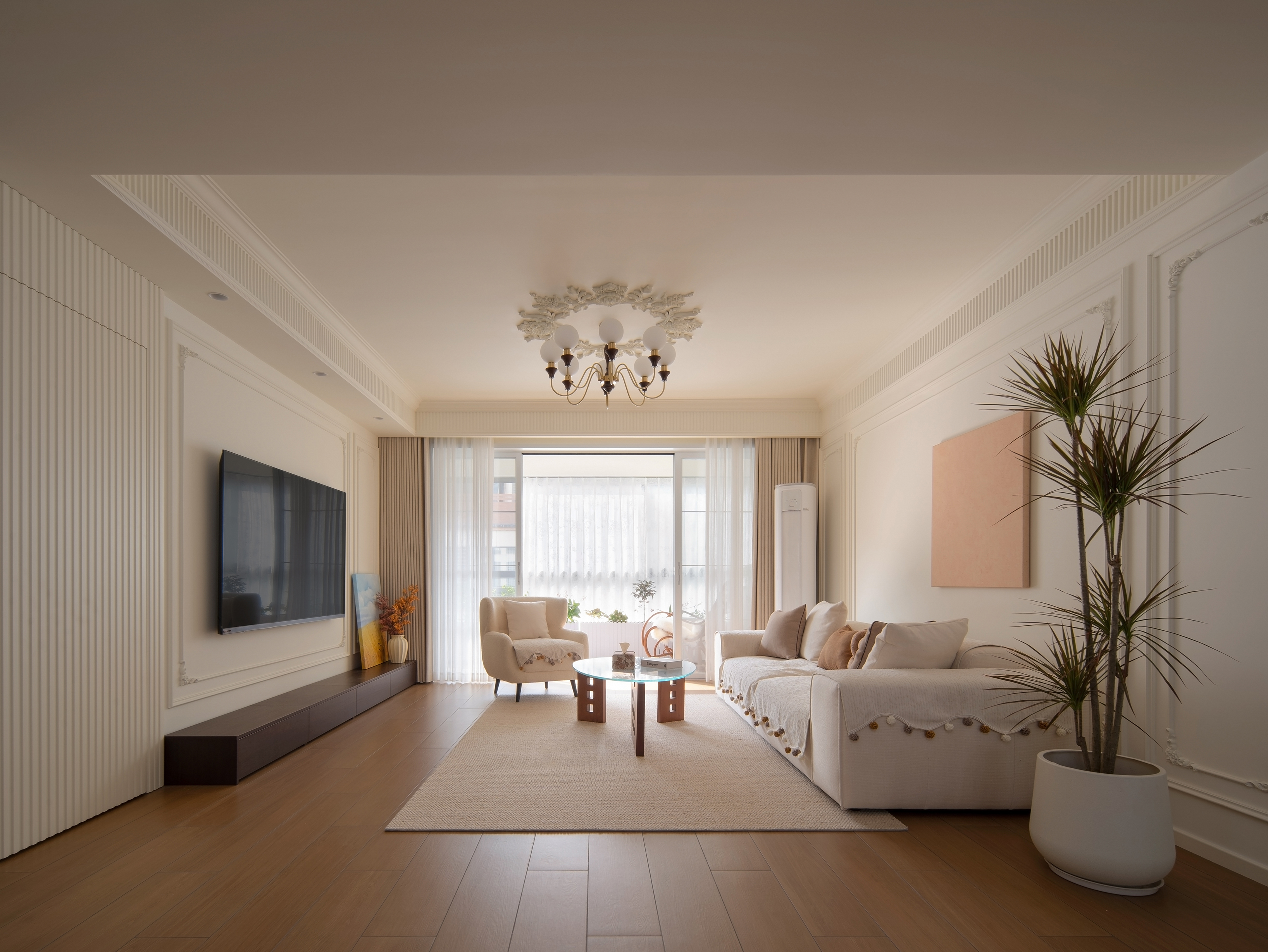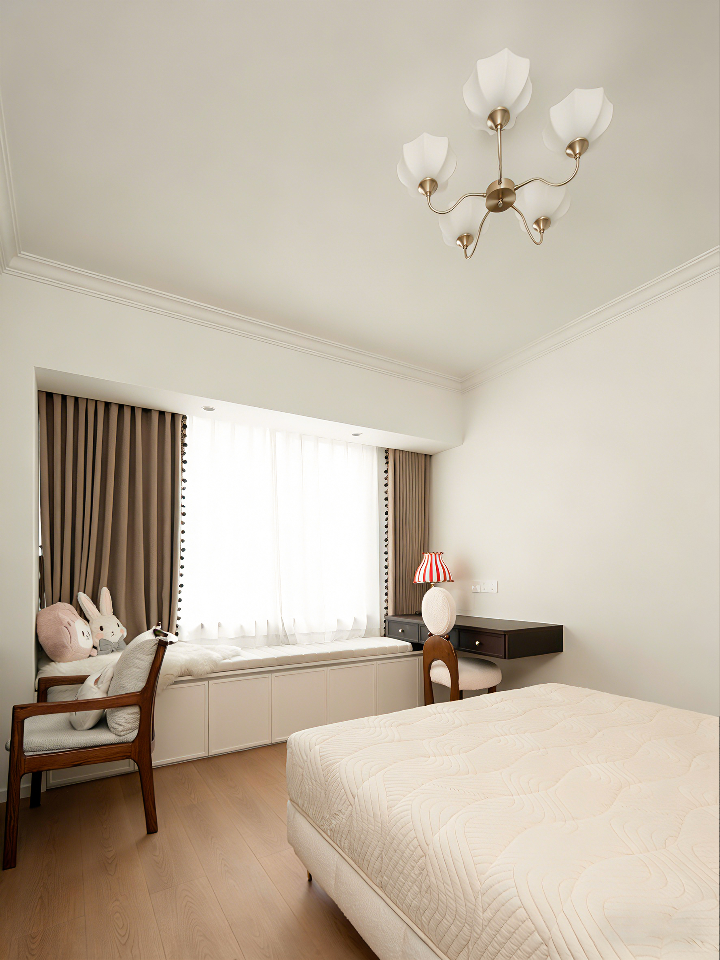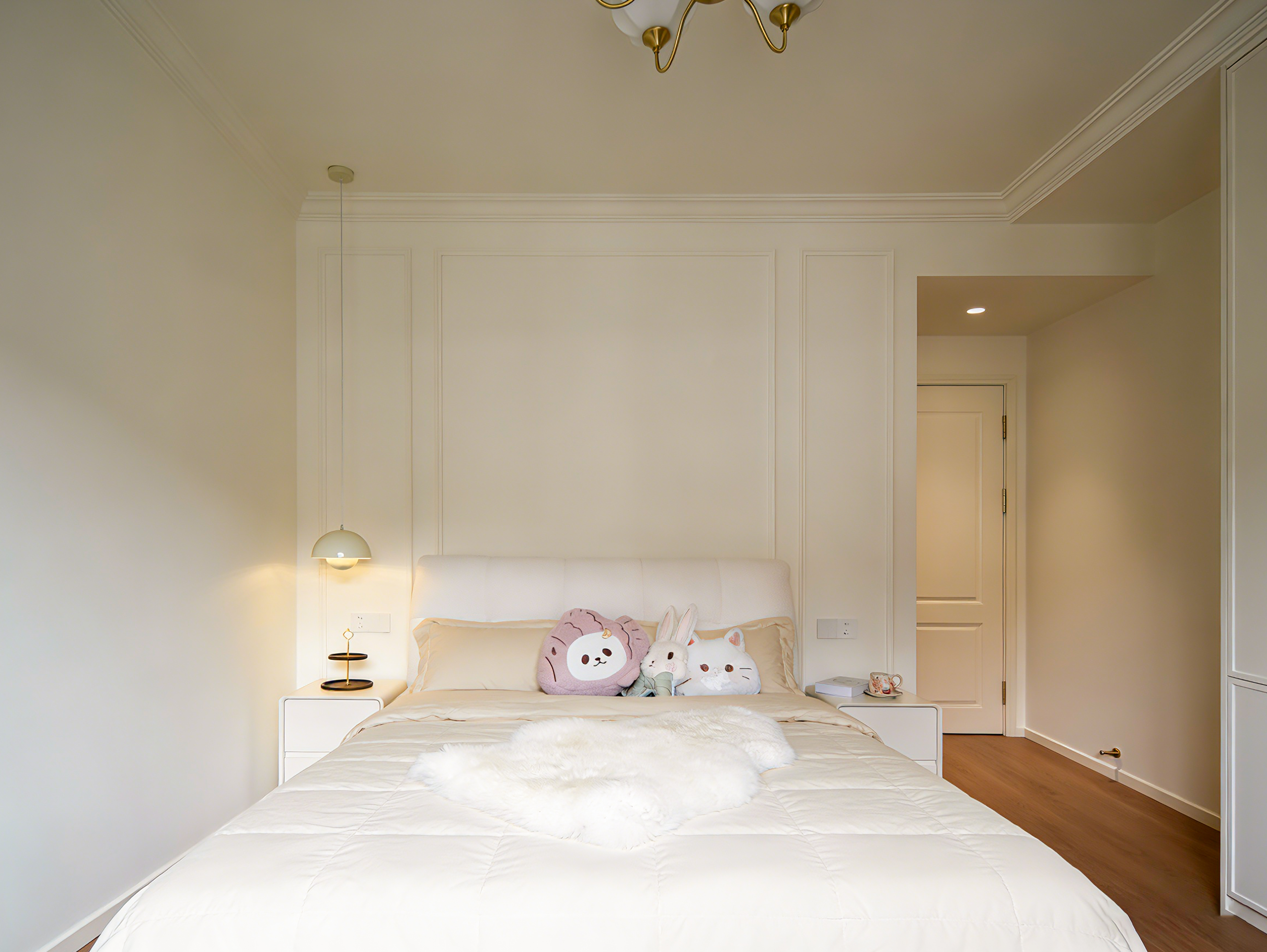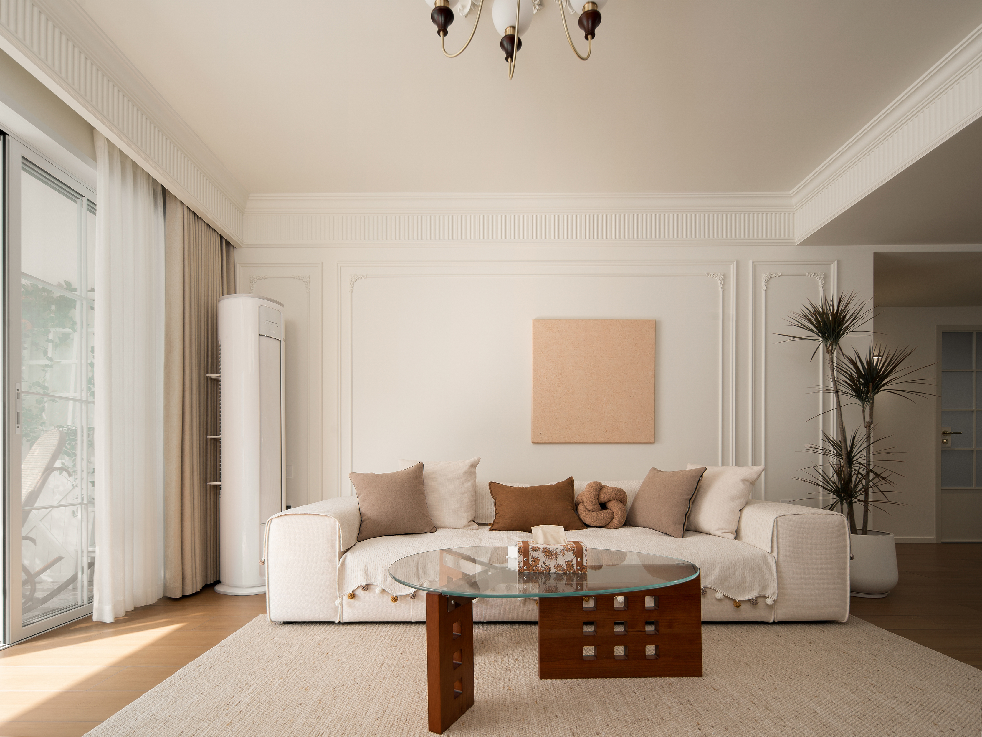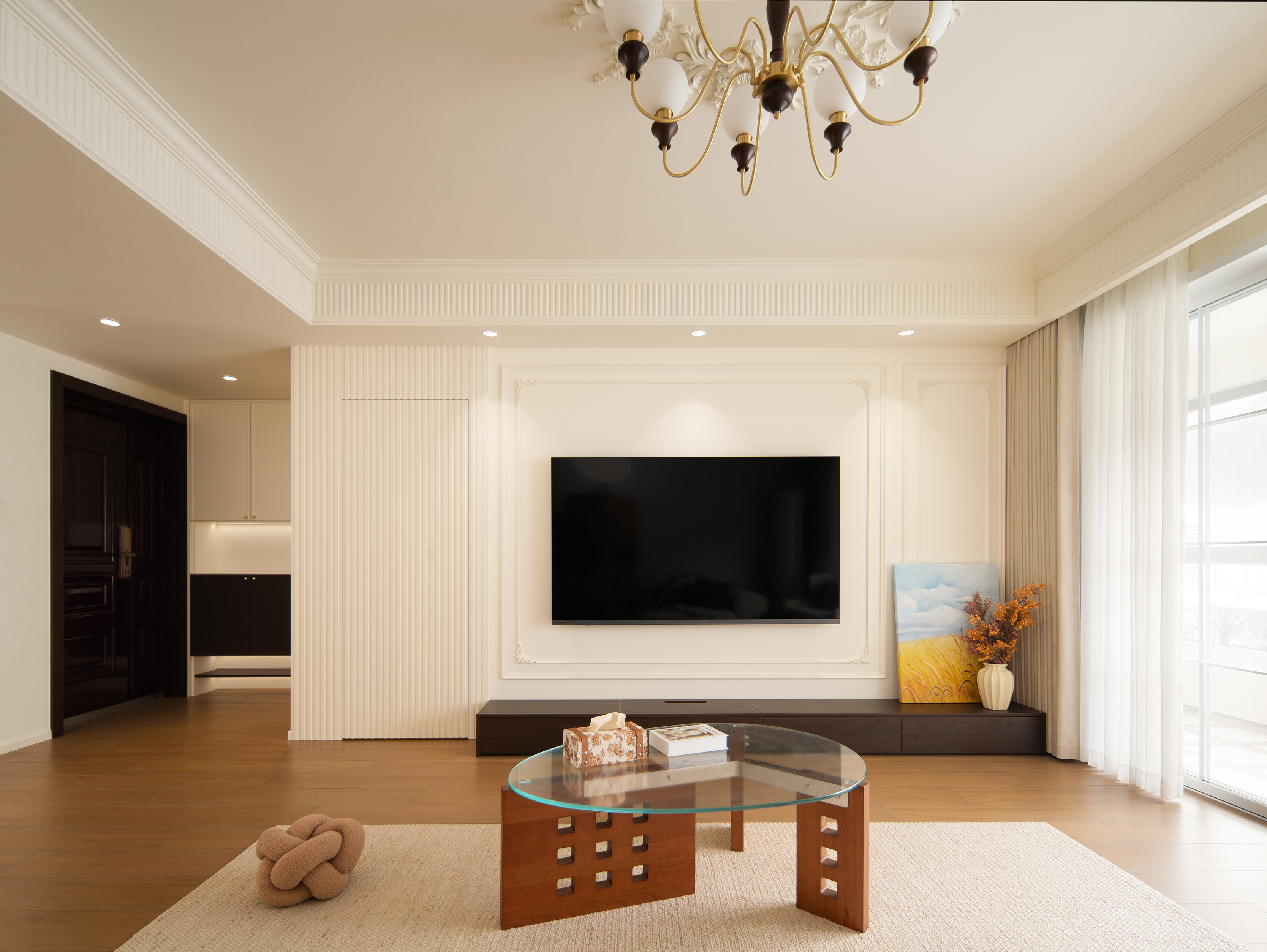用户体验:这是一个被复古线条框起来的温暖奶油梦。杏仁粉的墙、胡桃木的家具、藤编与亚麻的呼吸,共同储存着每一天的晨光。电视墙的隐形门后是静谧,而原来的主卫里,则存档着另一个热血宇宙。最动人的,是阳台上那张被鲜花和阳光簇拥的藤编椅——那是整个家,开始呼吸的地方。