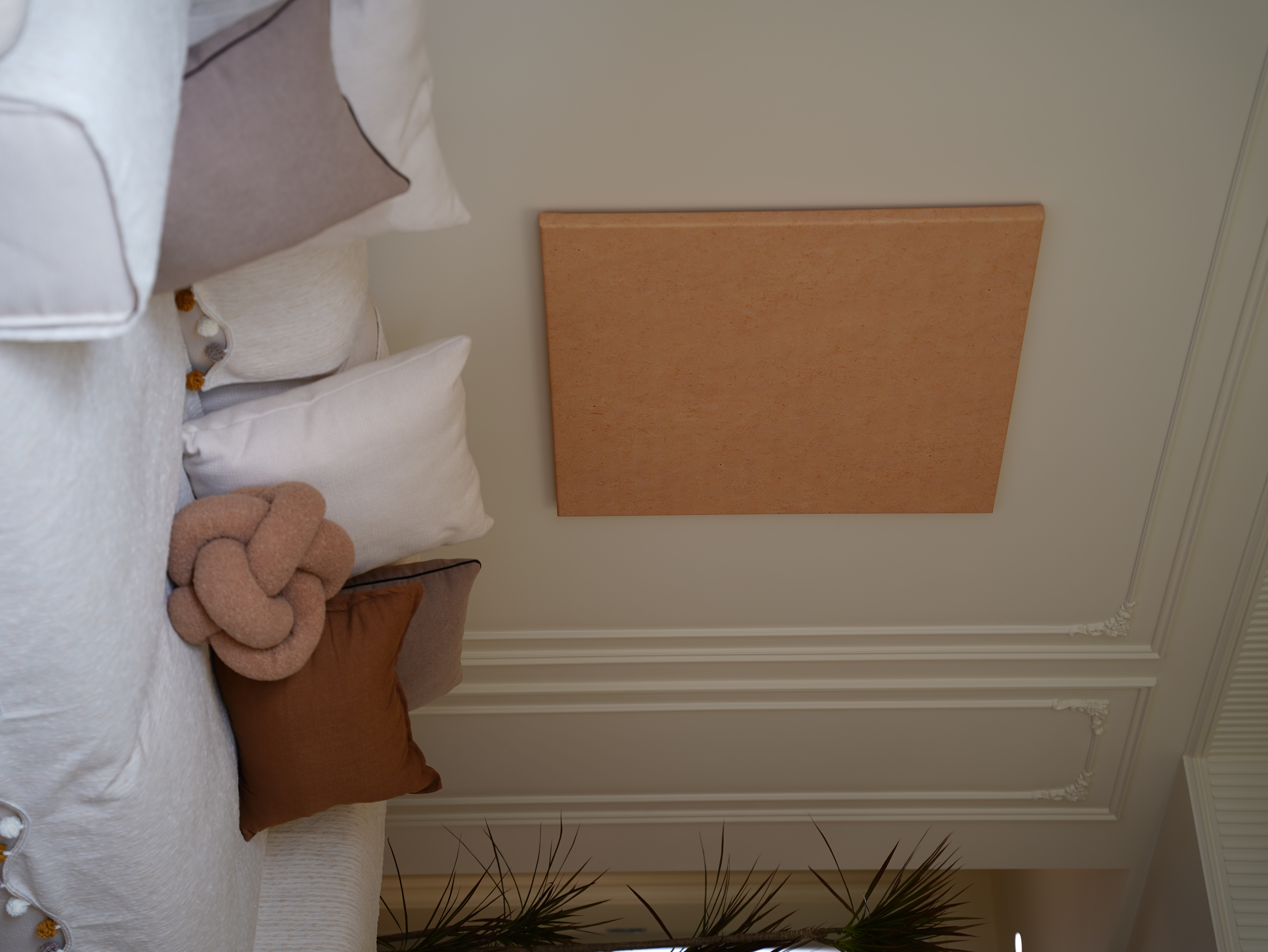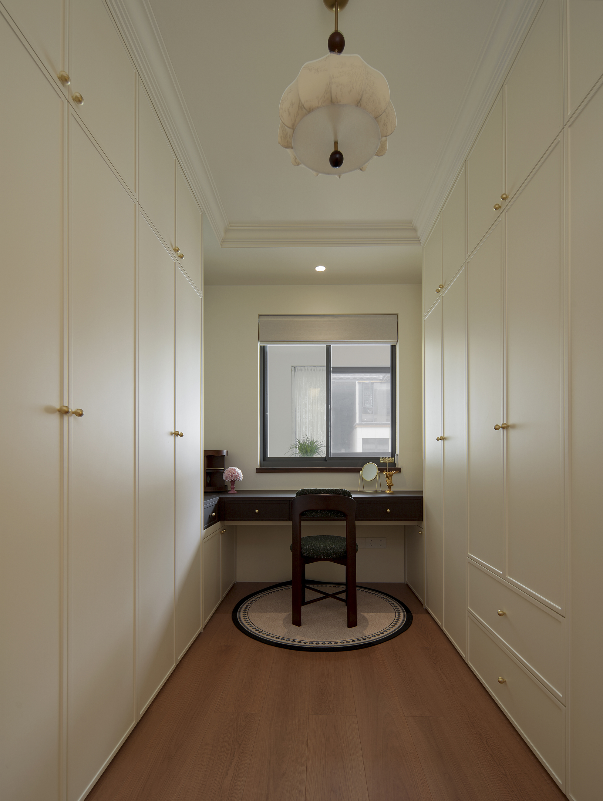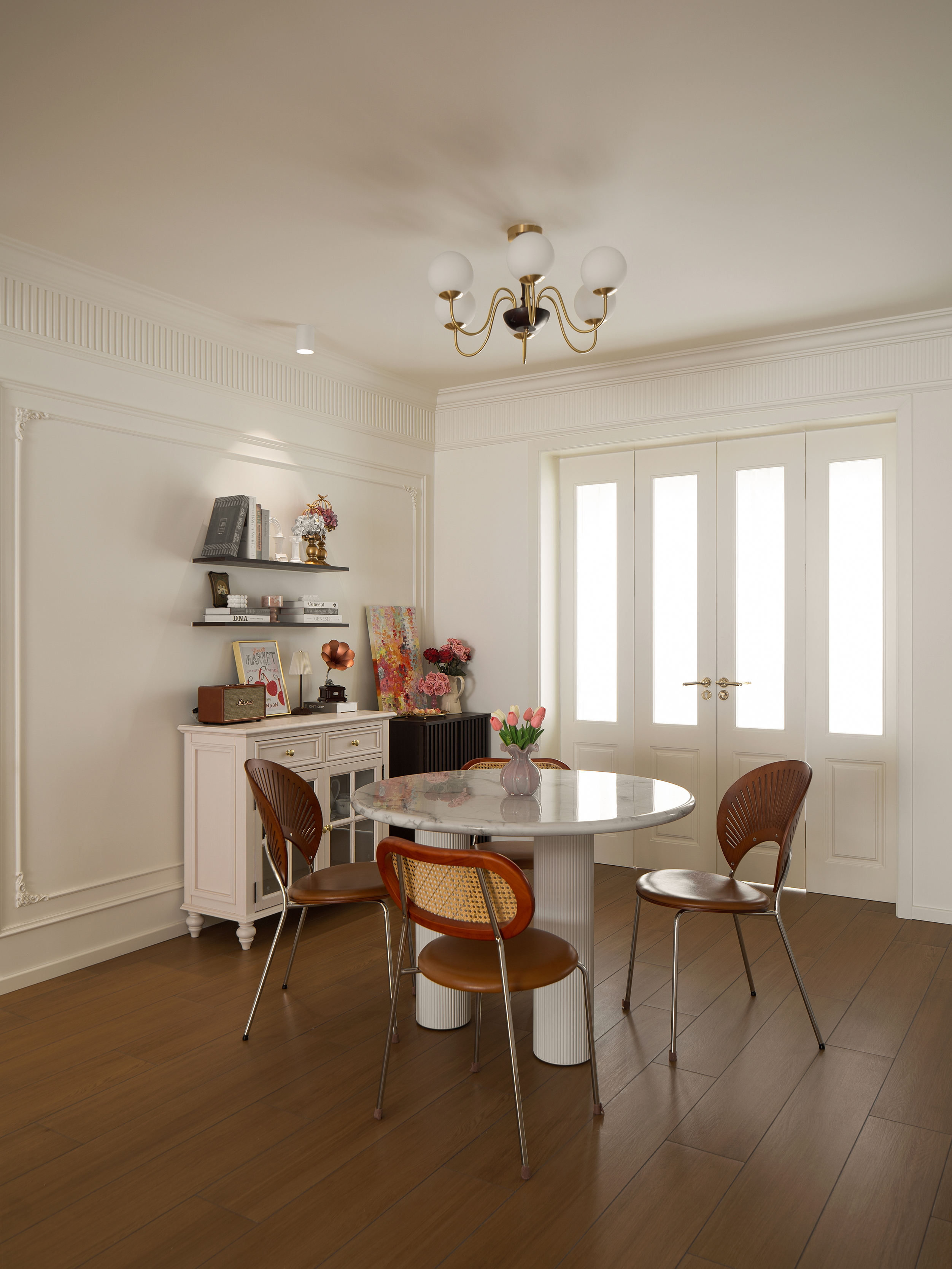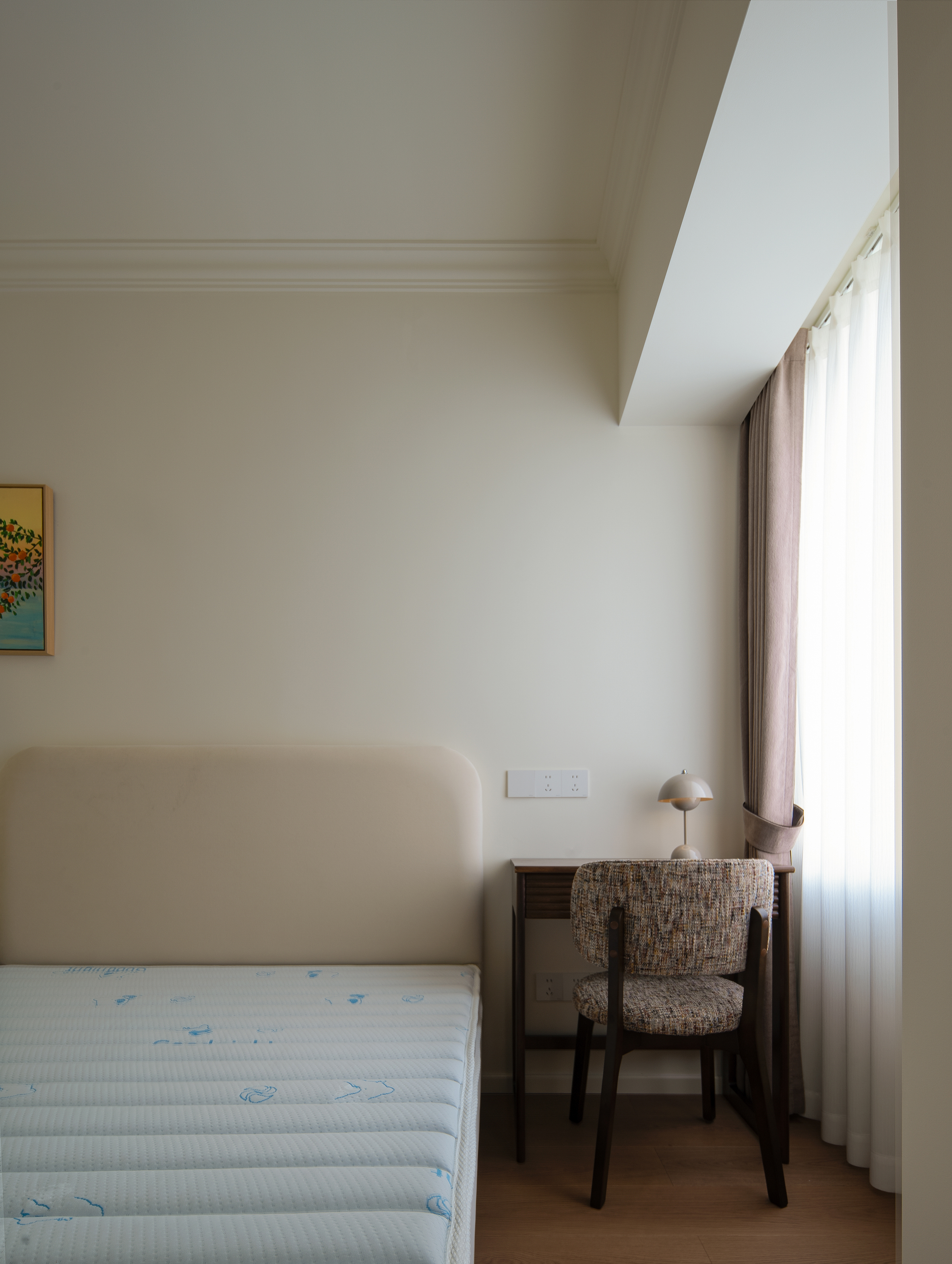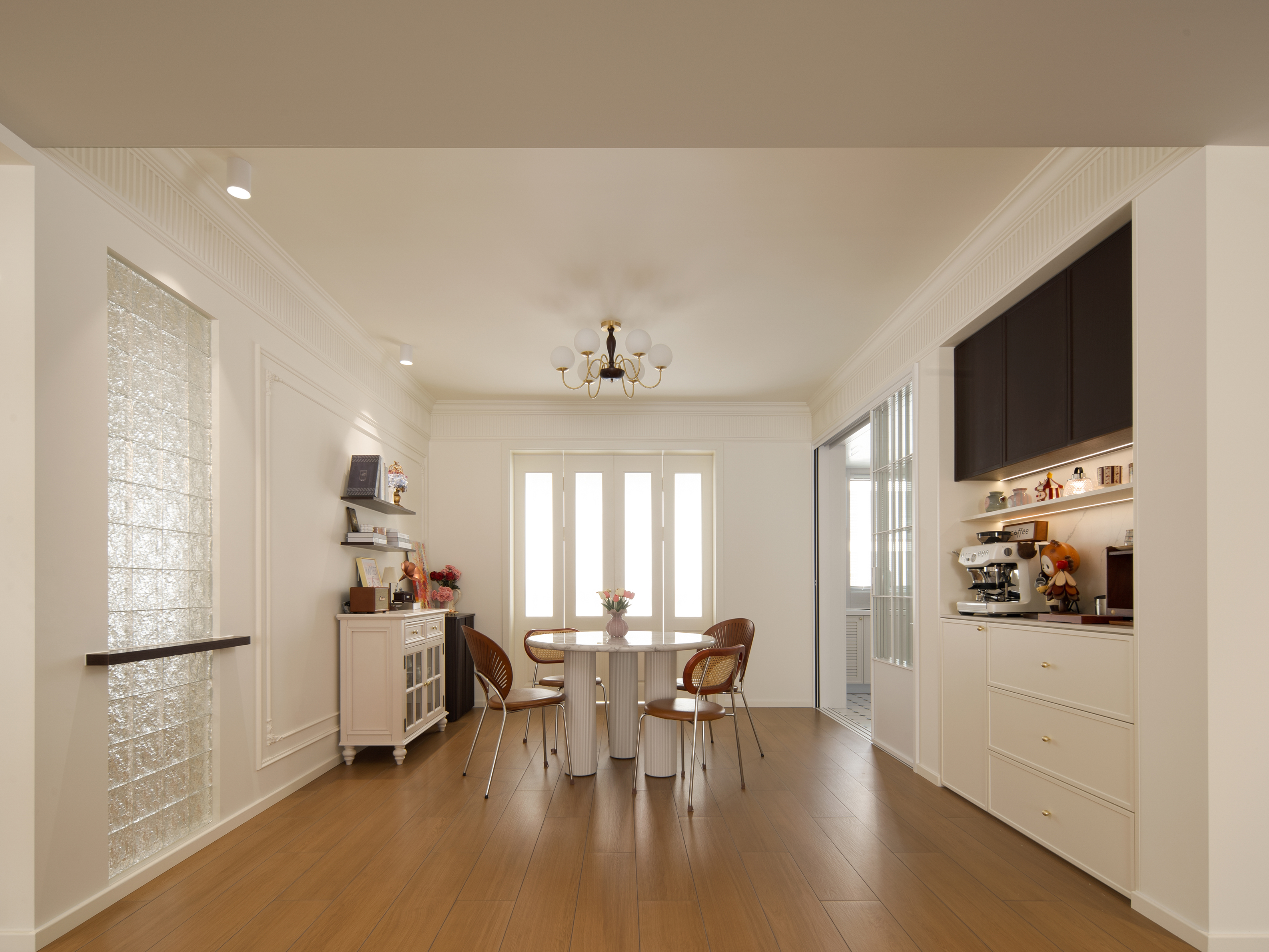 以奶油白叠加杏仁粉构成空间底色,营造温暖、包裹的基调。通过胡桃木的沉稳、亚麻的肌理、藤编的通透,构建出丰富而统一的材质层次,在复古氛围中强调自然与亲切感。