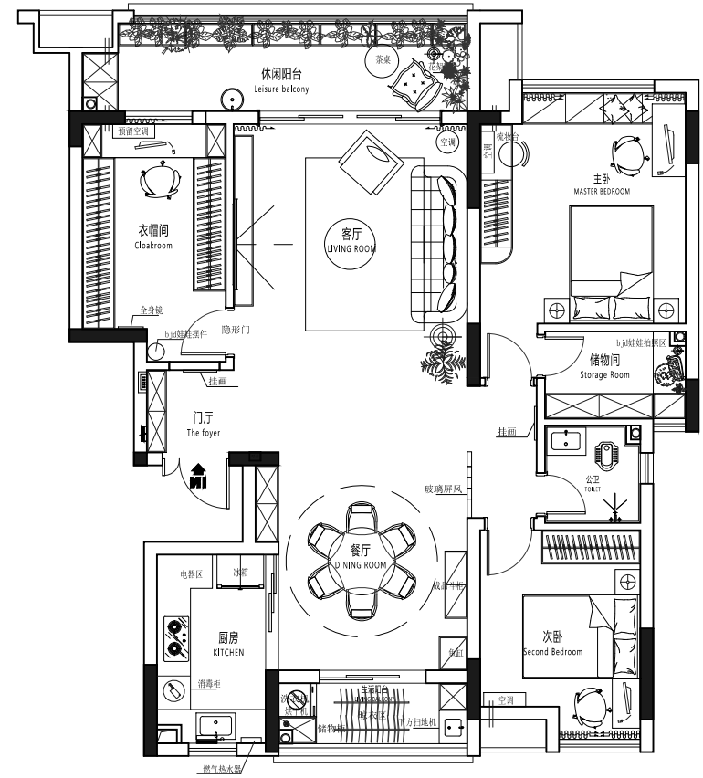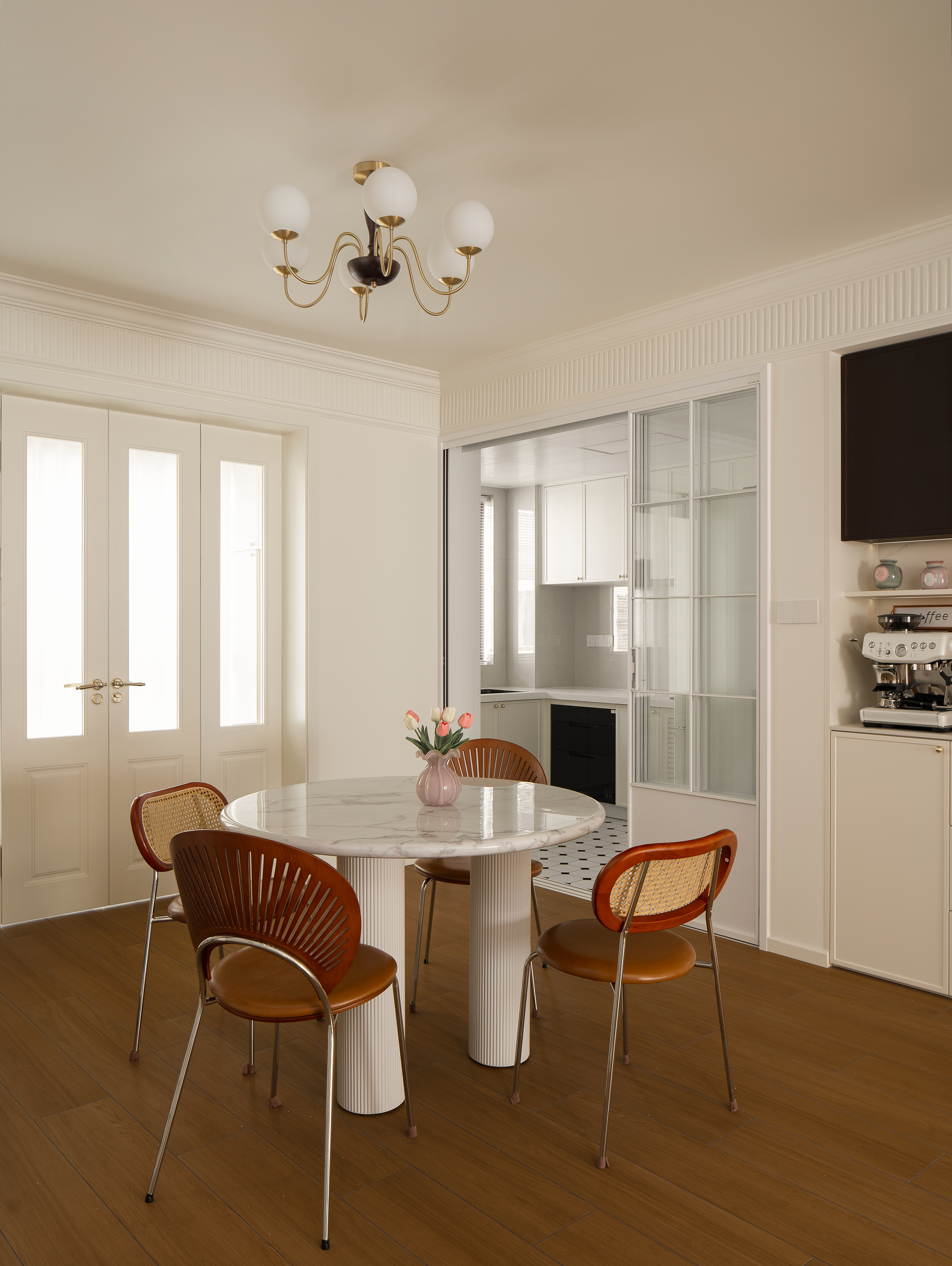 阳台花园与藤编元素,成为主要的自然光过滤器与情绪启动器。早晨的阳光经由植物的梳理,变为斑驳柔和的漫反射光,成为空间最宝贵的动态装饰。 -