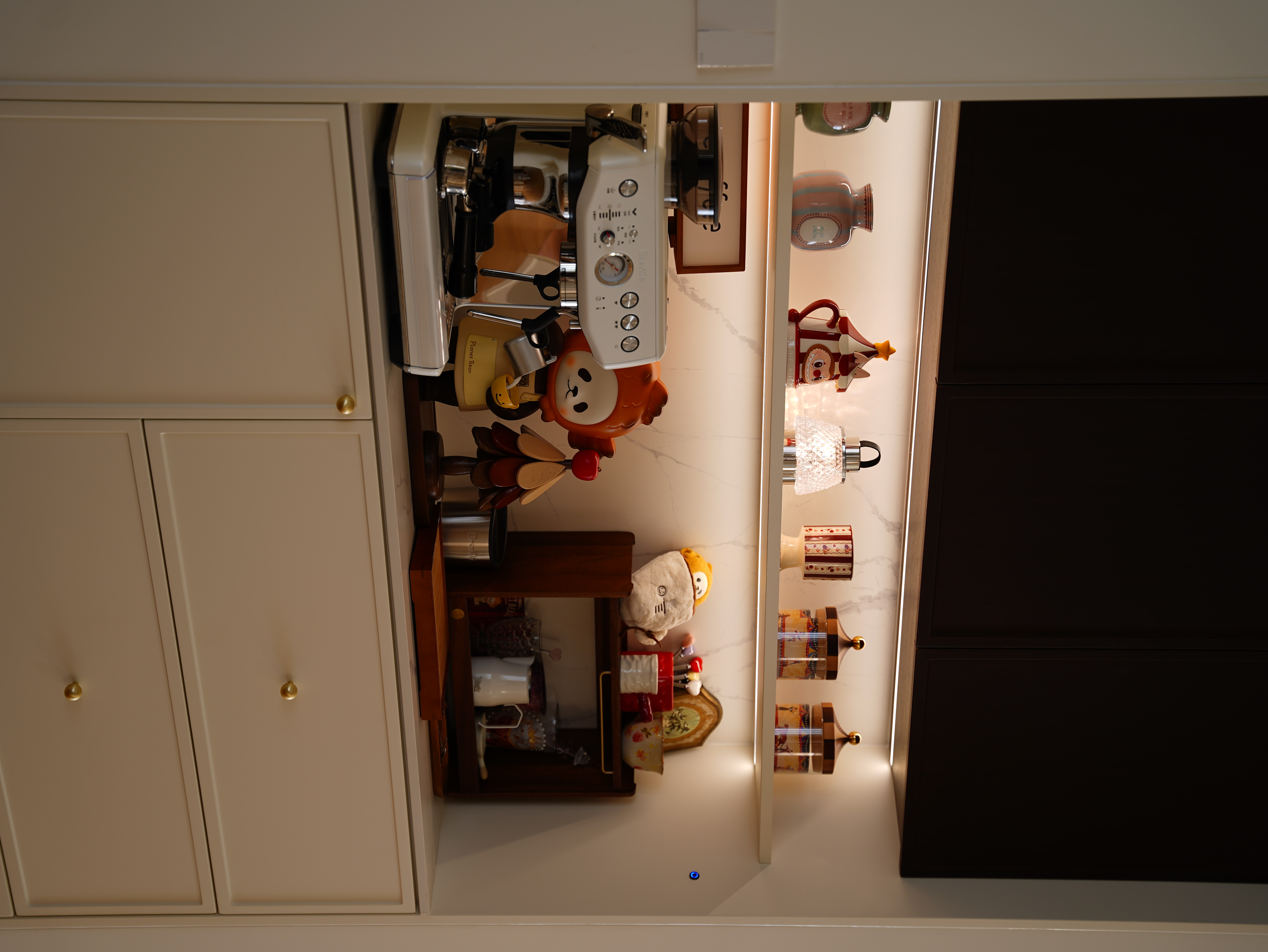 空间布局:将主卫改造为 “手办藏品室” ,这一大胆举措不仅极大提升了空间利用与个性表达,更形成了公共区的复古柔情与私藏区的现代热血之间的戏剧性对话,完整了居住者的人格画像。