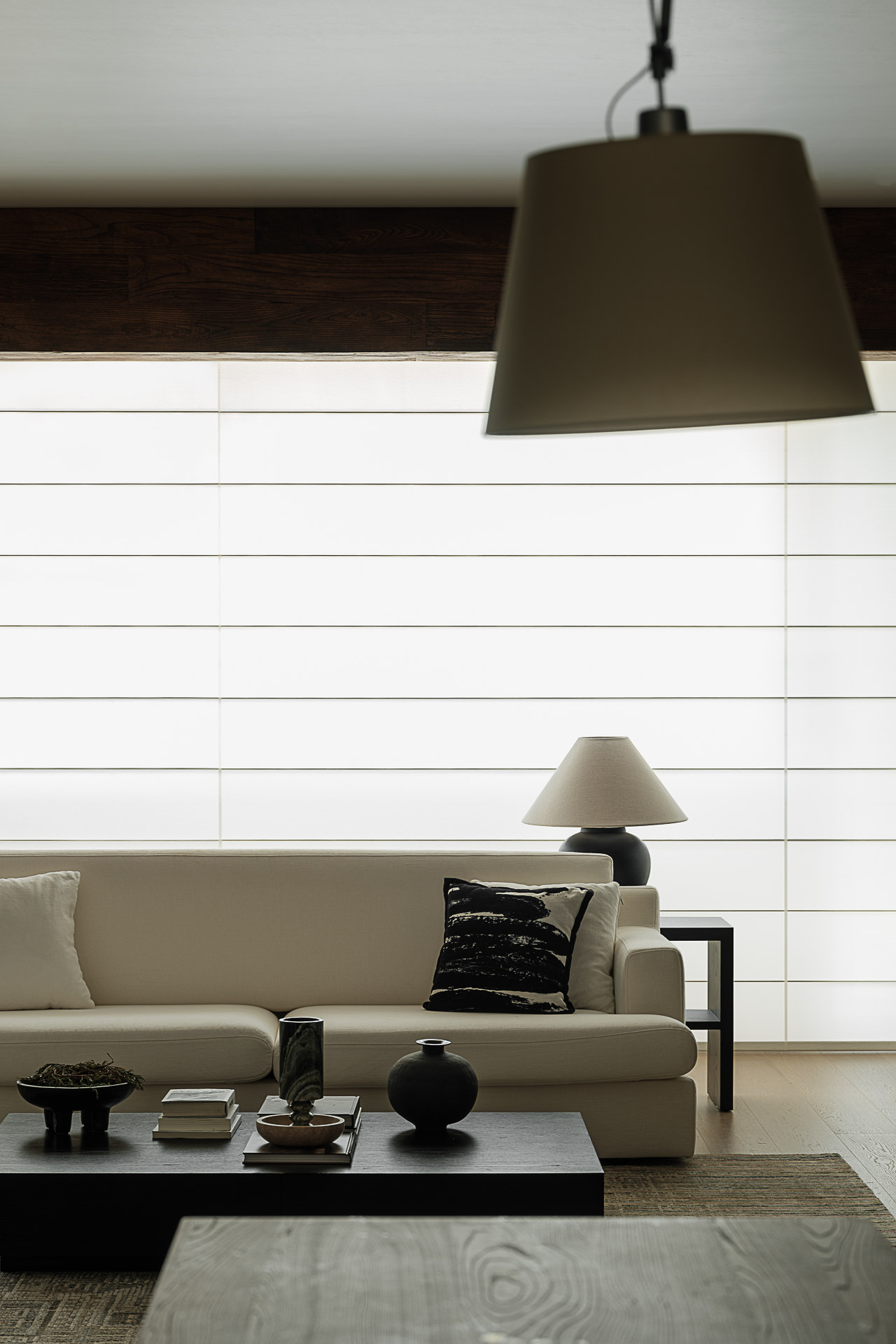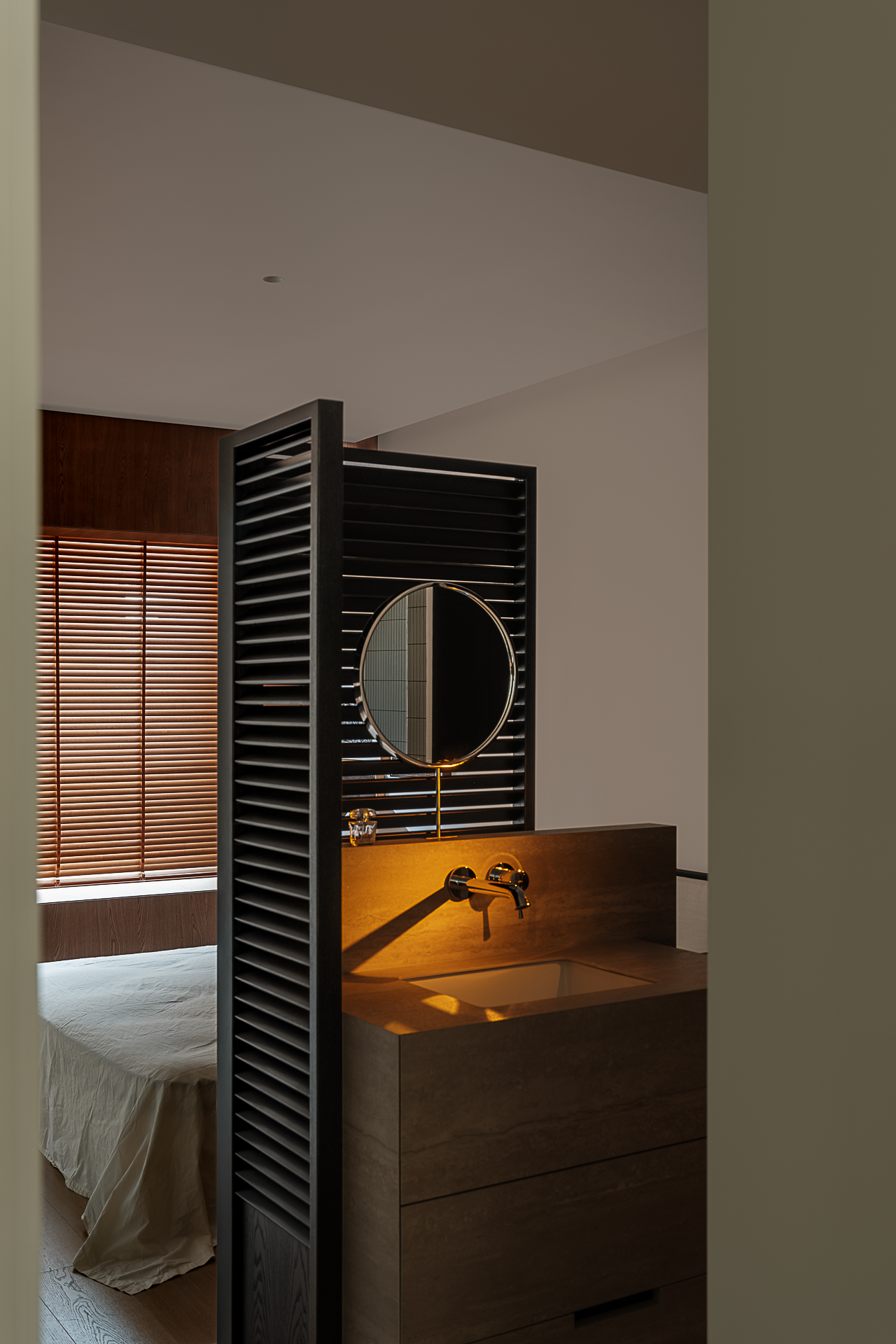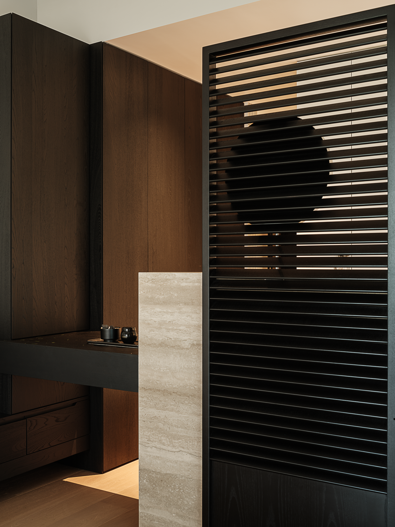 设计选材:老木、洞石等天然材质的肌理,构成了空间的拙朴底色与呼吸感;木质百叶则进一步柔化了光影。大面积的留白、拒绝无意义的堆砌,也是对自然质感的回归。