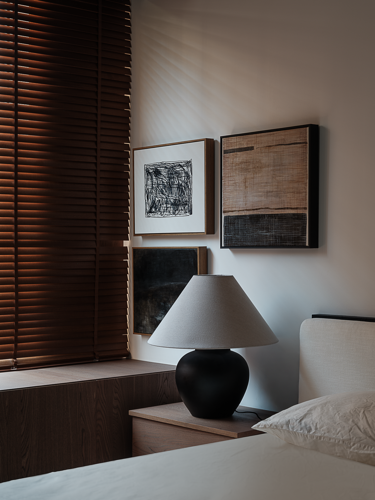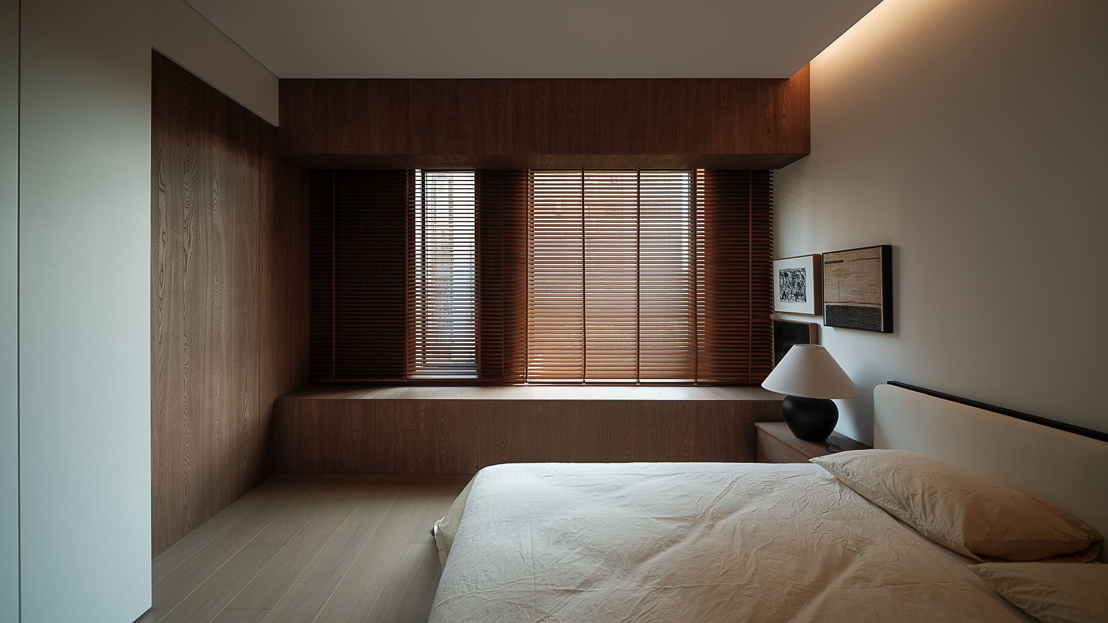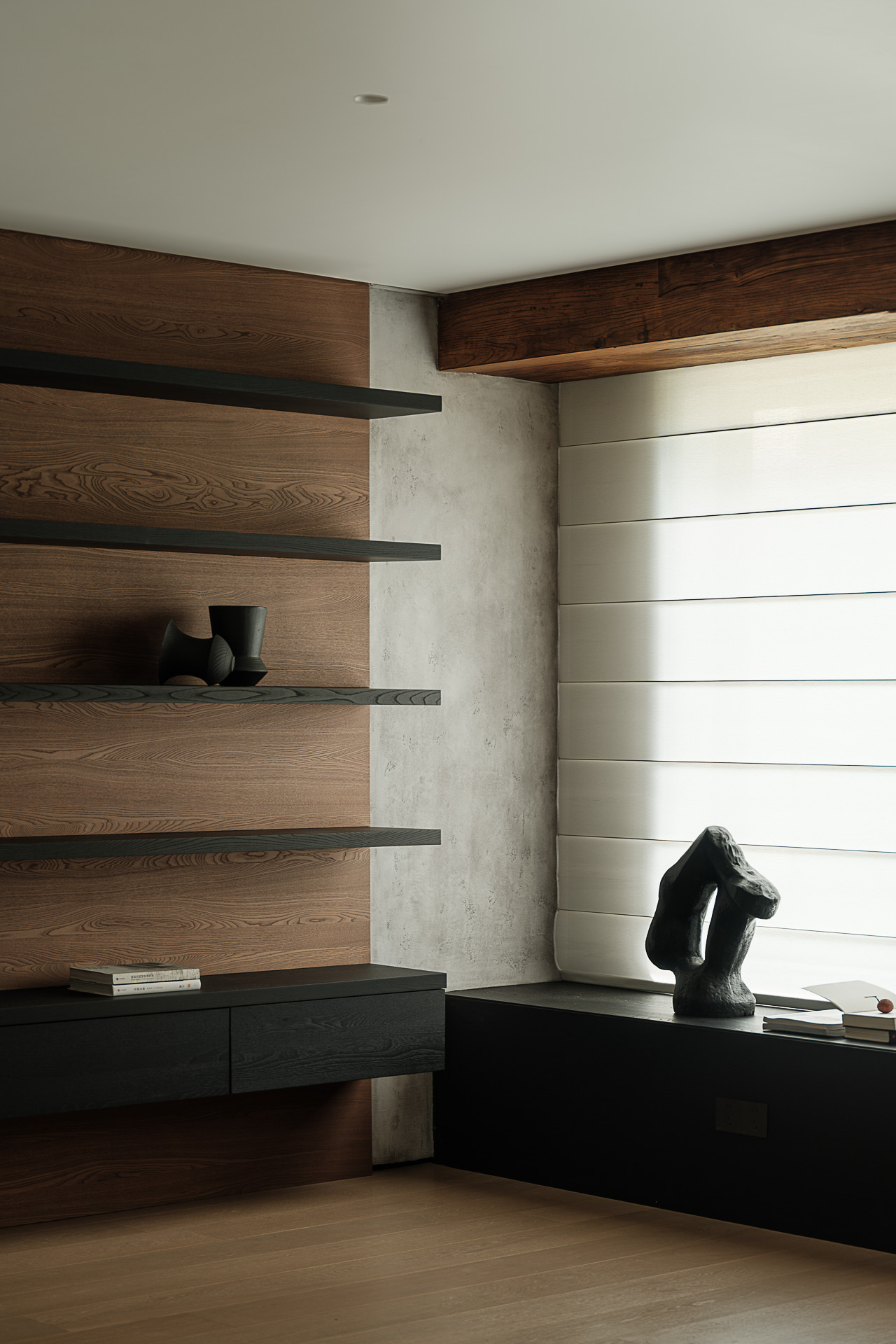 设计选材:老木、洞石等天然材质的肌理,构成了空间的拙朴底色与呼吸感;木质百叶则进一步柔化了光影。大面积的留白、拒绝无意义的堆砌,也是对自然质感的回归。