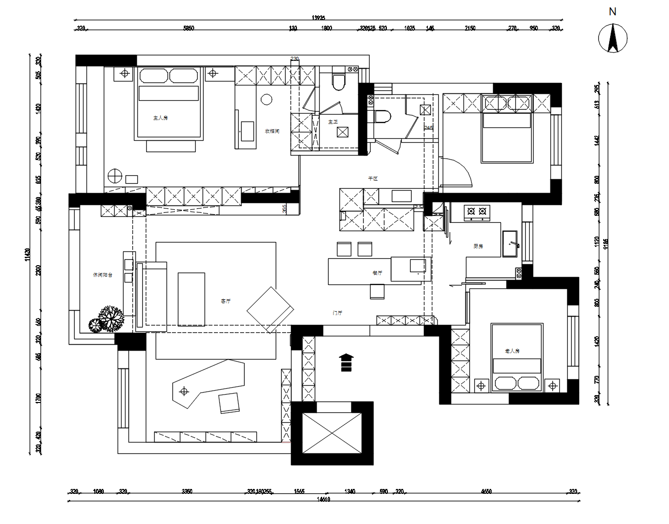 空间布局:我们重新规划空间关系:释放阳台融入客厅,最大化景观视野与公区尺度;将洗衣房高效集约于卫生间过道,实现彻底的动静分区。主卧套间借鉴酒店式布局逻辑,营造私密、舒缓的休憩之境。