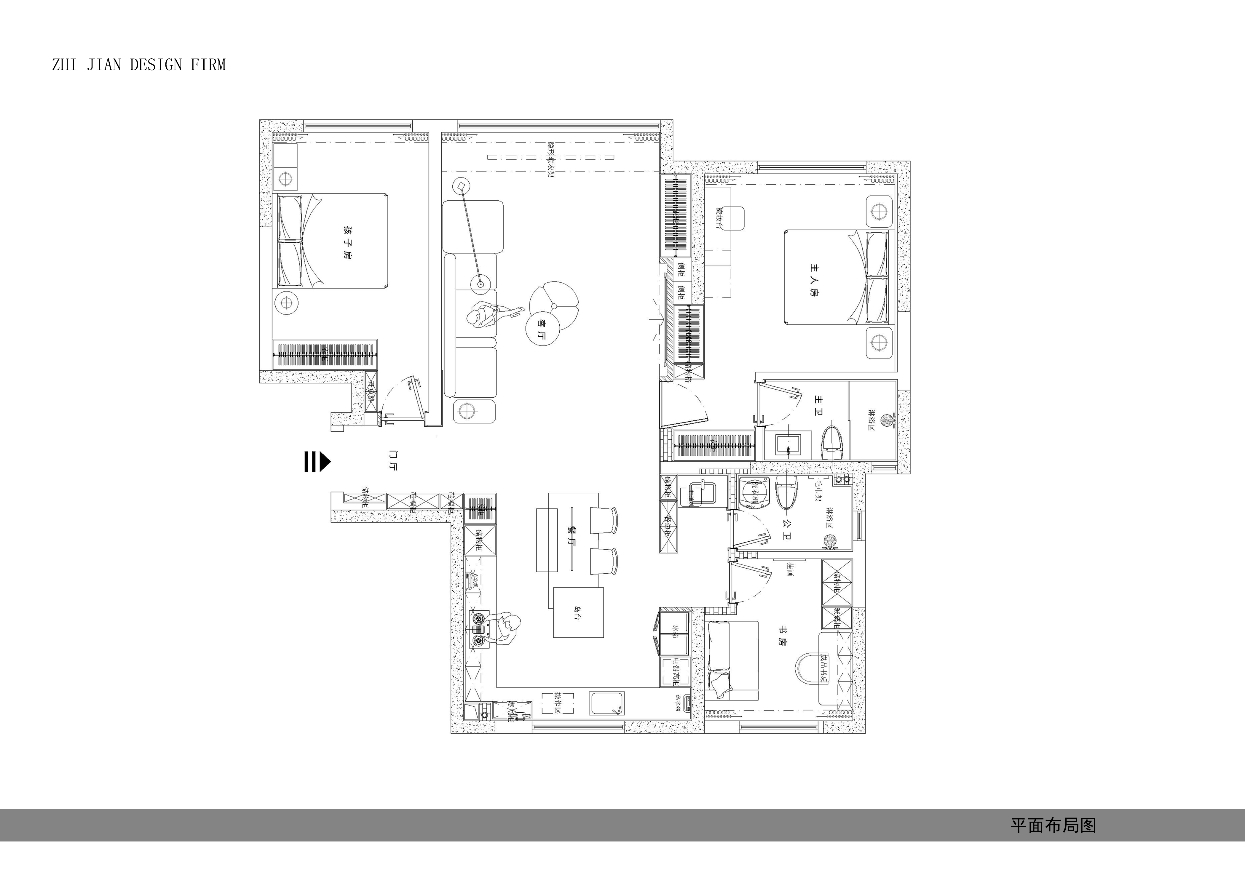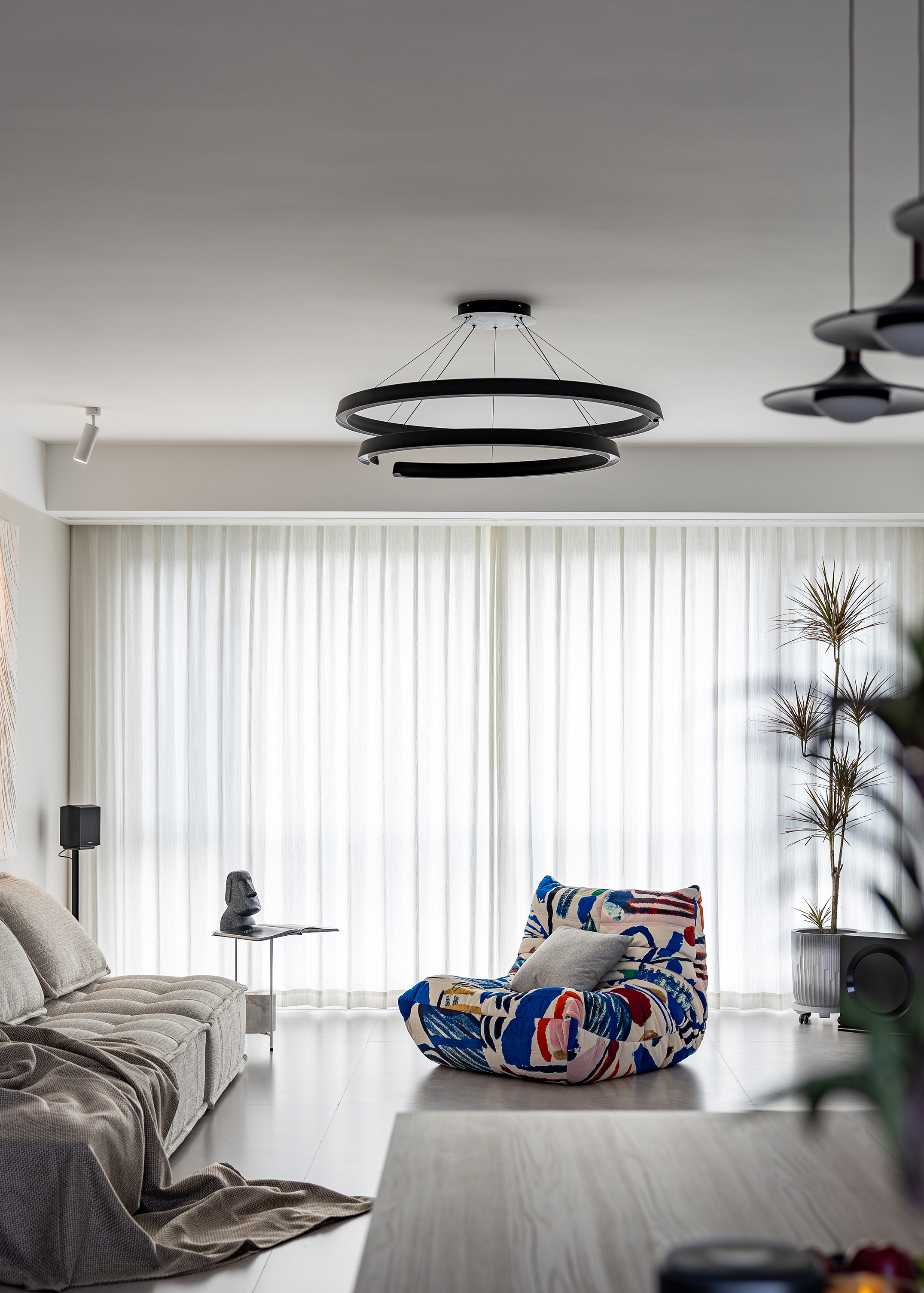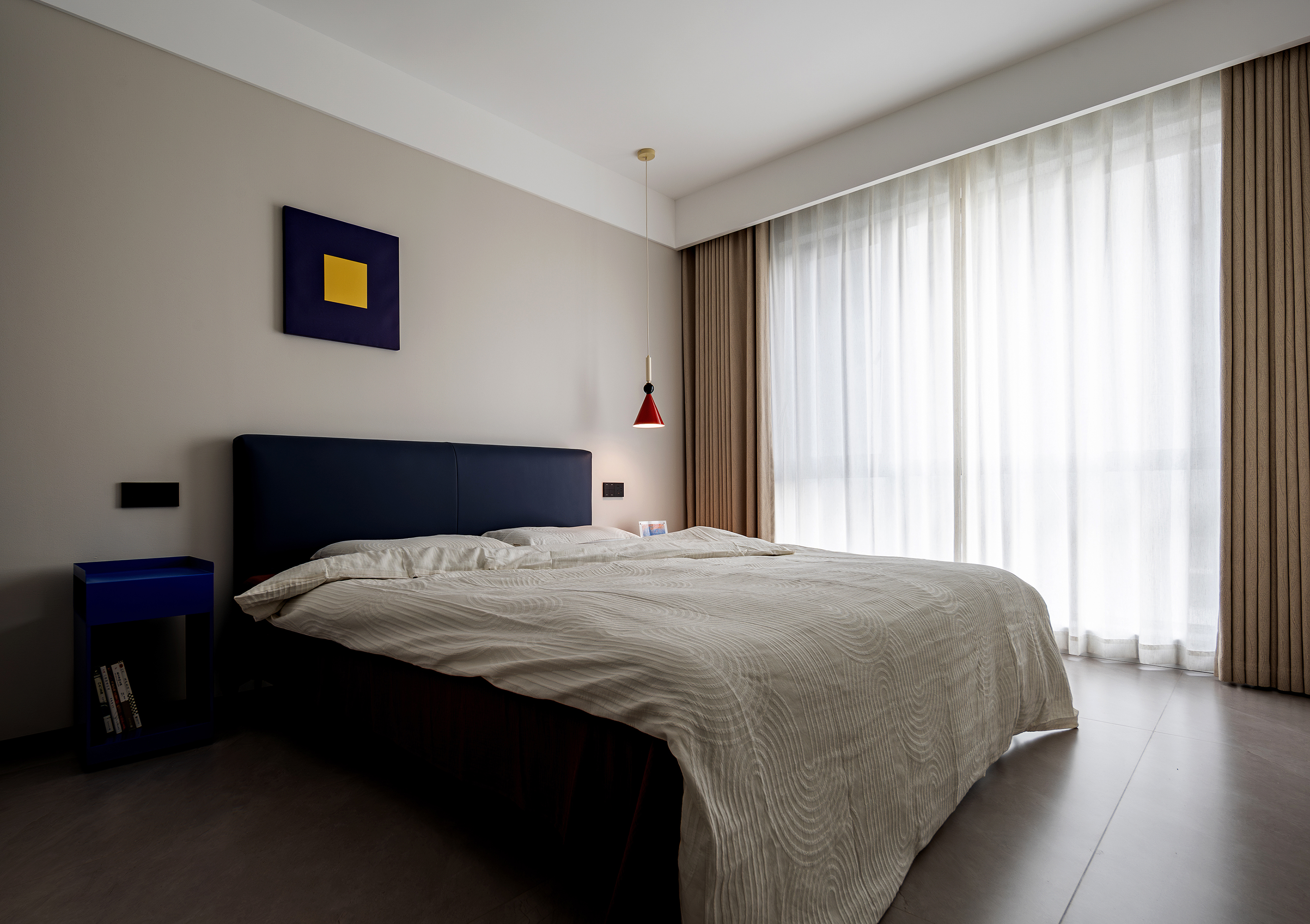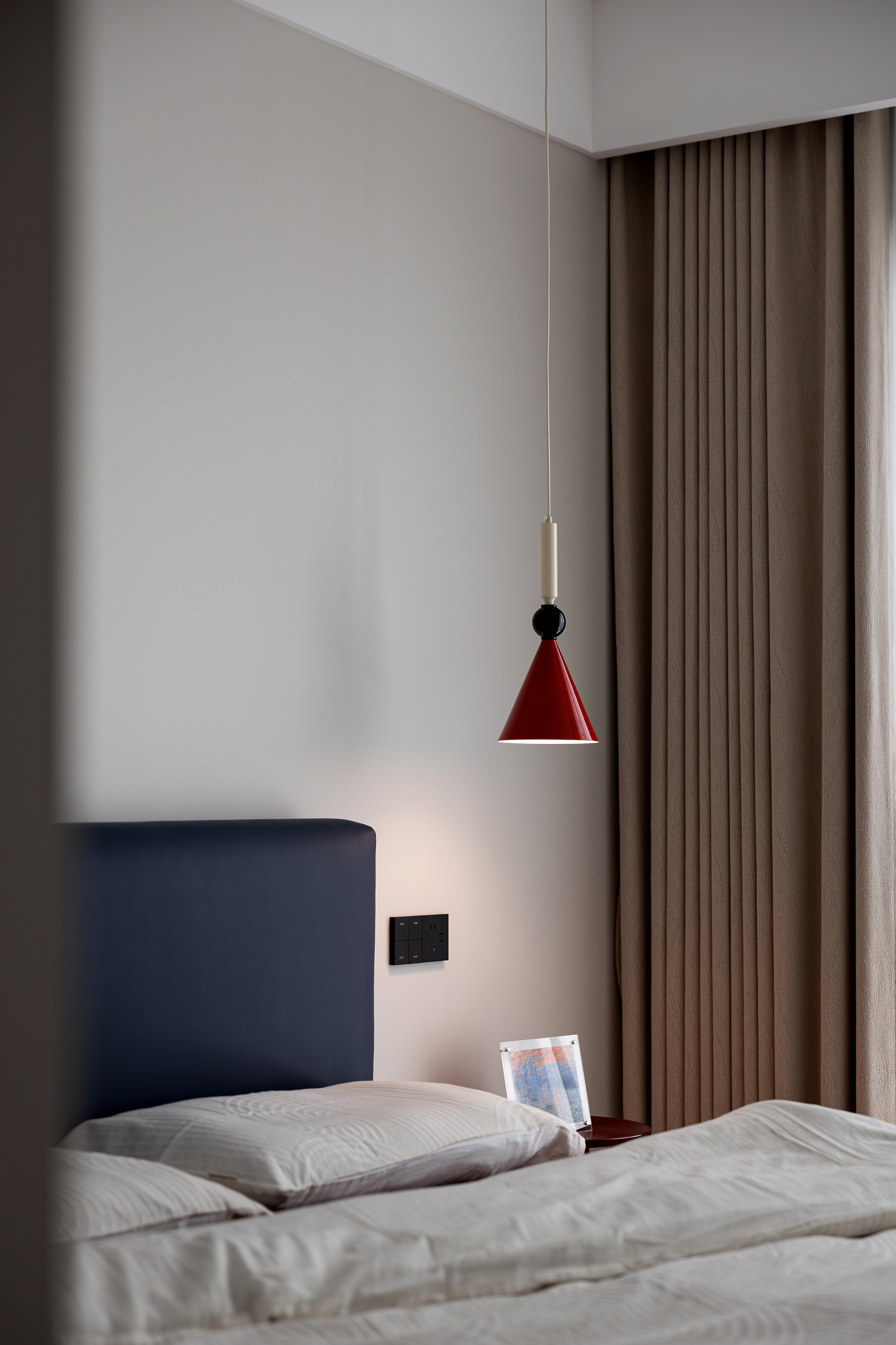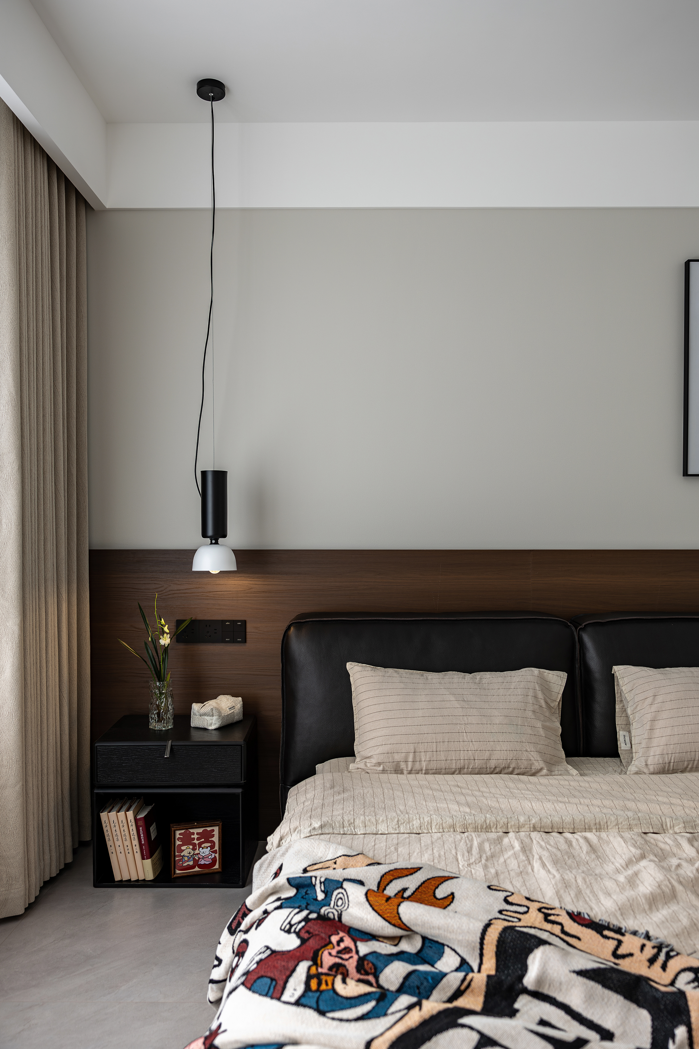 空间布局:共区域采用开放式布局,客厅吊灯与明装射灯灯实现层次照明。浅灰色布艺沙发与木质格栅背景墙形成材质对话,抽象装饰画与摩艾石像摆件增添艺术趣味。餐厨区延续极简语言,白色橱柜与深灰台面的对比中,暗藏无线充电模块与隐藏式把手,将功能隐匿于美学之下。私密空间以克制的色彩碰撞激活情绪。儿童房深蓝色床头板与几何挂画形成视觉焦点,红色吊灯如点睛之笔;主卧室则以胡桃木饰面与黑色皮质床头营造静谧感,卡通毛毯成为个性表达。
