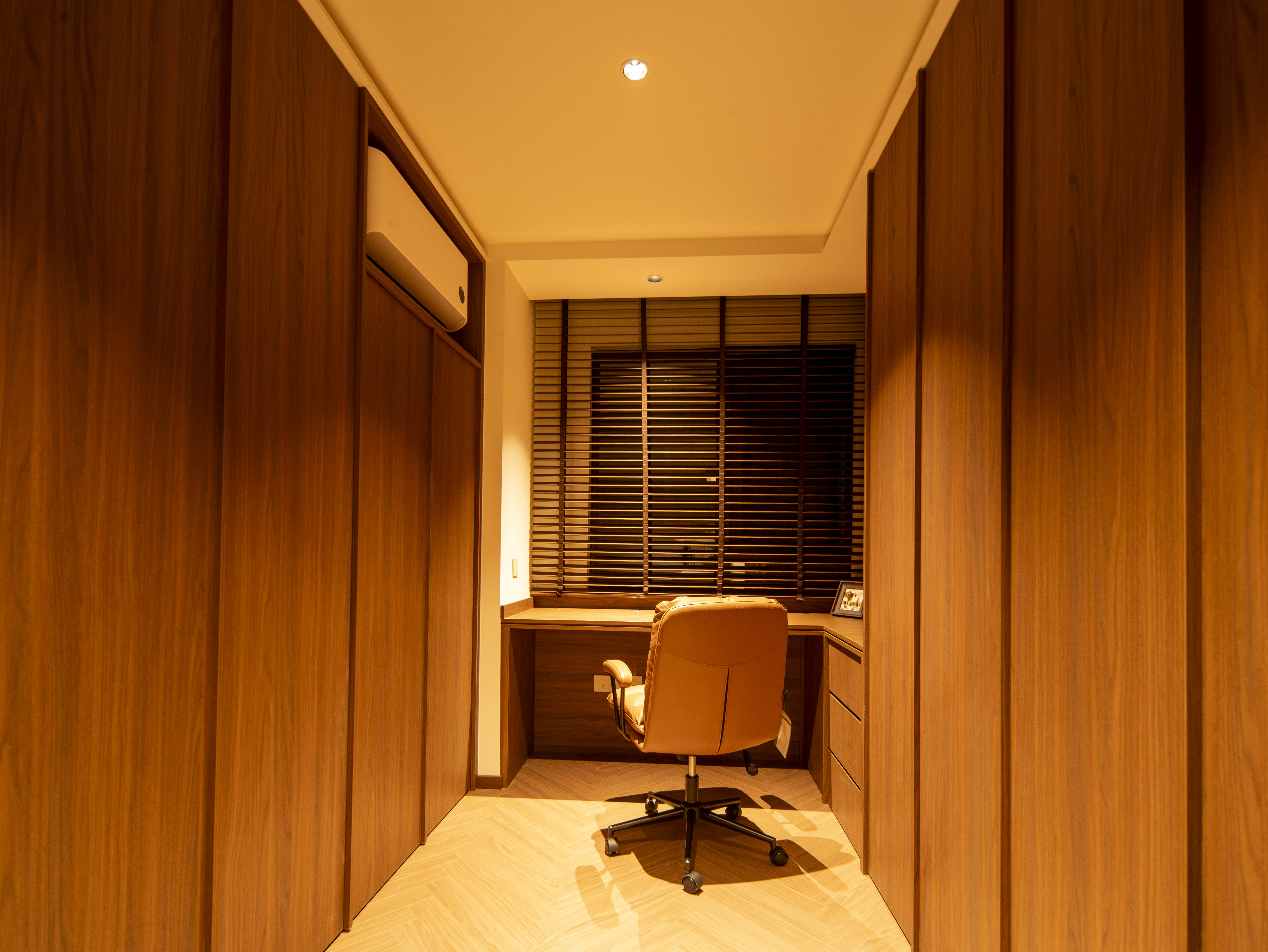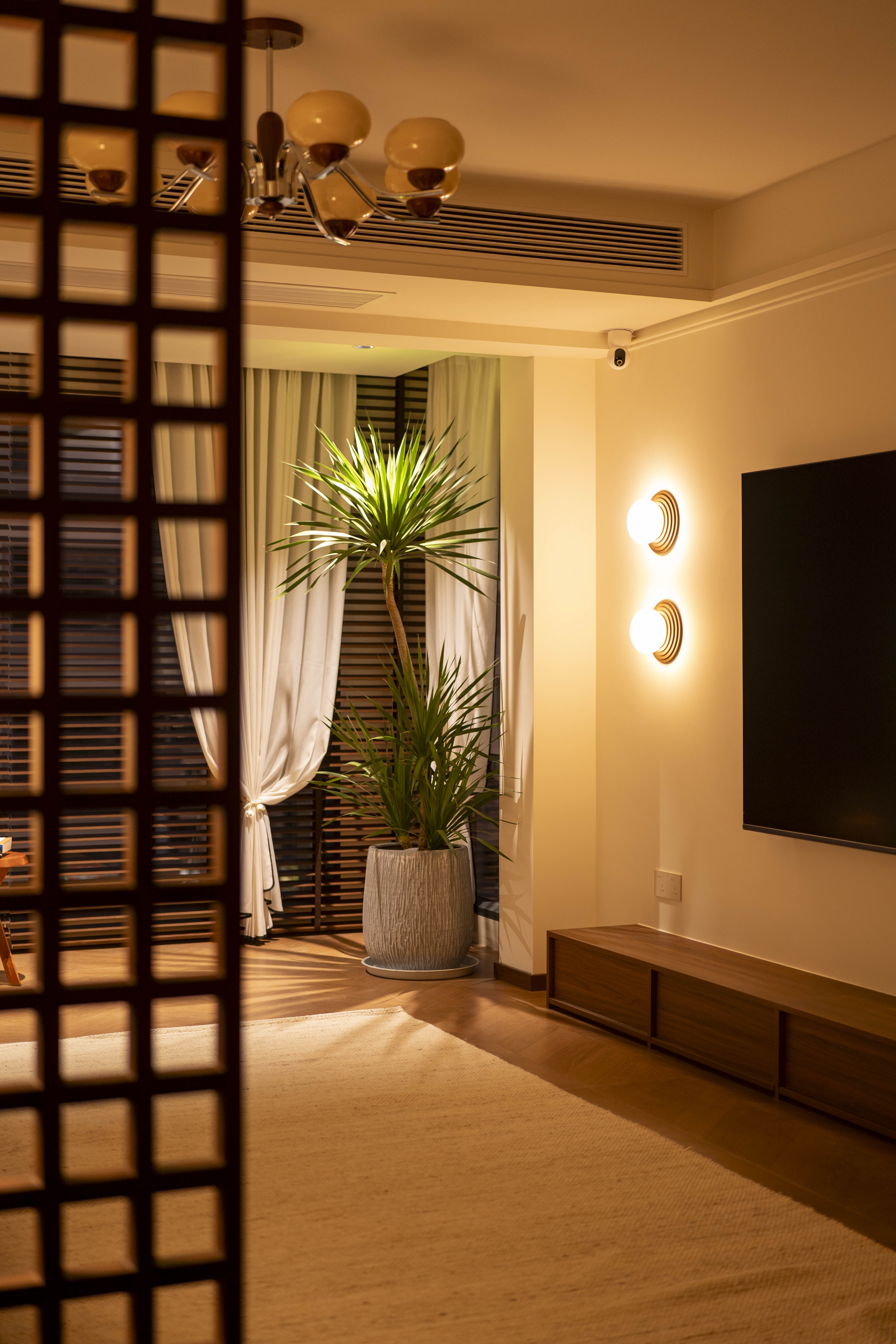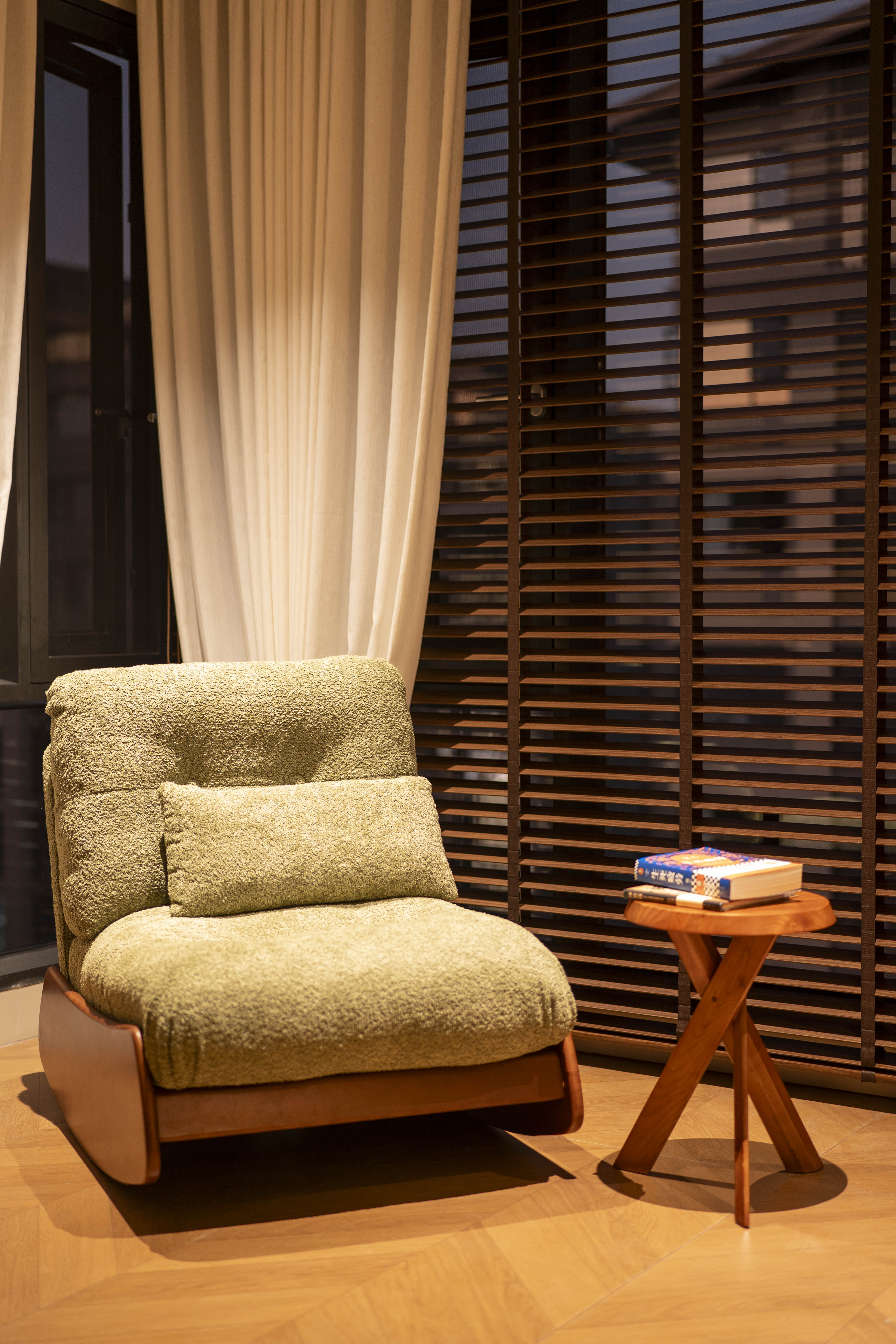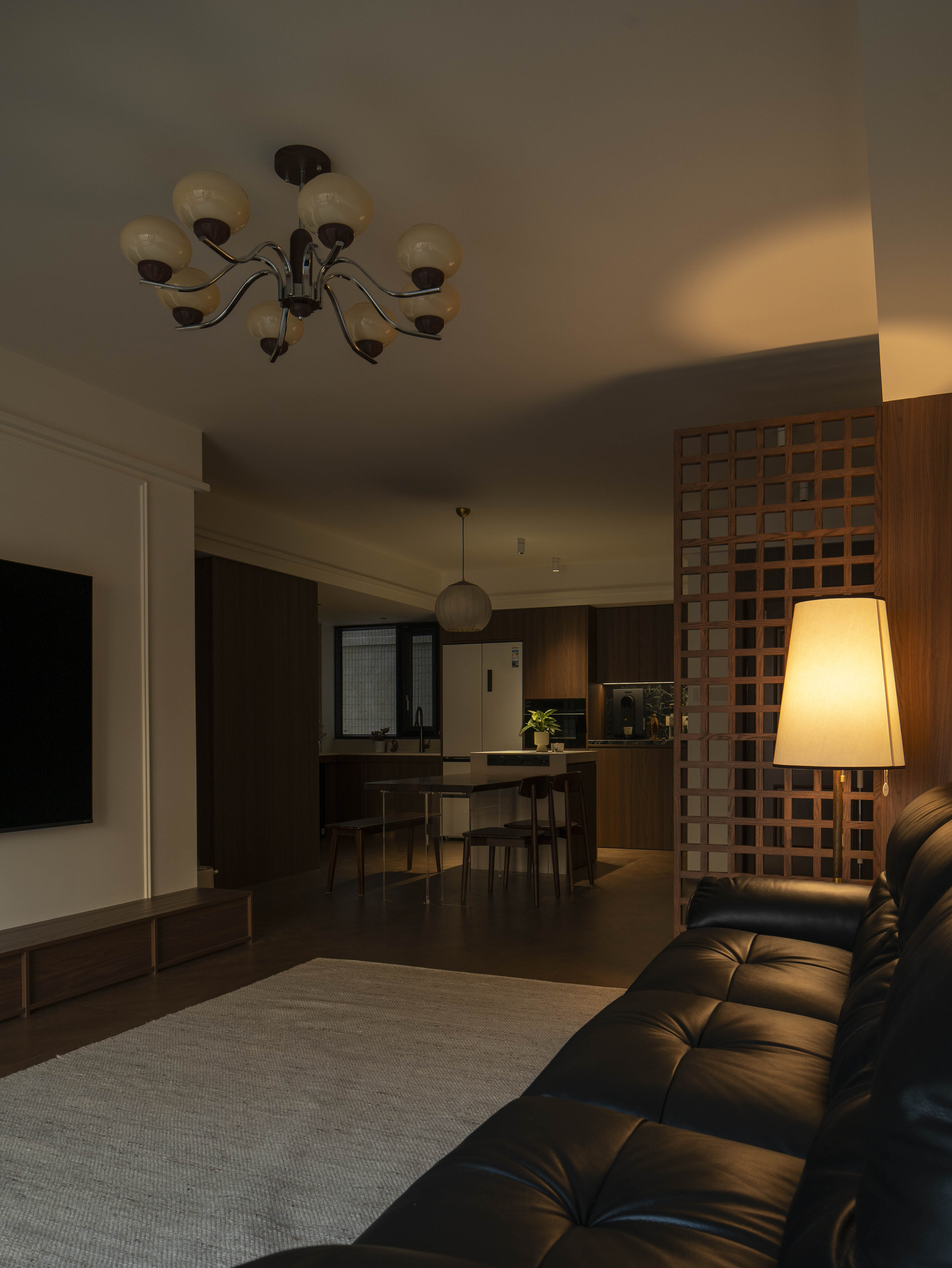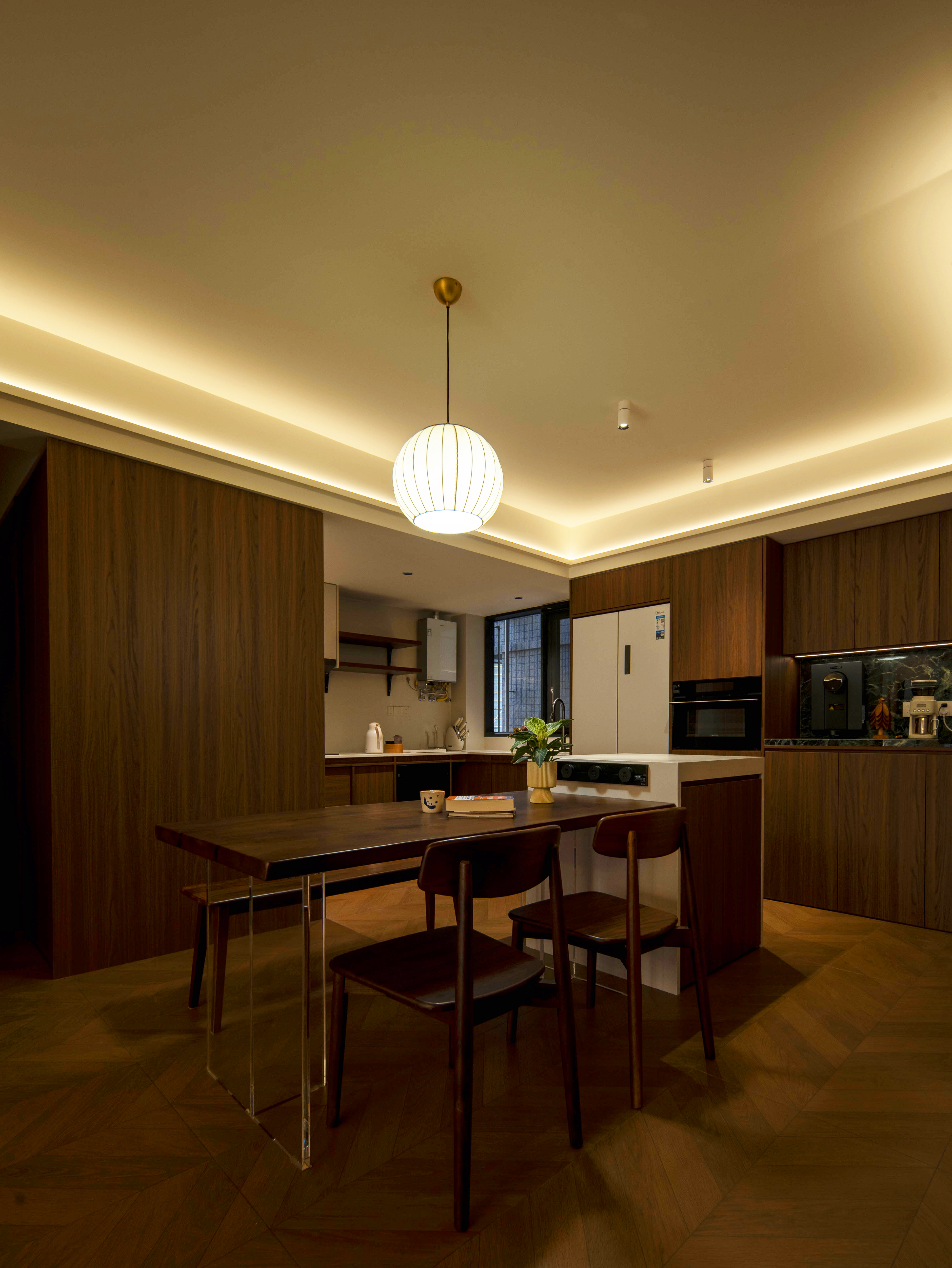 项目定位:本案空间主打中古风格,午后阳光穿过百叶窗,在胡桃木地板上投下长长的光影,以及整体暖色灯光,旨在重塑往昔岁月的迷人韵味,为居住者带来一场跨越时空的审美之旅,使其在快节奏现代生活中寻得一隅怀旧天地。