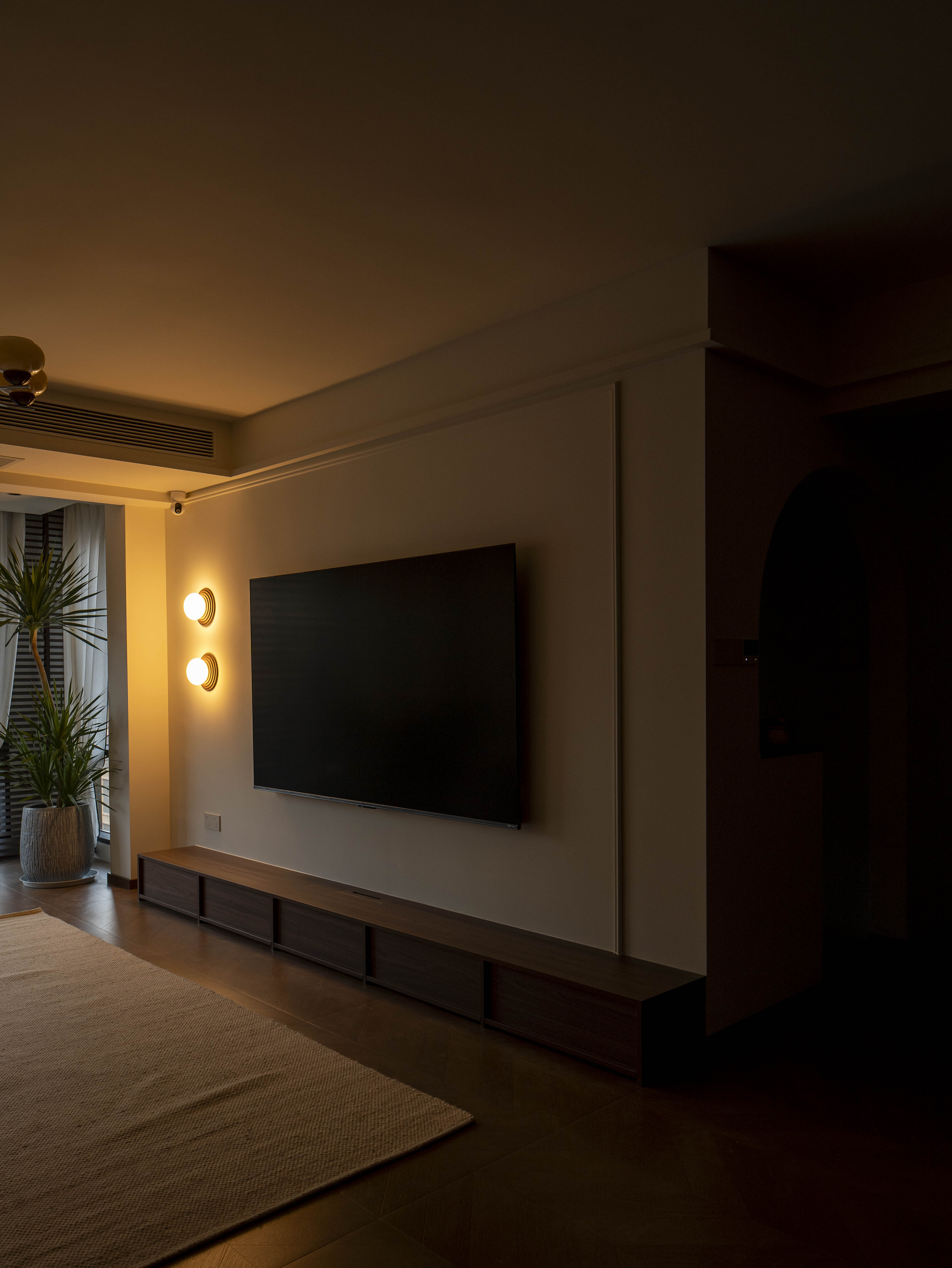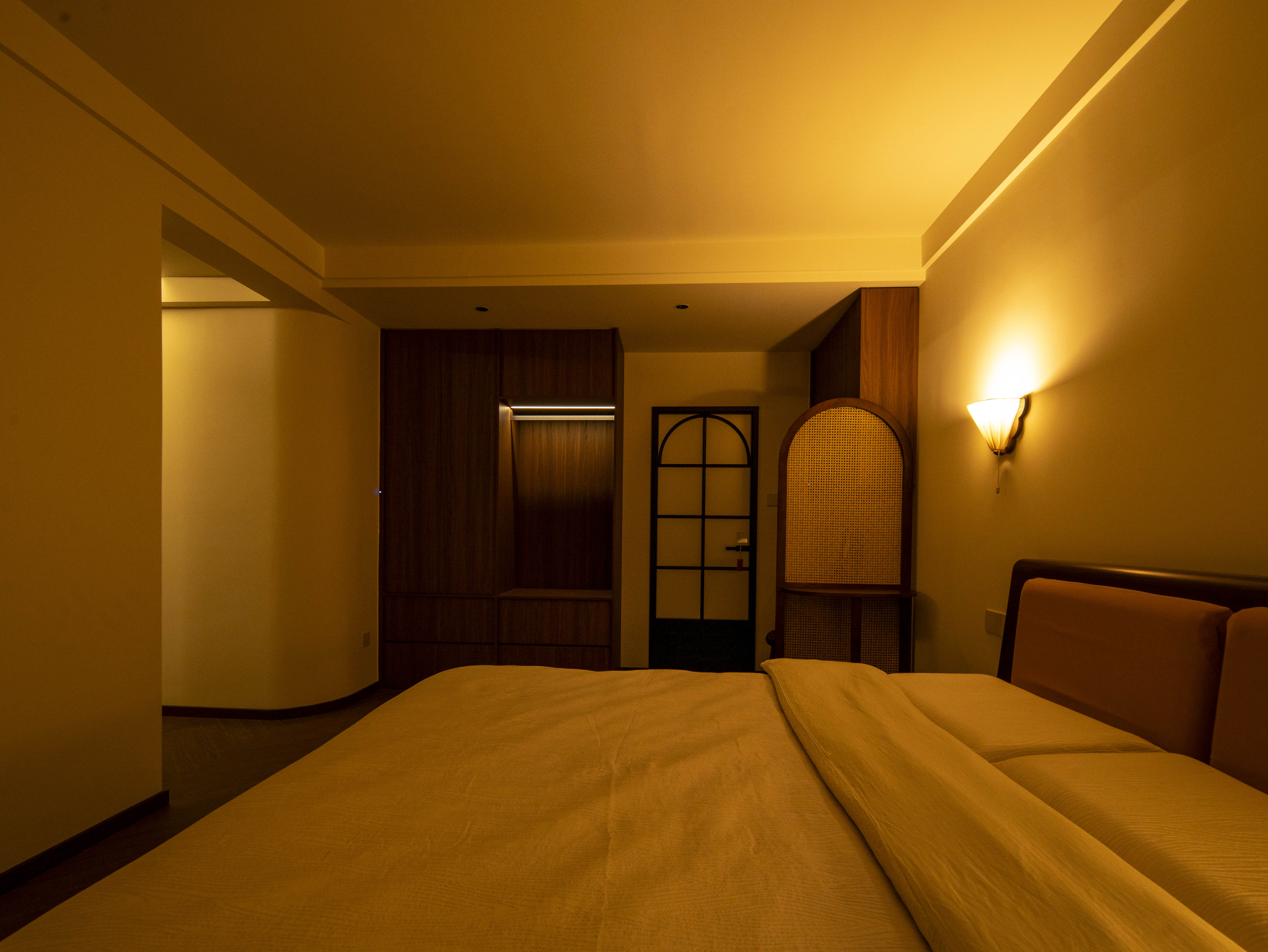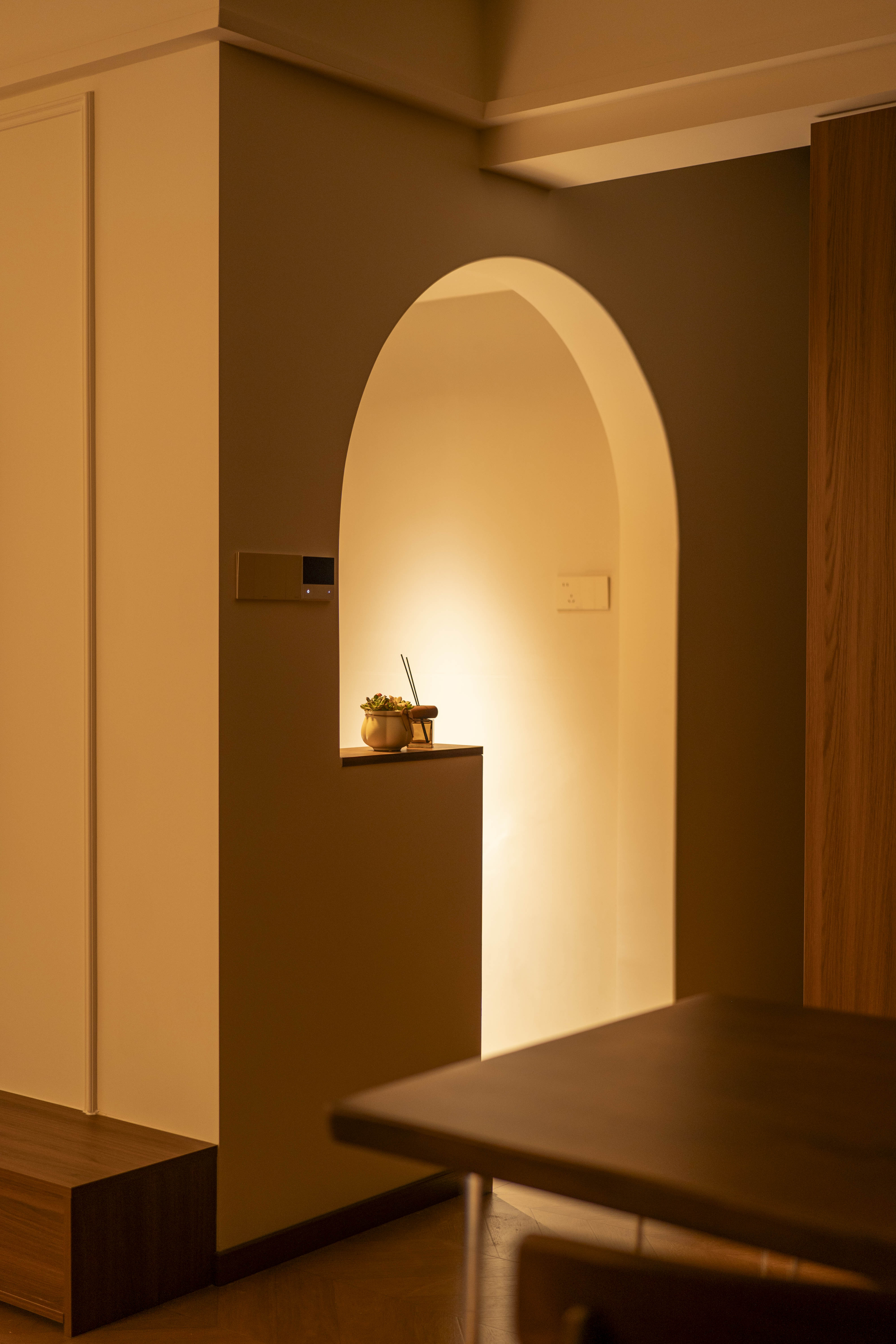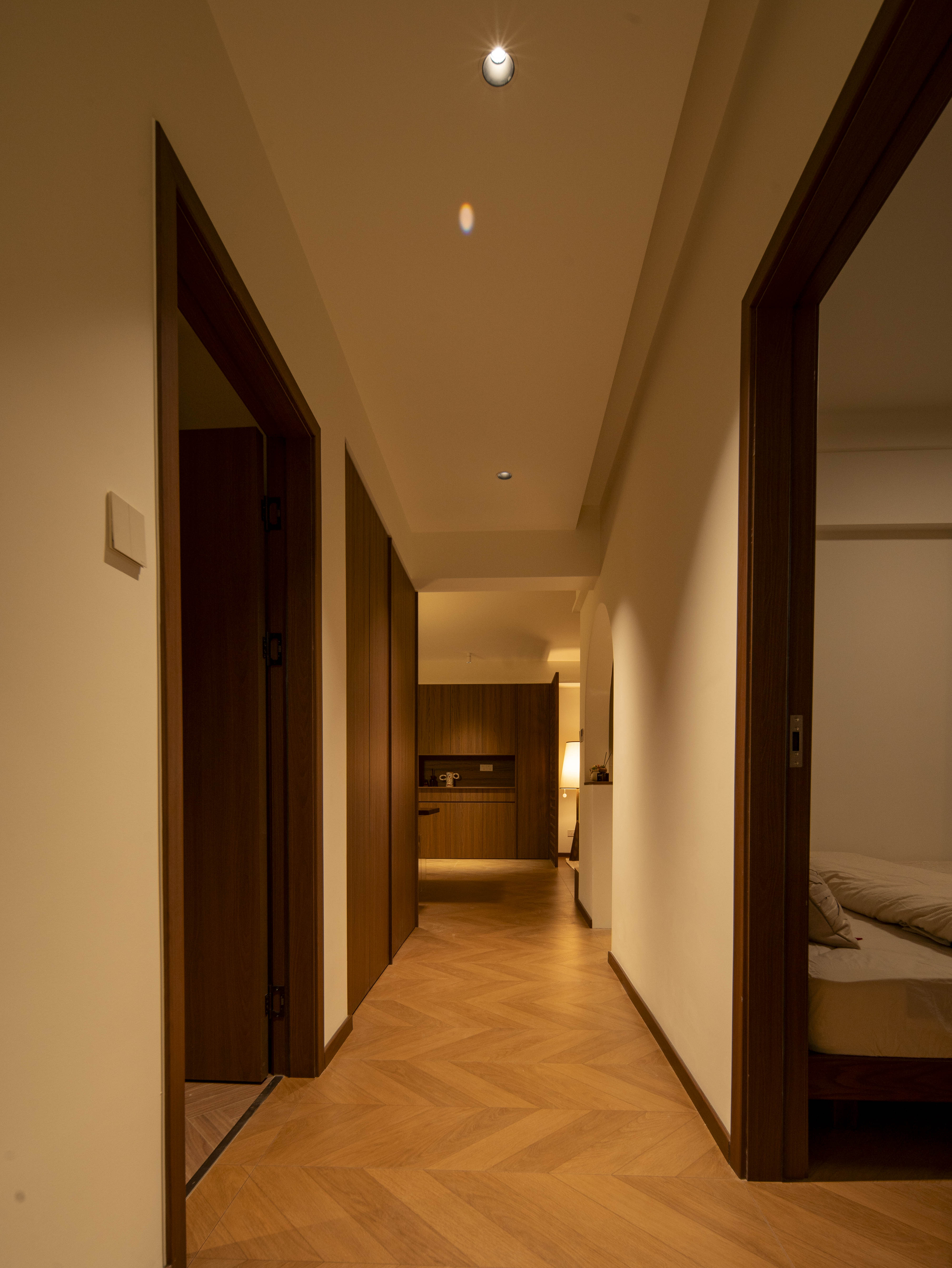 走廊尽头弧形设计,与主卧墙体结合,弧形墙角弱化了尖锐墙角对床的不适感。 -