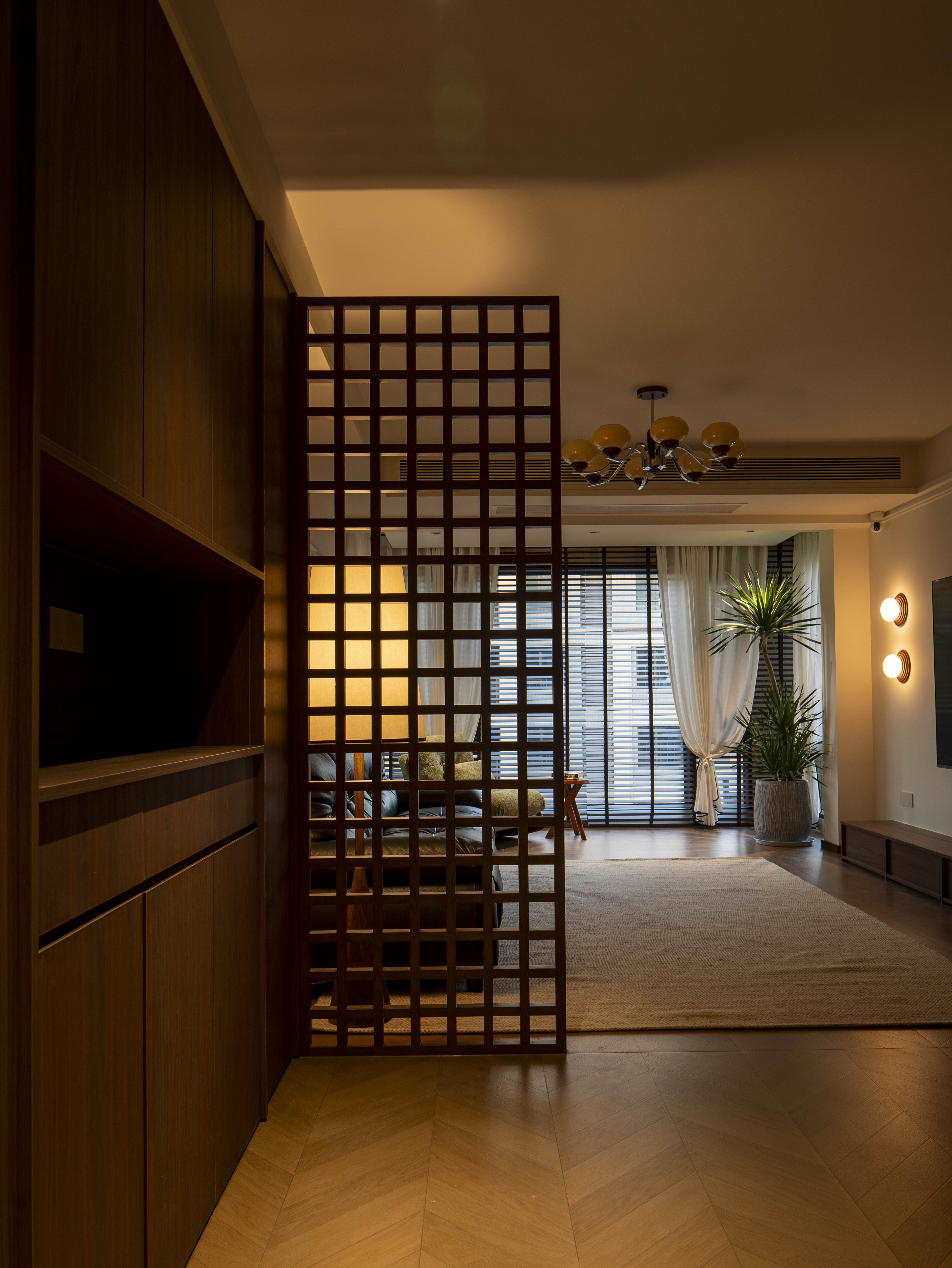 空间意境:入户换鞋区半透玄关,屏风材质上与鞋柜的材质形成一个整体,结构形式上划分了区域。