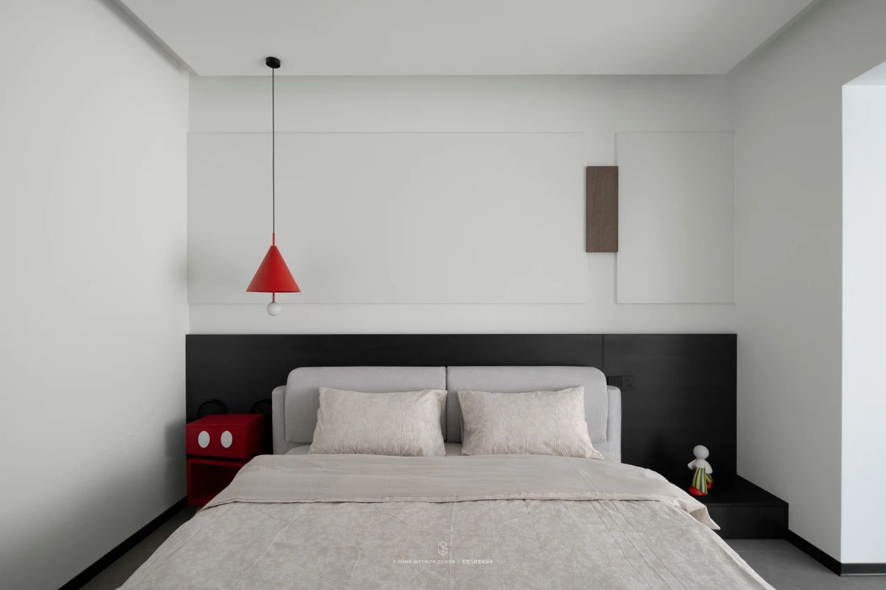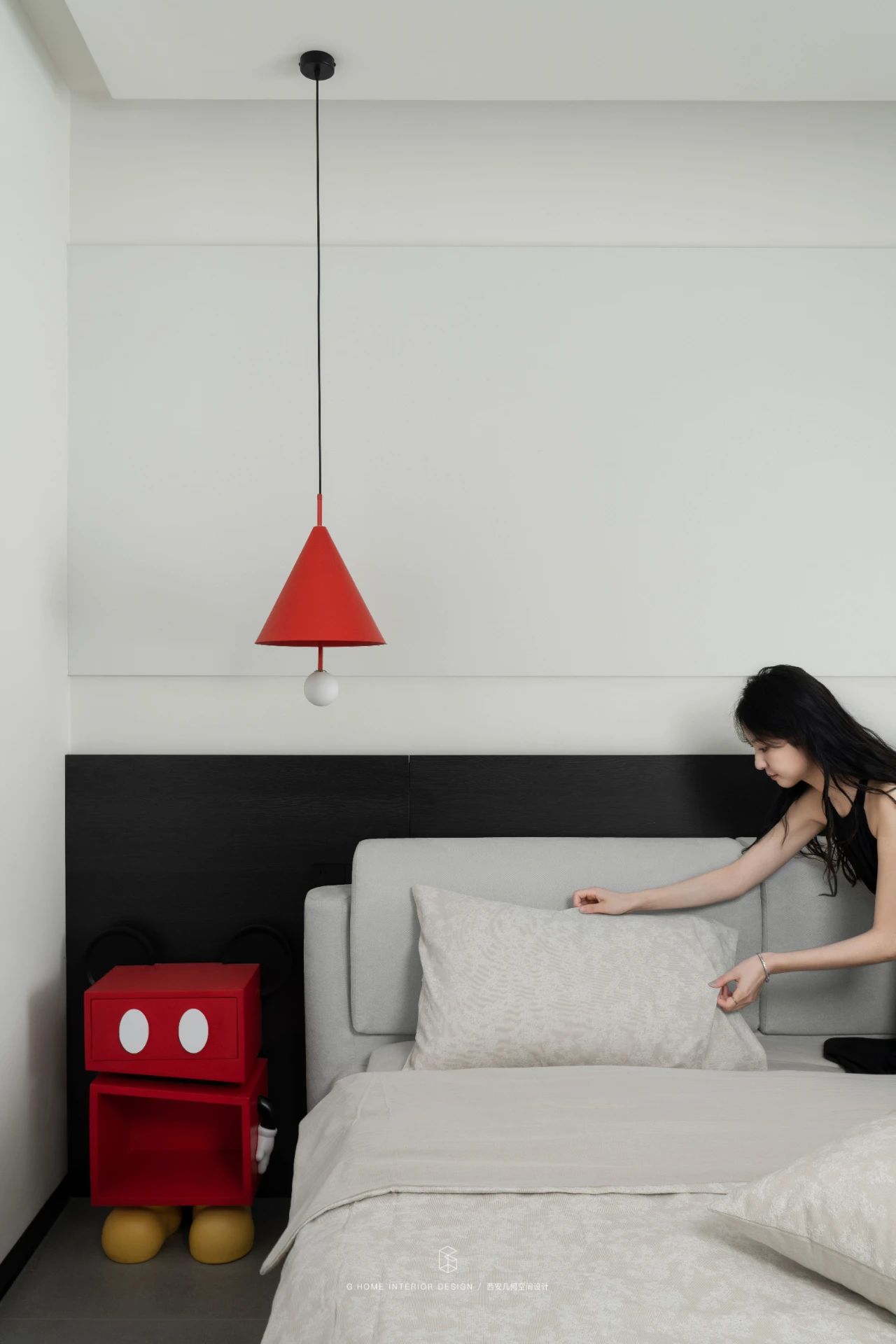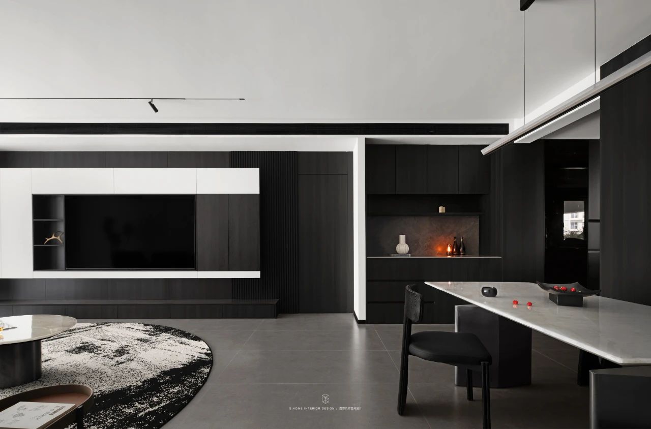 设计选材:客厅以黑白为主色调,搭配墨绿色沙发、红色装饰画;电视墙用定制柜+内嵌电视,沙发背景为石膏板造型+内嵌灯带;餐厨区选用深色木制元素与浅色石材;主卧用深色墙板+悬空衣柜,配置雾化壁炉;男孩房以黑白为主,红色点缀,搭配米奇收纳柜。