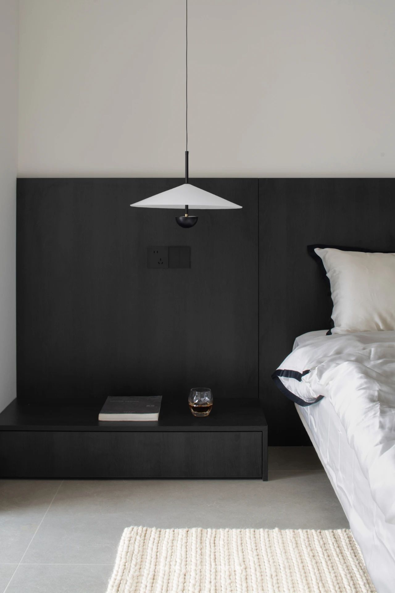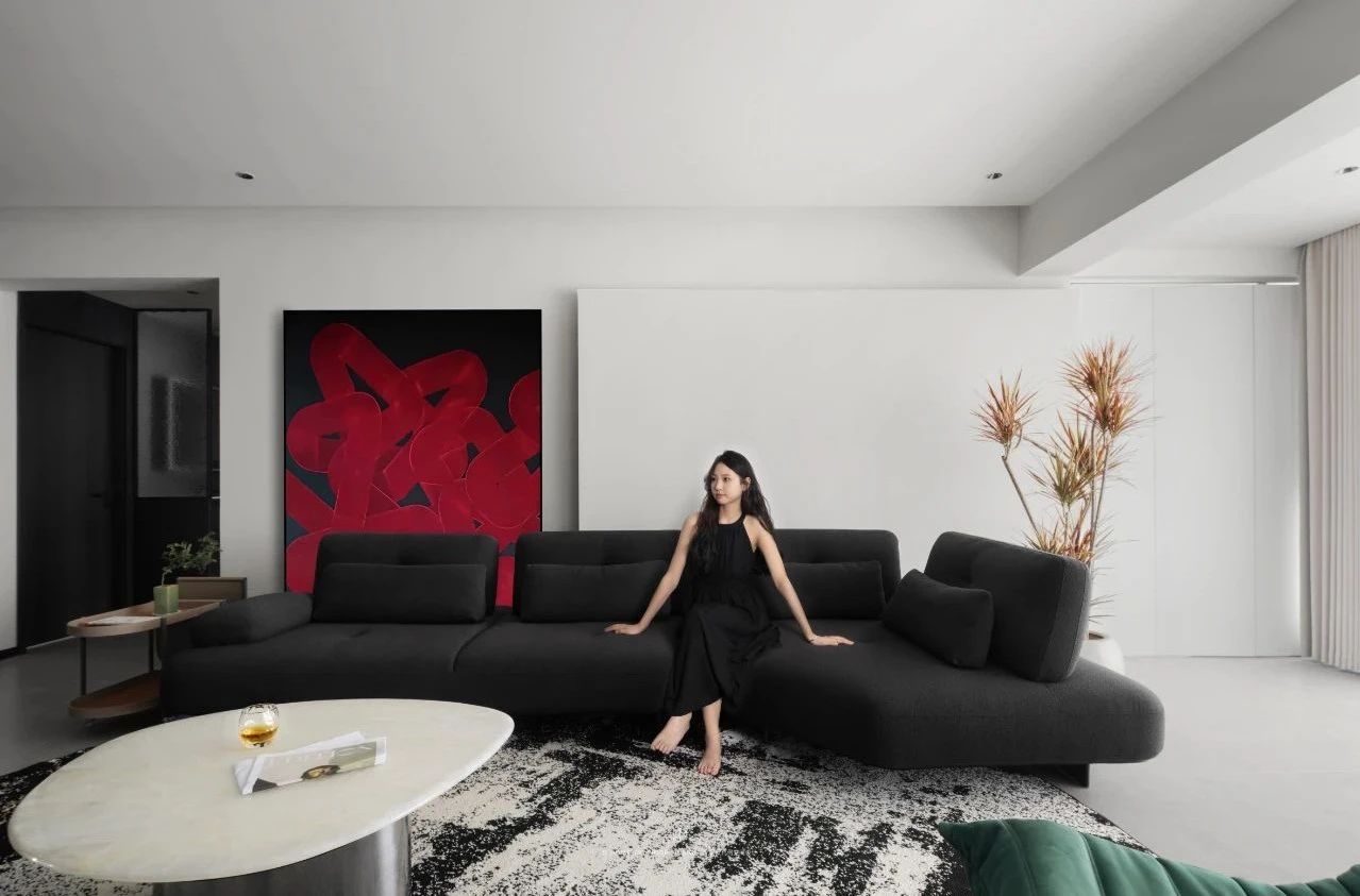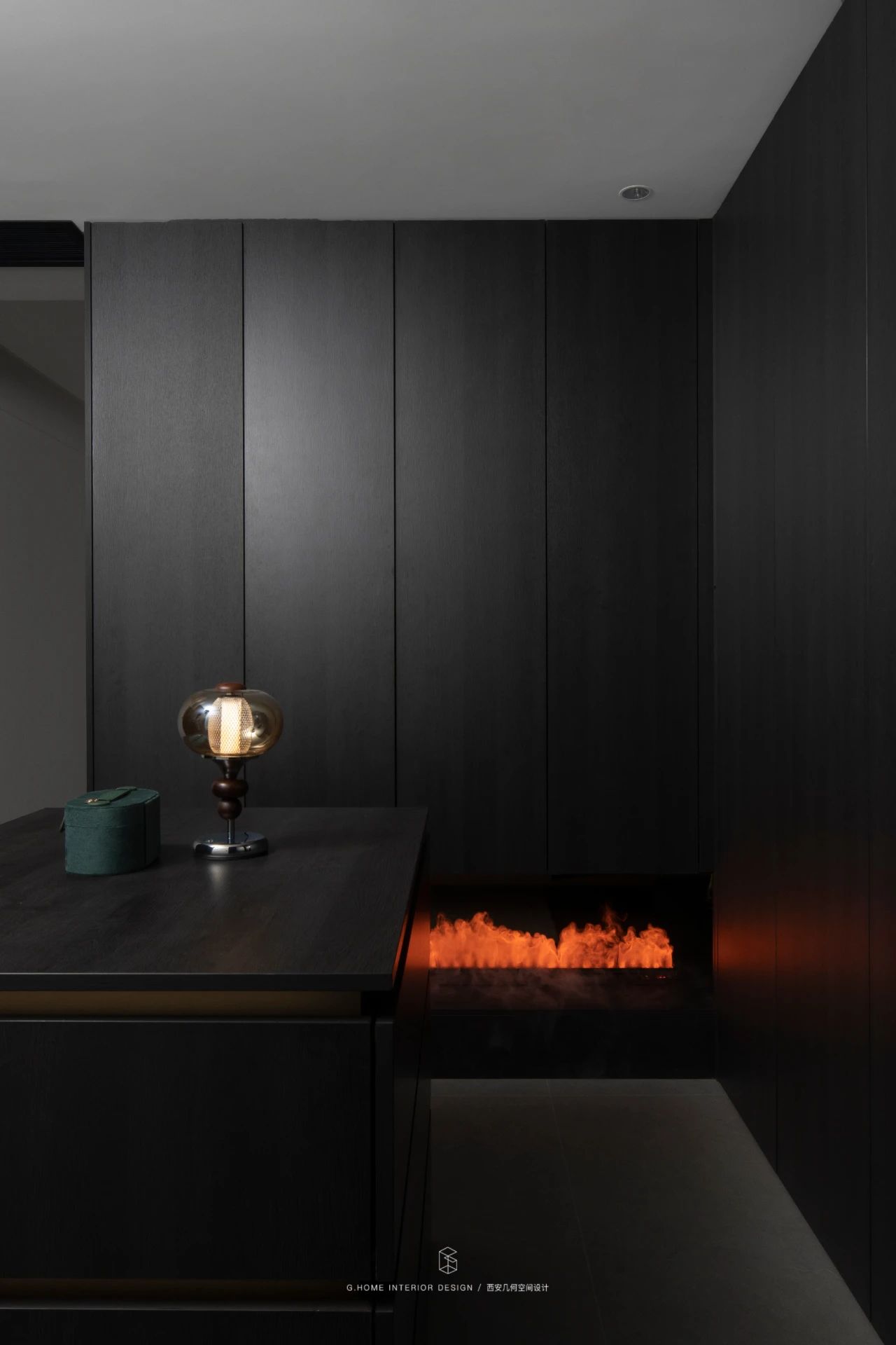 设计选材:客厅以黑白为主色调,搭配墨绿色沙发、红色装饰画;电视墙用定制柜+内嵌电视,沙发背景为石膏板造型+内嵌灯带;餐厨区选用深色木制元素与浅色石材;主卧用深色墙板+悬空衣柜,配置雾化壁炉;男孩房以黑白为主,红色点缀,搭配米奇收纳柜。