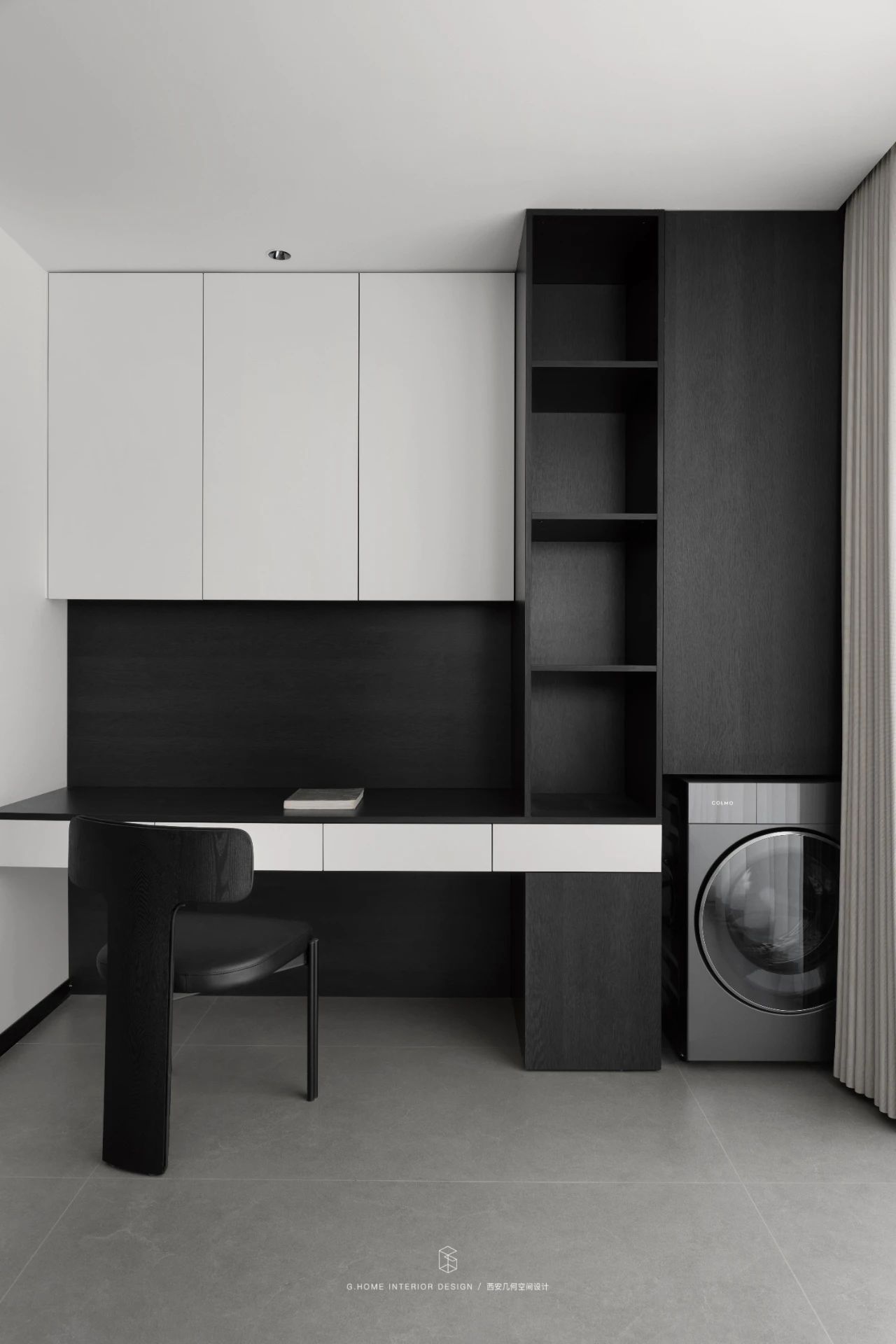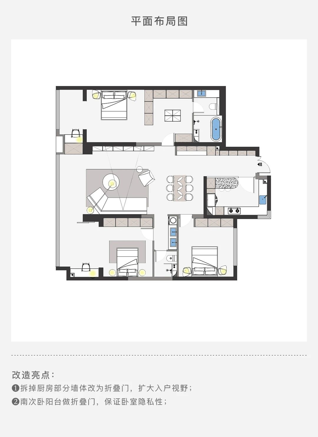 空间布局:厨房改为半开放式,搭配折叠门优化入户视野;客厅阳台拆分,一半纳入儿童房扩充活动空间,一半设家政柜;餐厨区与客厅贯通形成开放格局;主卧设L型衣帽间划分休息与洗漱区;男孩房阳台整合为学习+洗衣区。