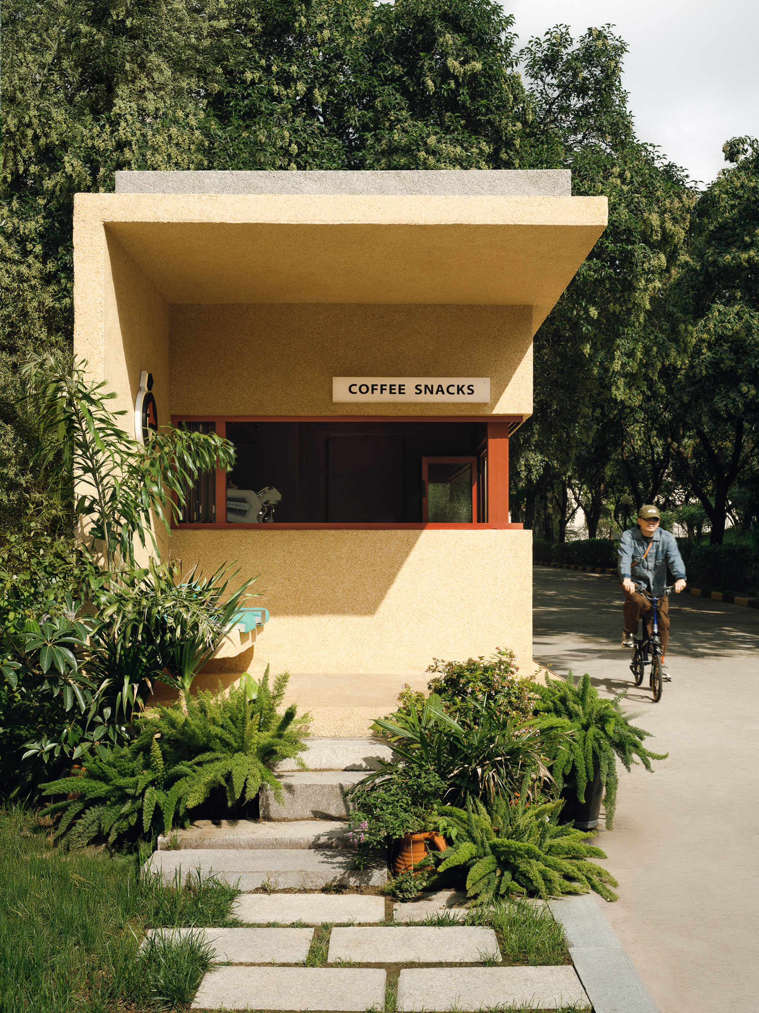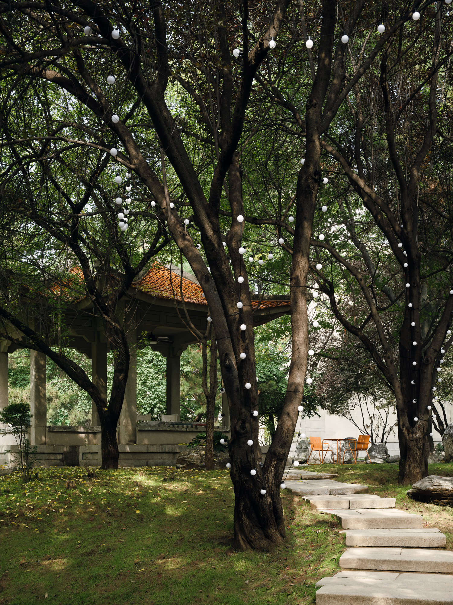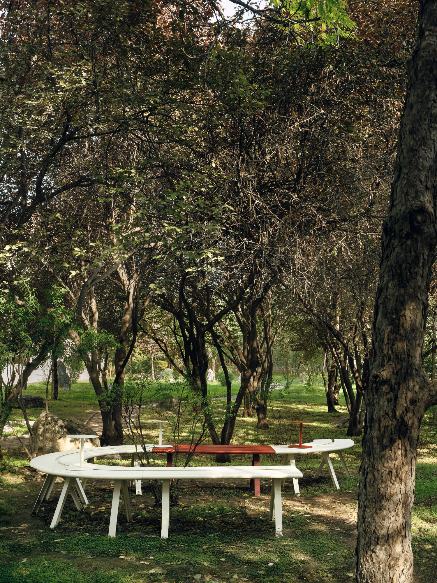设计选材:建筑外立面选用了米黄色水洗石,室内面材使用了石头并覆以朱红色漆面,从材质到颜色,我们希望建筑能够整体融入城市肌理之中。林地提供了城市中难得的自然场域,对于公园的改造,设计秉承着“弱介入”的原则,将原本宾馆内留下来的建筑废料改作石材踏步,铺装形成蜿蜒曲折的小径,沿着小径,摆放了一些户外桌椅,与树木和点缀的植物交织,成为一处口袋公园,为人们提供了舒适宜人的漫步和休息场地。