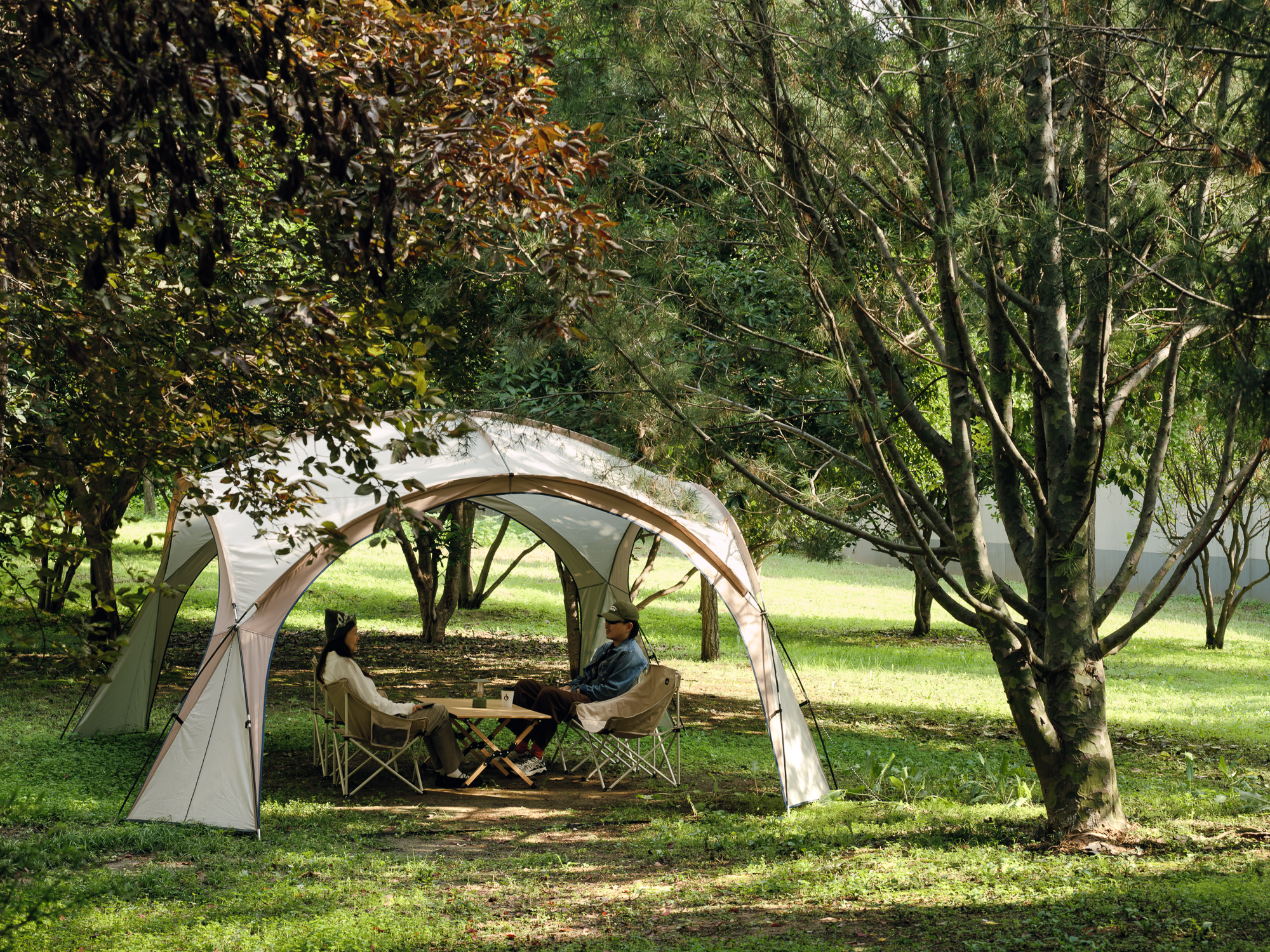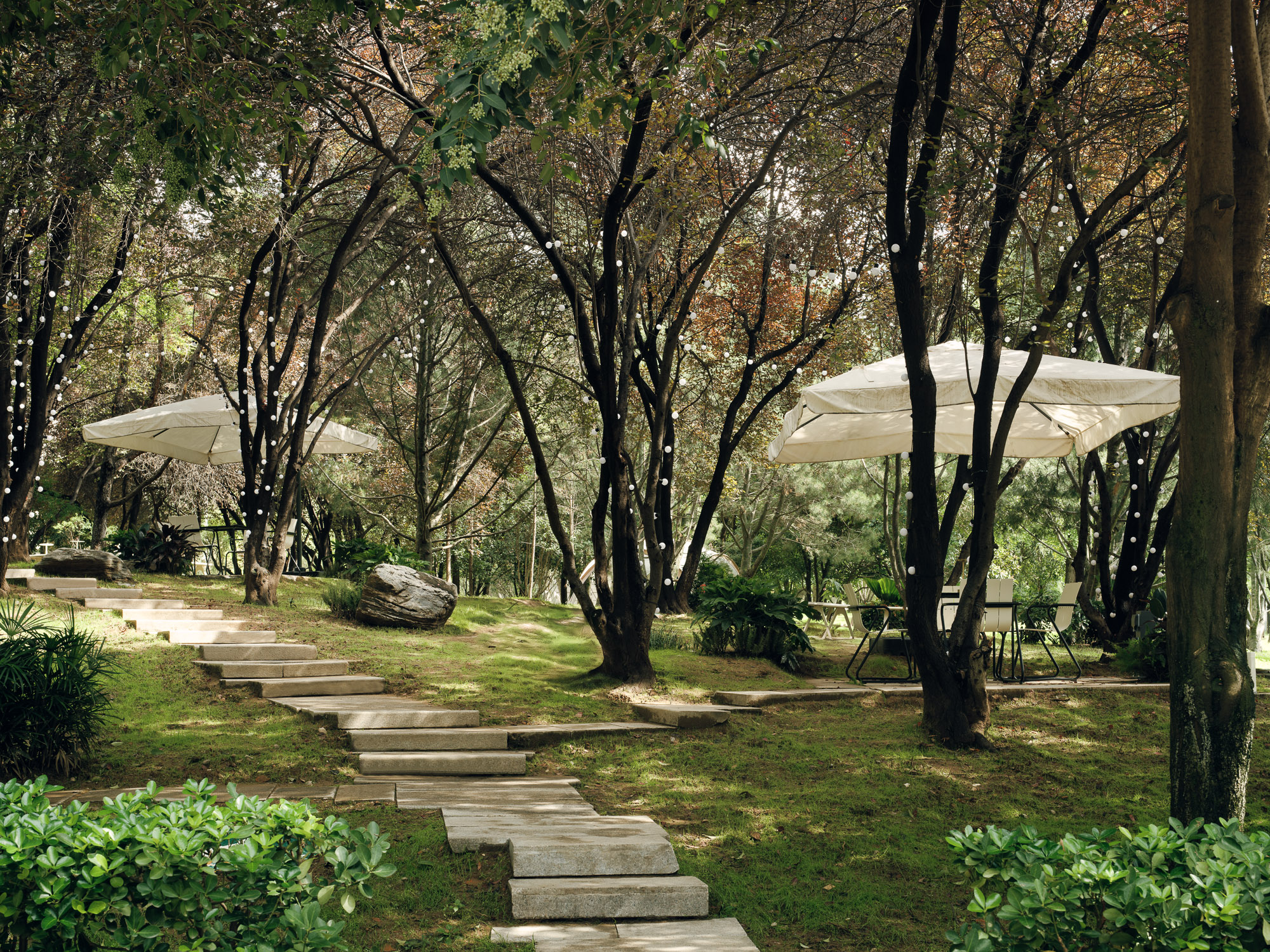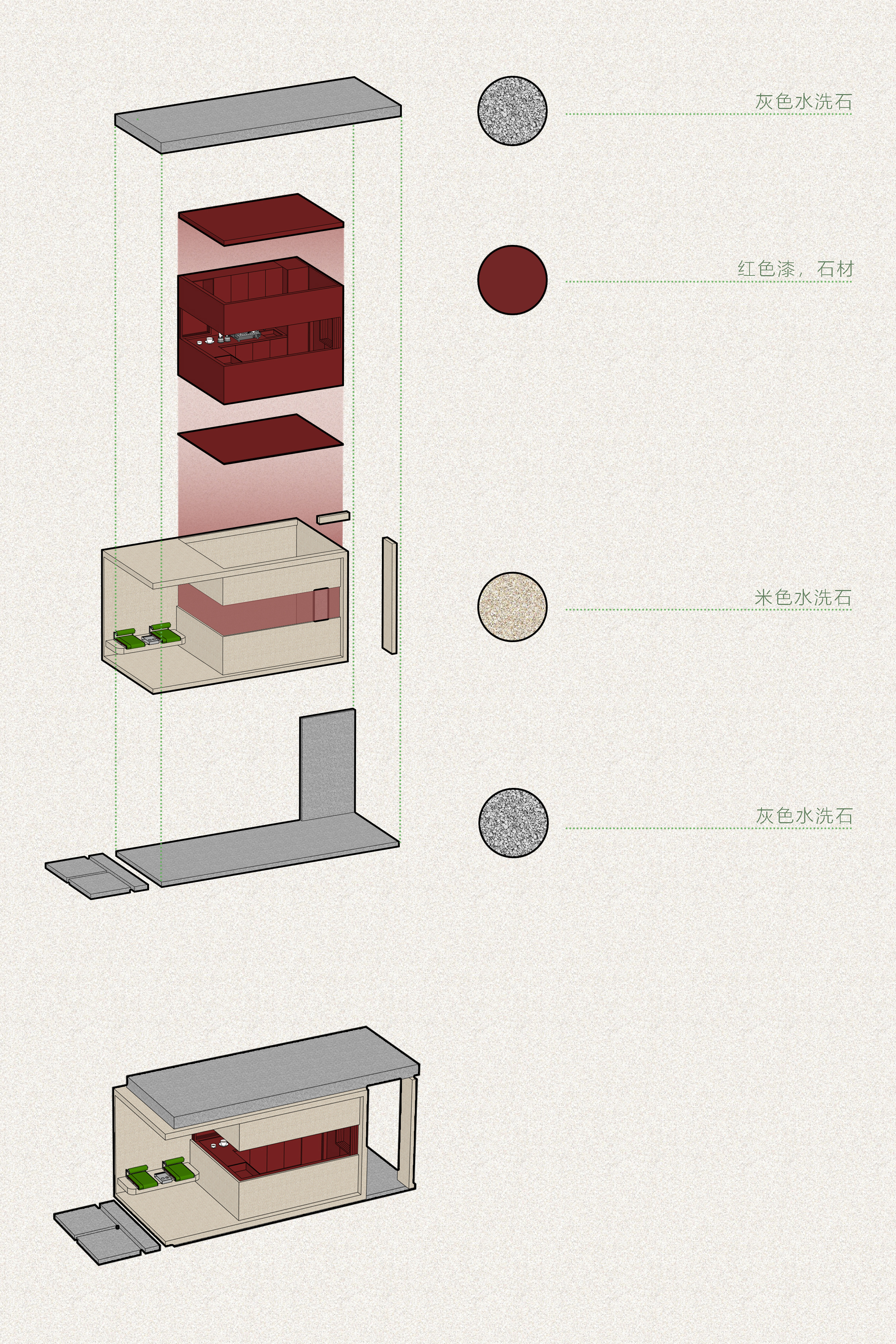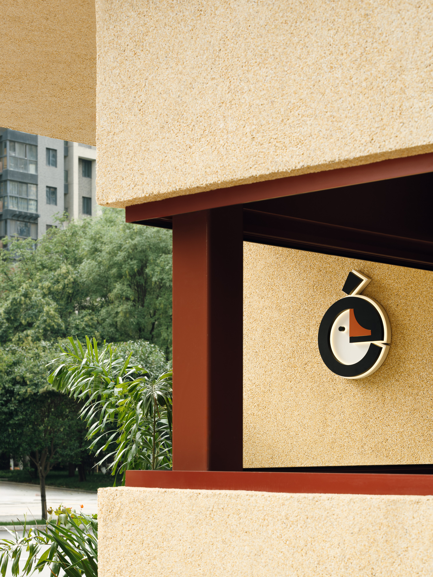 设计选材:建筑外立面选用了米黄色水洗石,室内面材使用了石头并覆以朱红色漆面,从材质到颜色,我们希望建筑能够整体融入城市肌理之中。林地提供了城市中难得的自然场域,对于公园的改造,设计秉承着“弱介入”的原则,将原本宾馆内留下来的建筑废料改作石材踏步,铺装形成蜿蜒曲折的小径,沿着小径,摆放了一些户外桌椅,与树木和点缀的植物交织,成为一处口袋公园,为人们提供了舒适宜人的漫步和休息场地。
