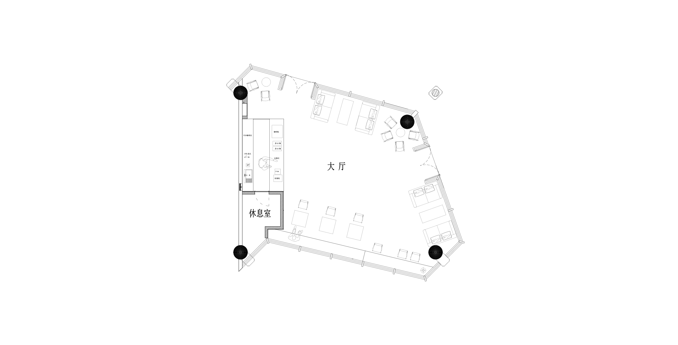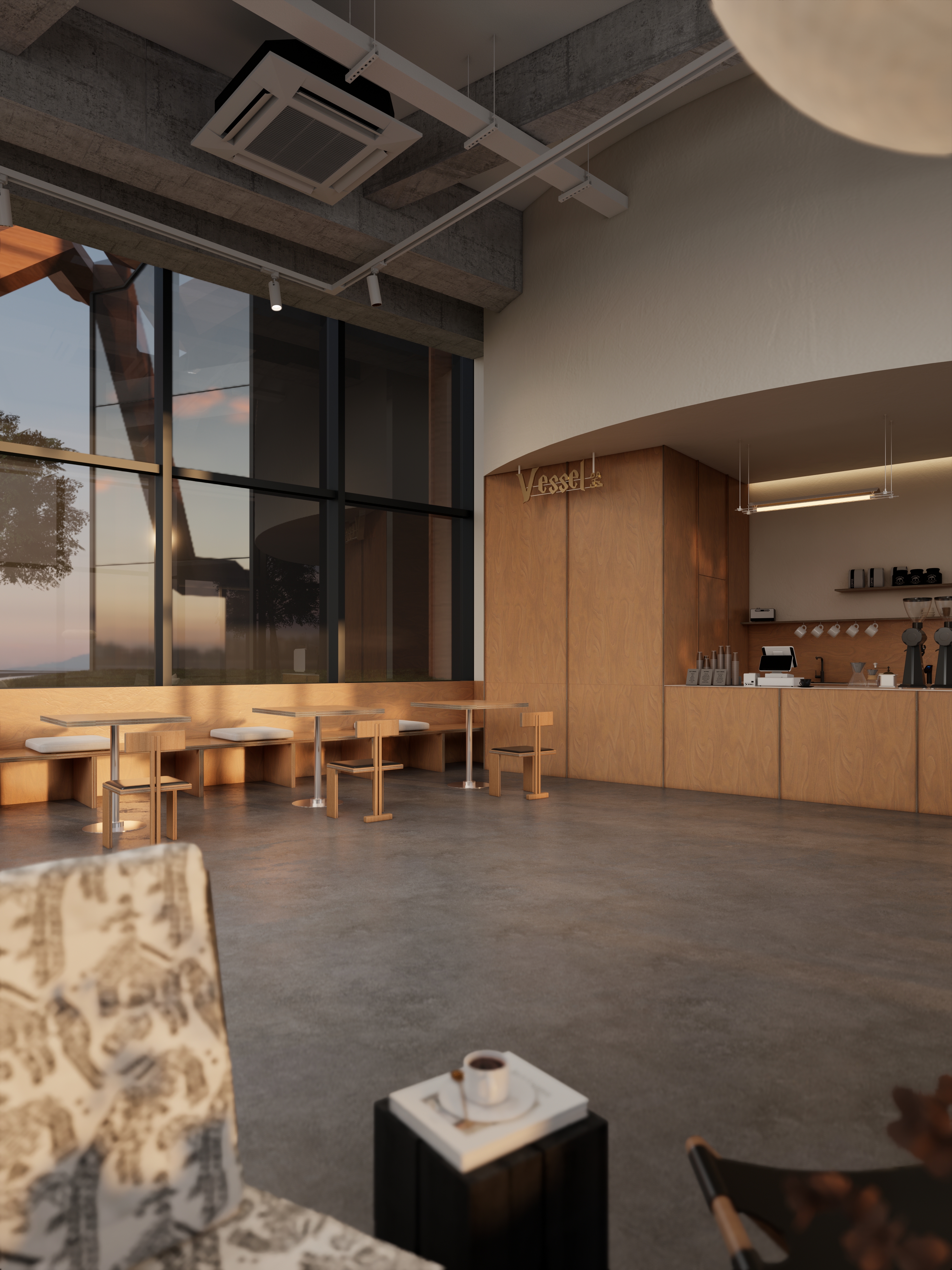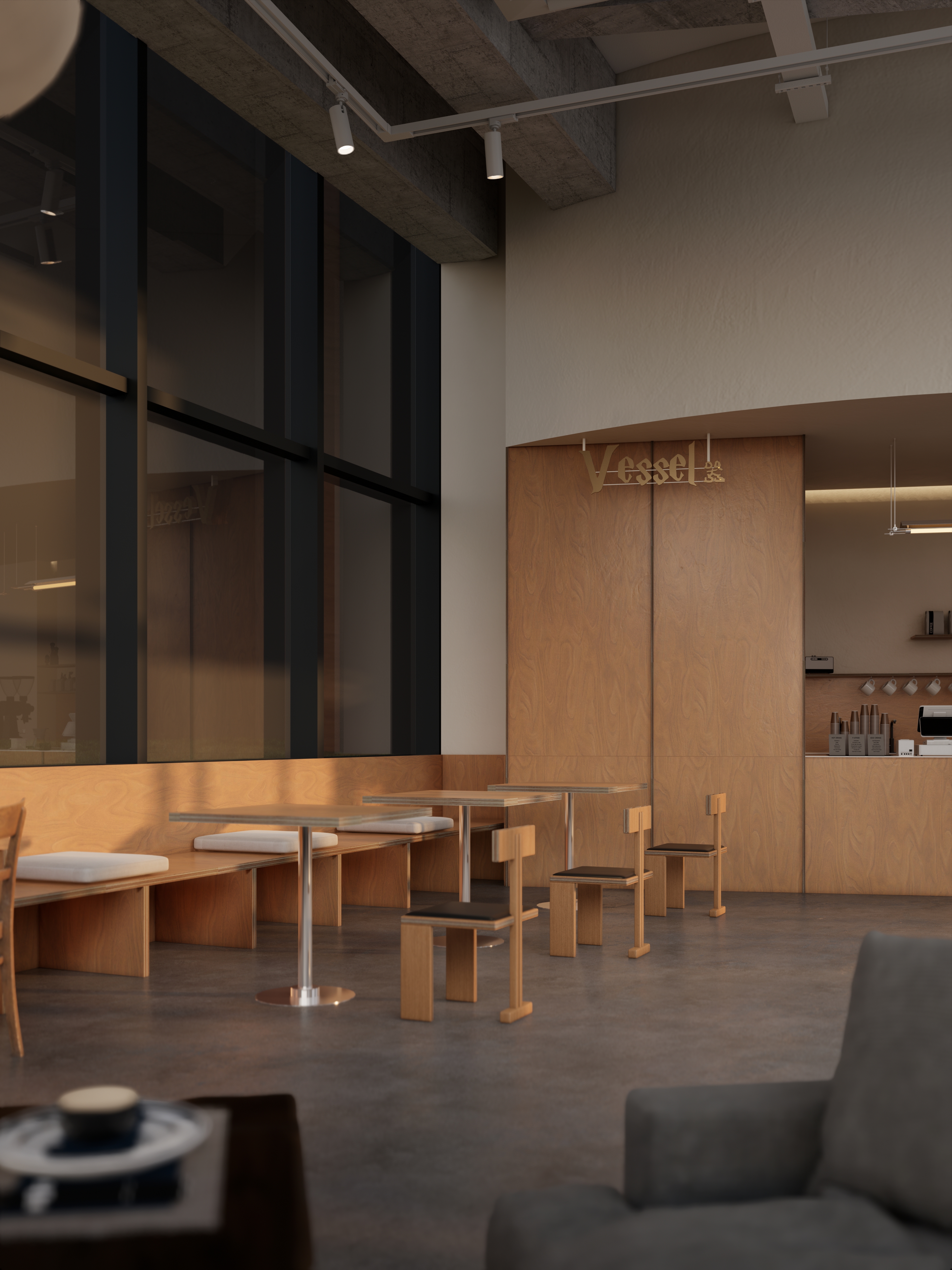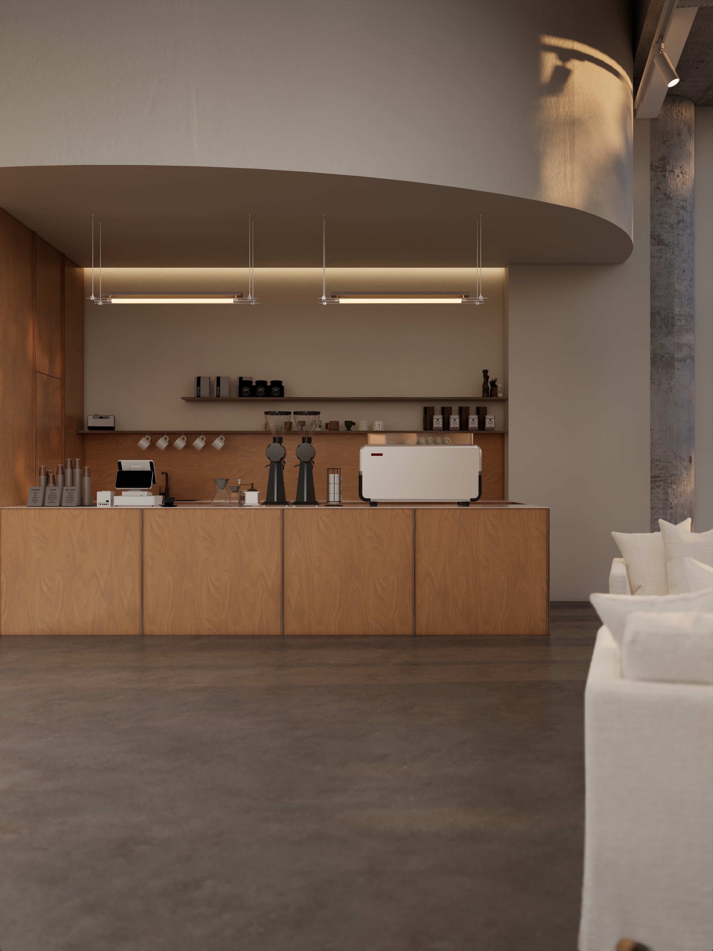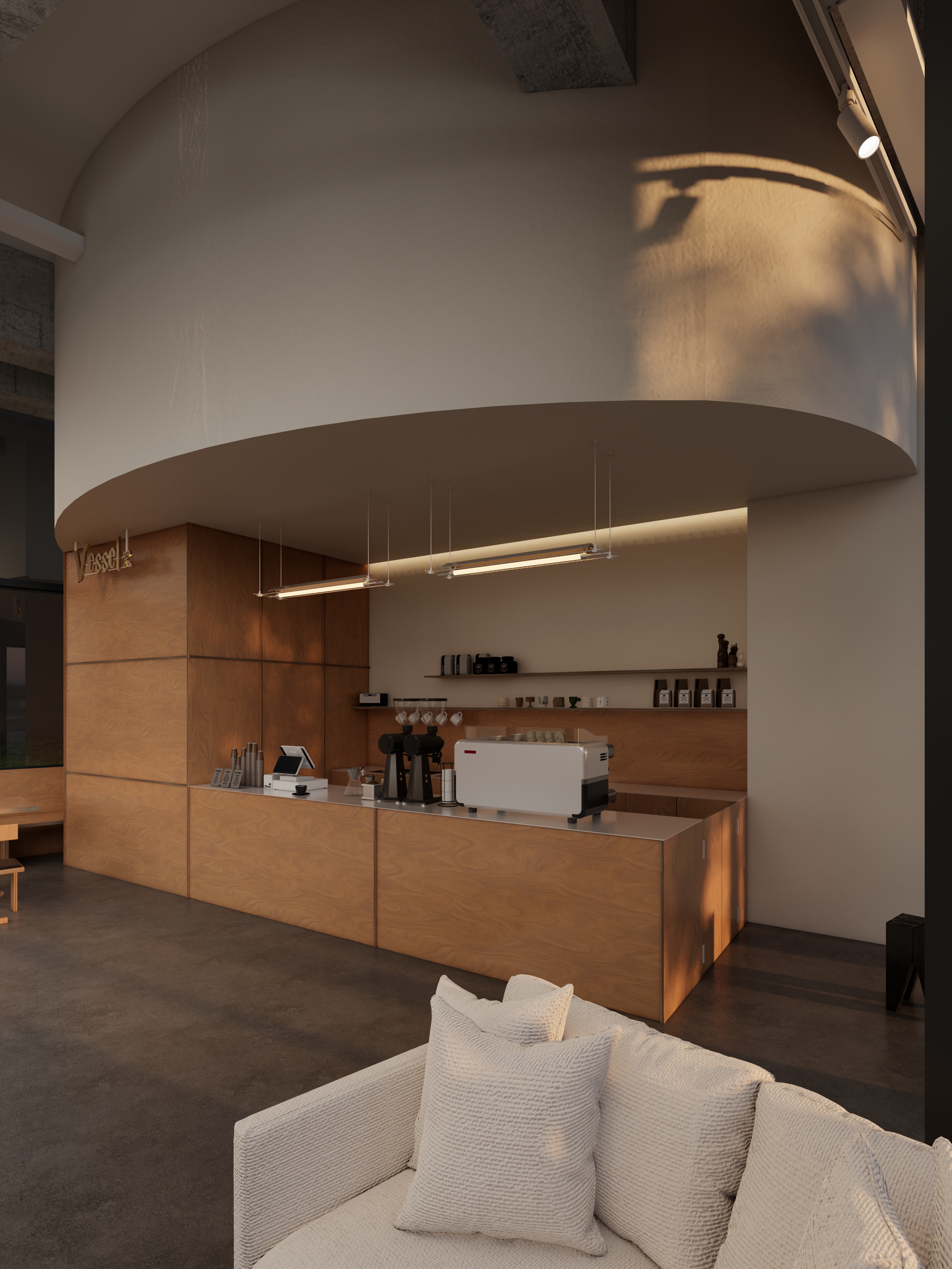 弧形顶面 + 线性灯做视觉引导,让 “点咖啡→赏器物→落座” 的动线自然洄游,既保持空间开阔感,又适配 “咖啡消费 + 器物体验 + 轻社交” 的多元需求;