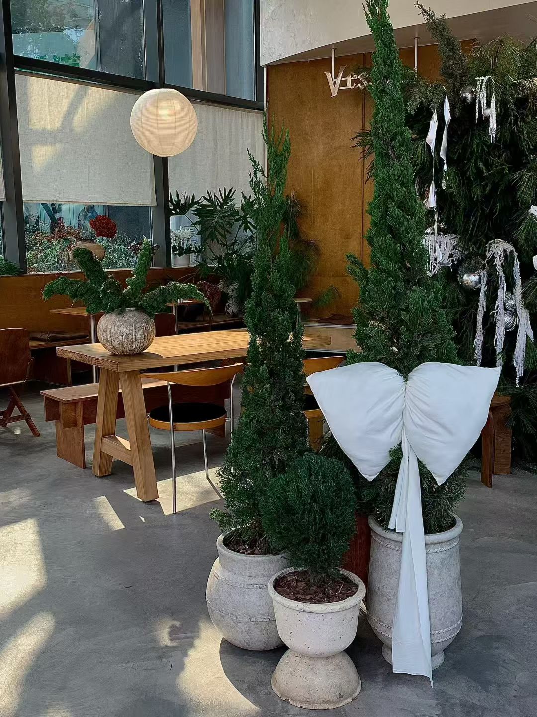 以极简的木饰面、水泥自流平为基底(冷硬极简质感),用鲜活松柏、干枯蒲苇等自然花艺做 “软包裹”,打破传统咖啡空间 “要么冷硬要么甜腻” 的风格局限;