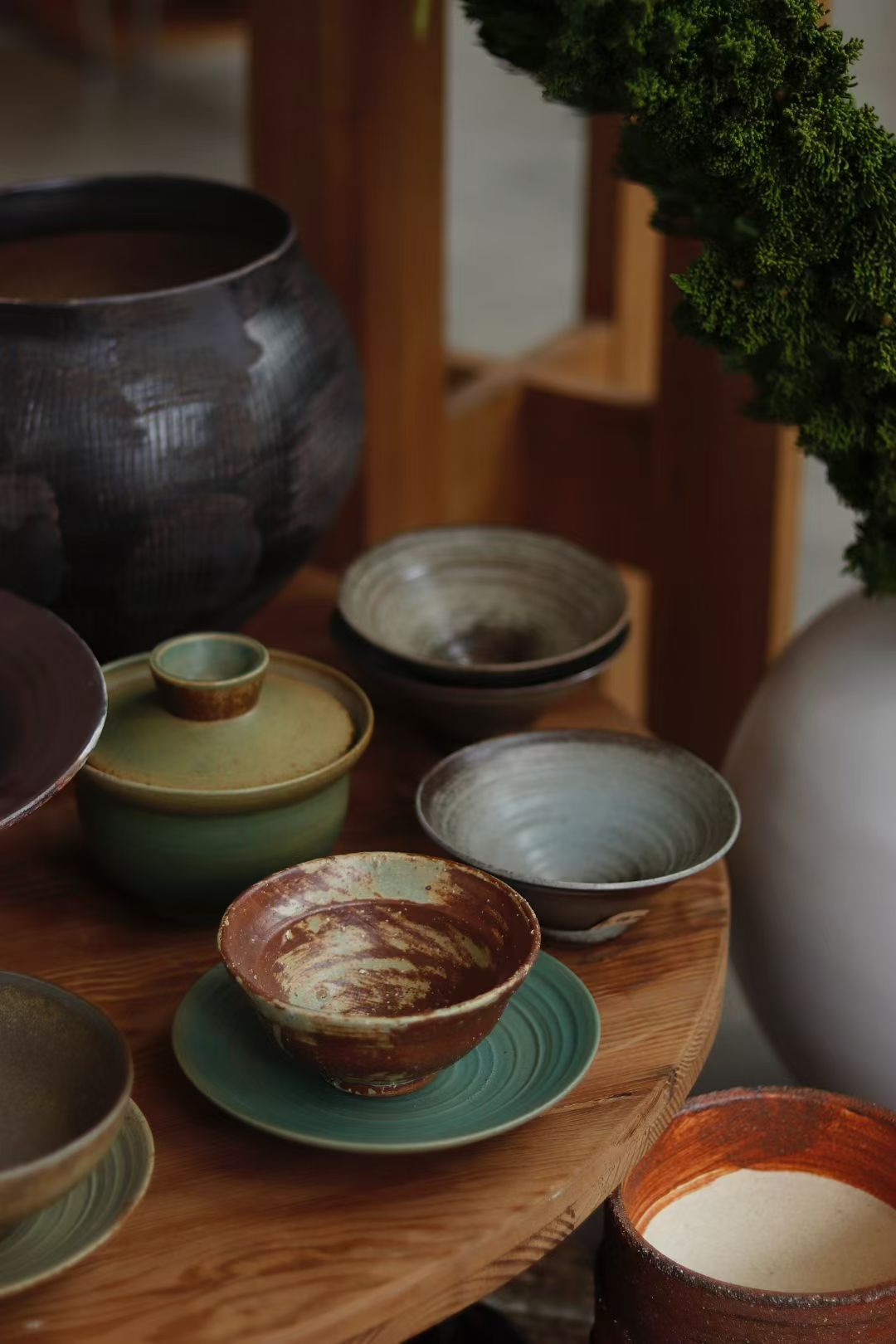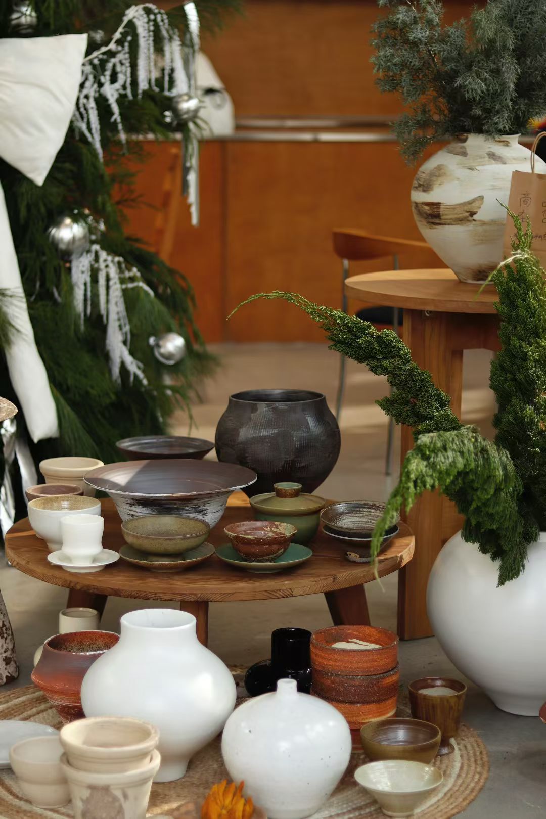 美学构件:自然花艺选本地易养护的松柏(降低运输 / 养护成本)、可循环干蒲苇(长期使用无需频繁更换);器物展台用回收老木桌改造(低碳且自带质朴质感);