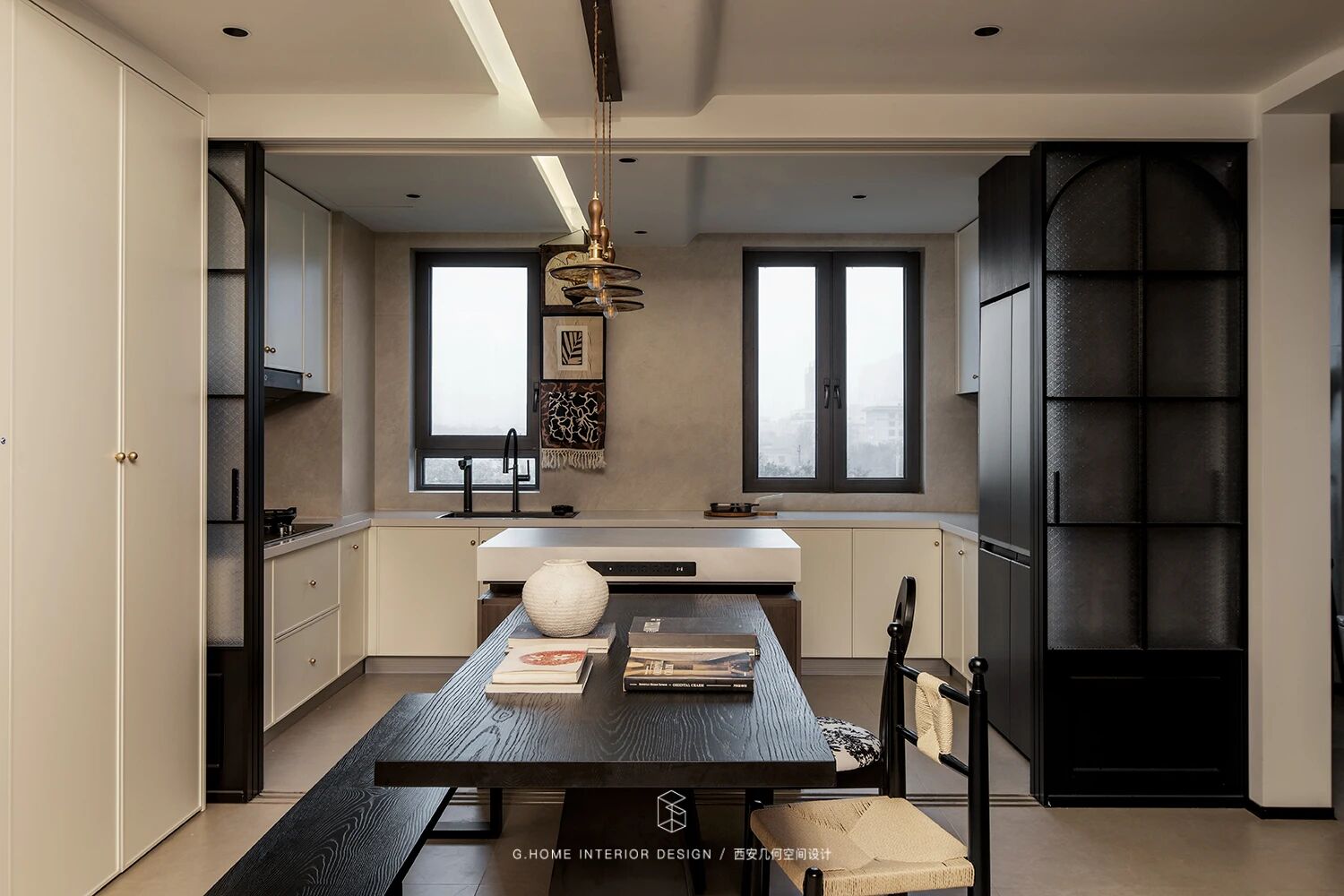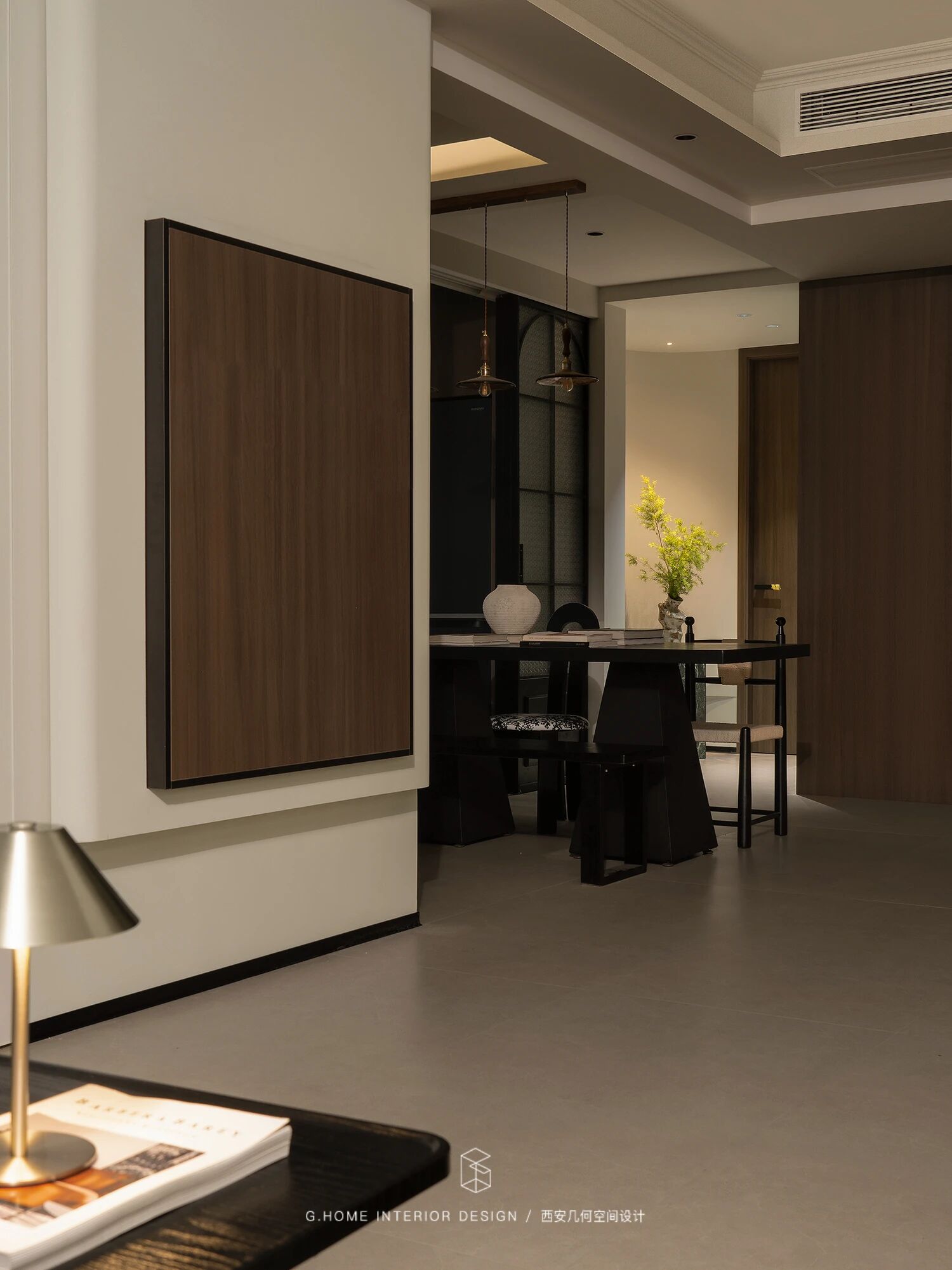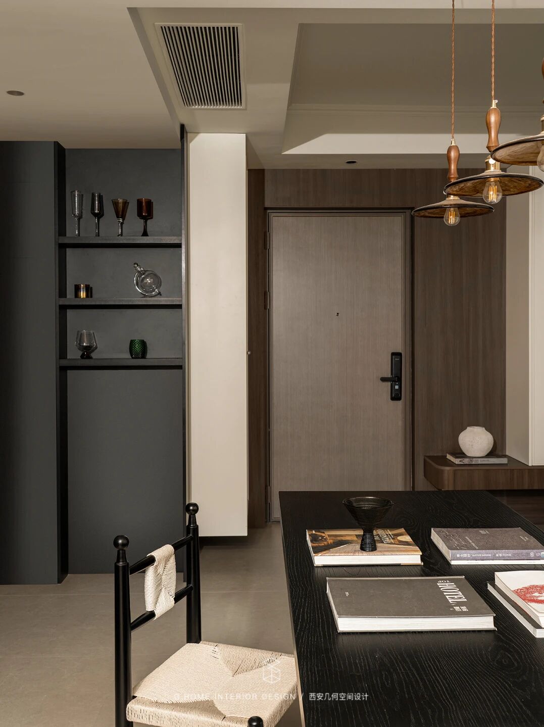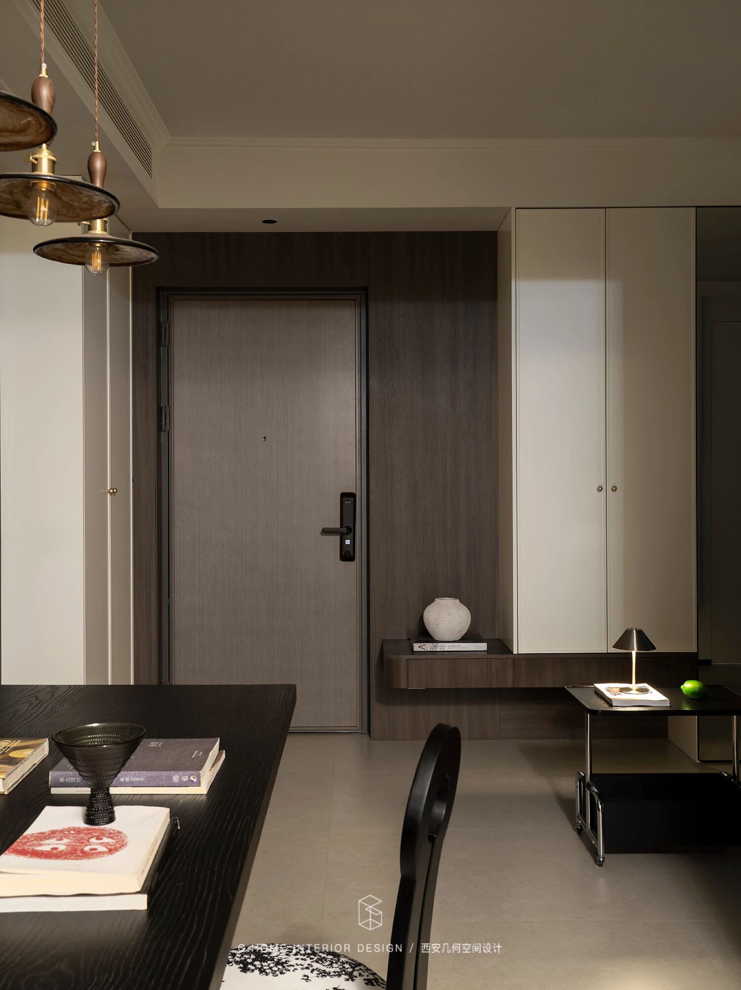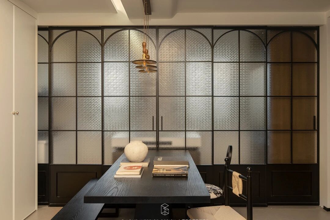用户体验:客厅钢琴摆放满足业主爱好,营造艺术氛围;餐厨区半开放设计平衡采光与油烟隔绝需求,动线优化提升使用便捷性;玄关收纳与格架兼顾实用与艺术感;主卧玻璃推拉门保障隐私与采光;次卧蒙氏设计给予孩子充足安全感,契合电影感与个性化居住需求。
