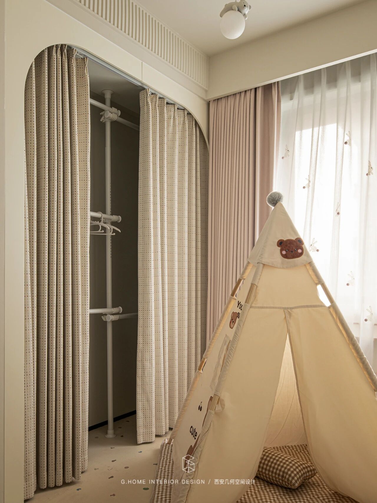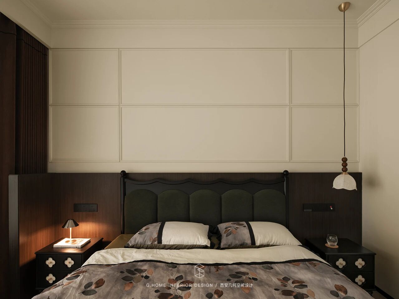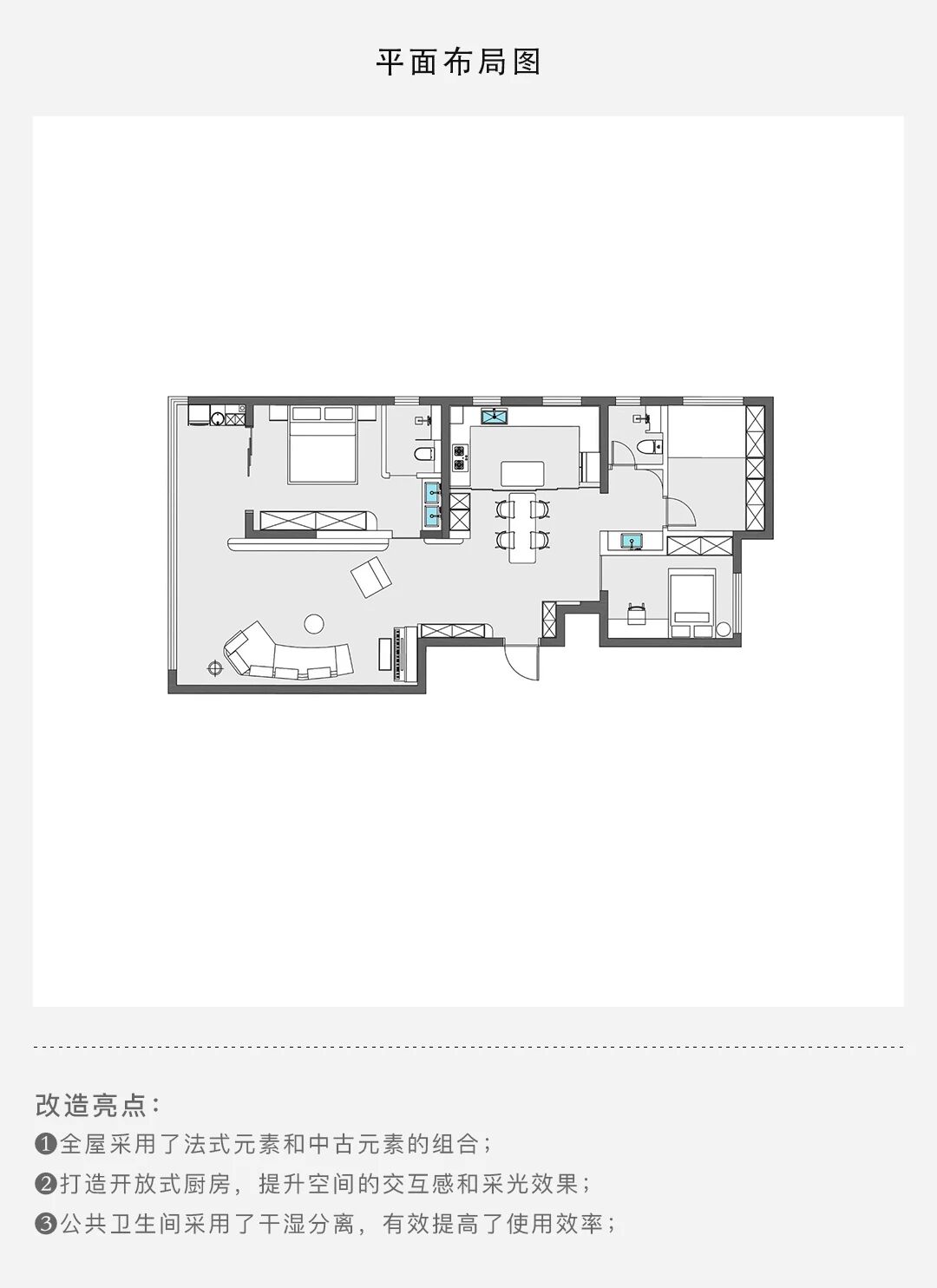空间意境:构建多元适配场景——客厅为法式复古氛围浓厚的艺术休闲场;玄关为兼具收纳与艺术调性的入户过渡场;餐厨区为半开放通透的用餐操作场;主卧为融合法式元素的私密休憩场;次卧为保障孩子安全感的蒙氏儿童活动场。