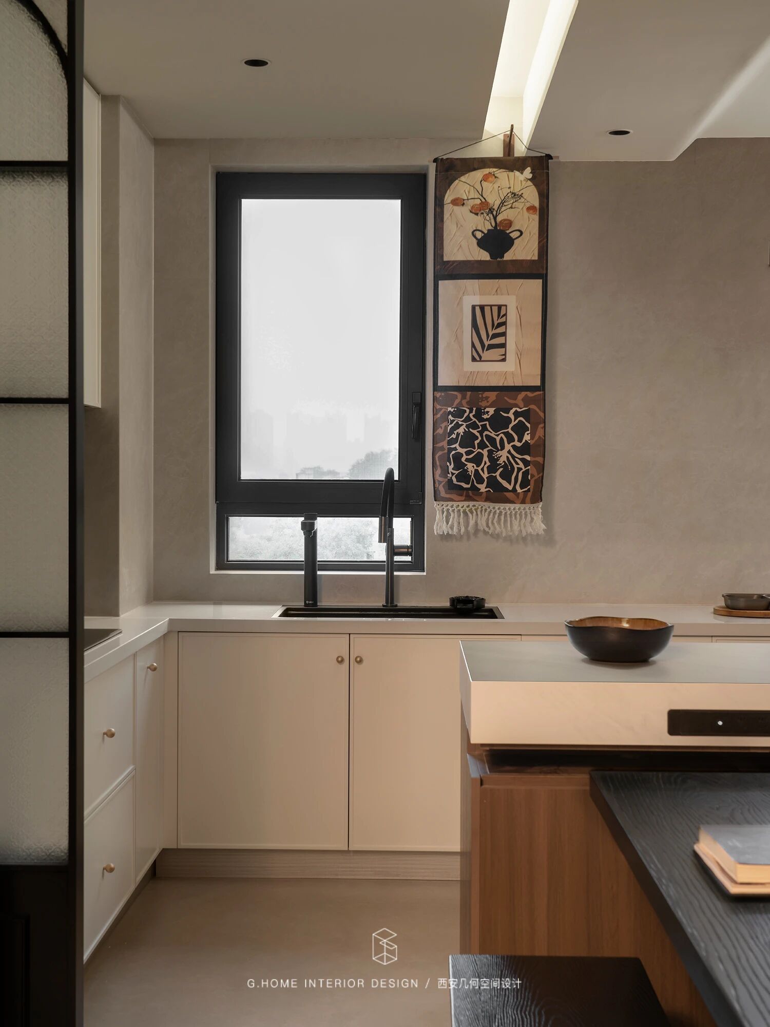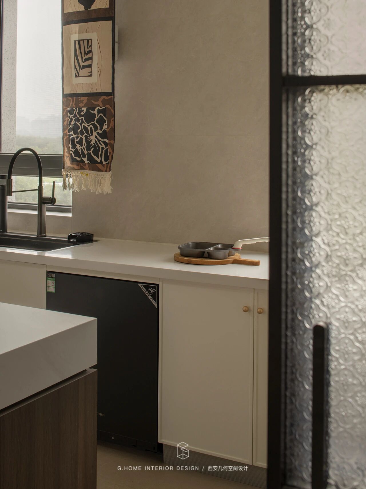 空间布局:餐厨区采用半开放设计,以玻璃推拉门+岛台为介质衔接厨房与餐厅,U型橱柜搭配岛台优化操作与传递动线;客厅设大面积落地窗引入采光;主卧衔接延伸阳台,用玻璃推拉门分割公私区域,主卫干区外置;玄关两侧定制柜体,拐角设格架;次卧规划大面积儿童活动空间。