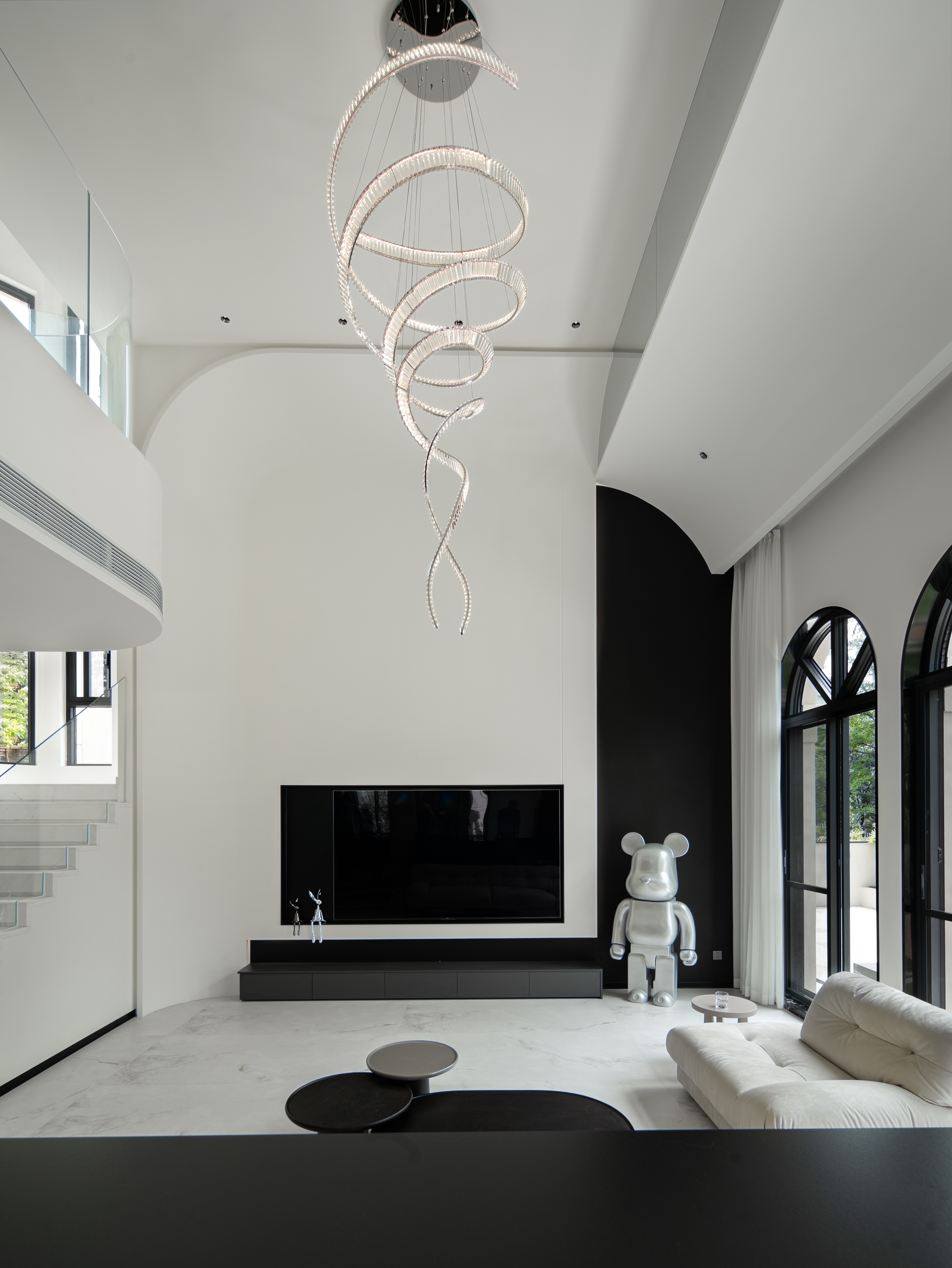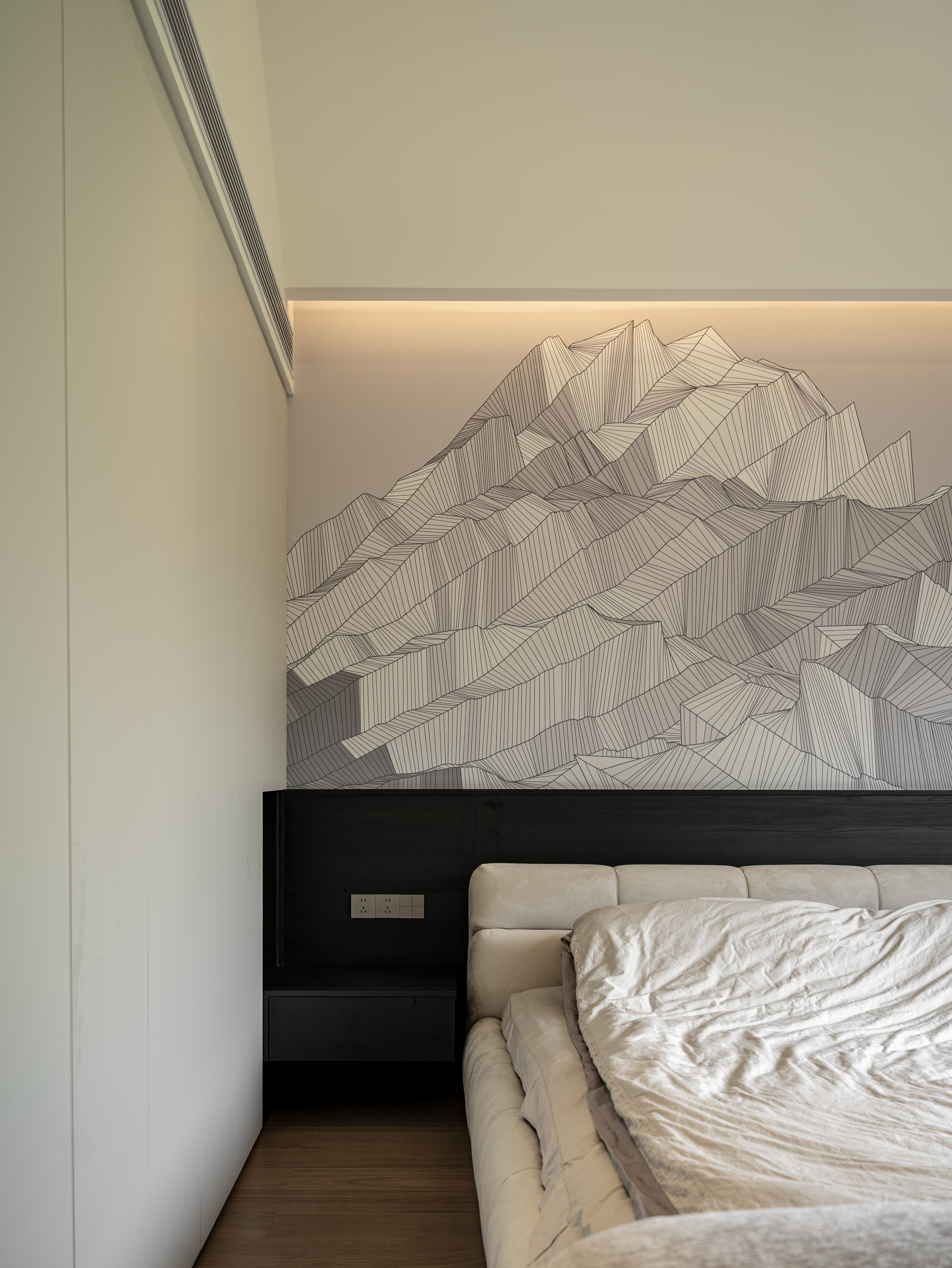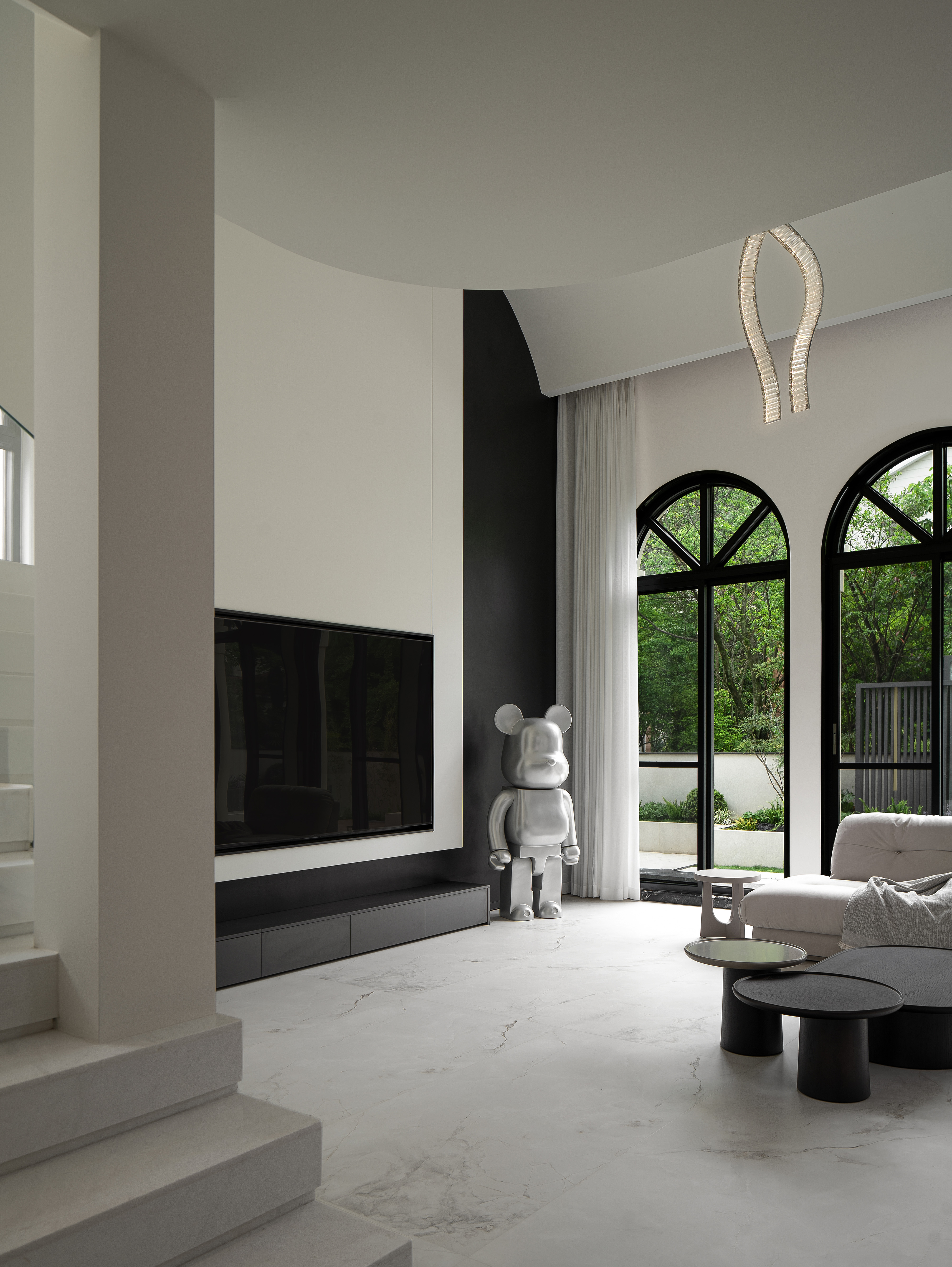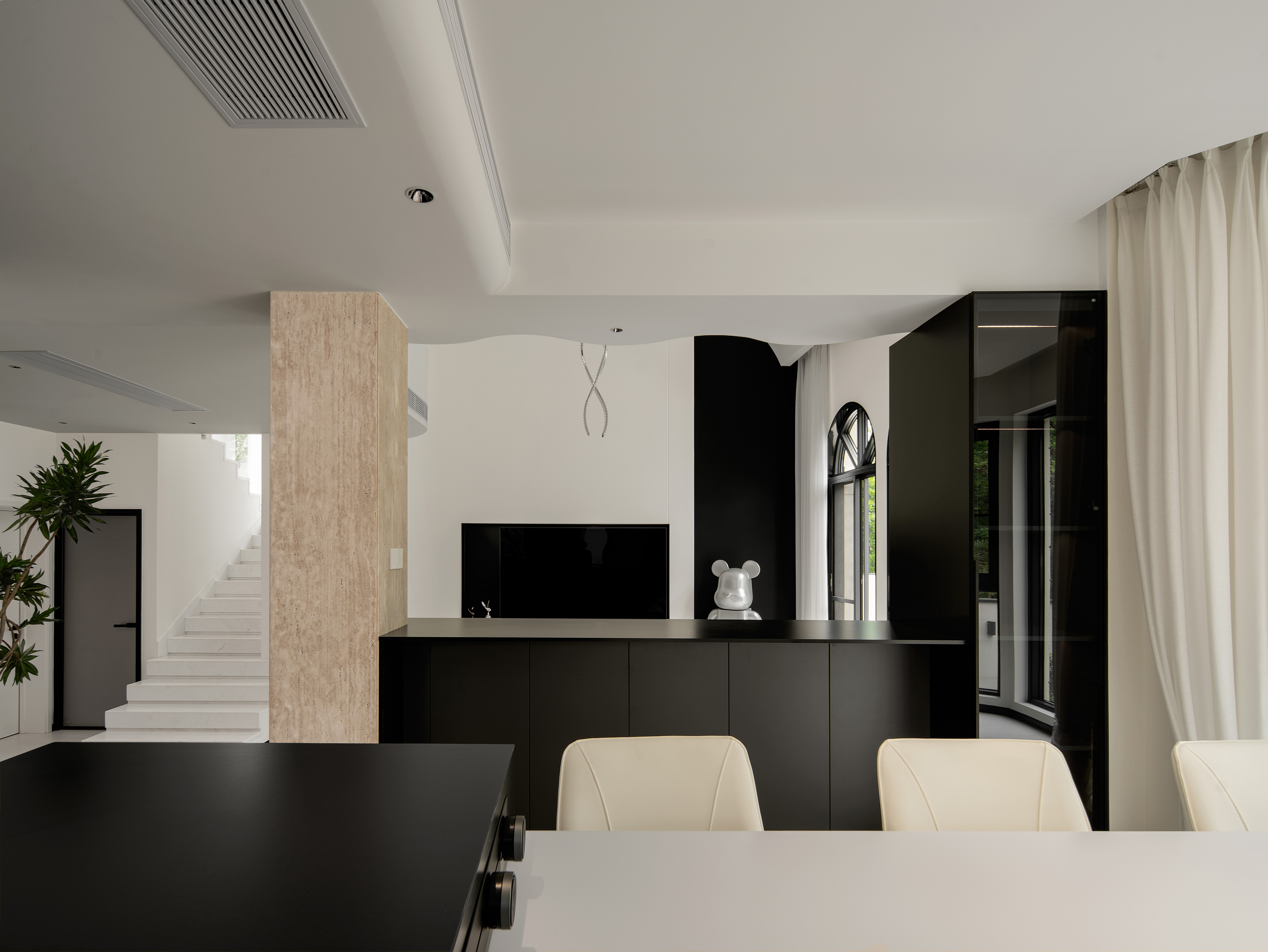 空间意境:本案采用黑白极简风,没有复杂的颜色,化繁就简,依旧能以利落的线条描绘空间层次,描绘房屋主人的居住态度,剔除复杂的装饰,以简洁的黑白灰语言进行风格叙述,将精致极简、从容优雅藏于内,将平静内敛呈现眼前。