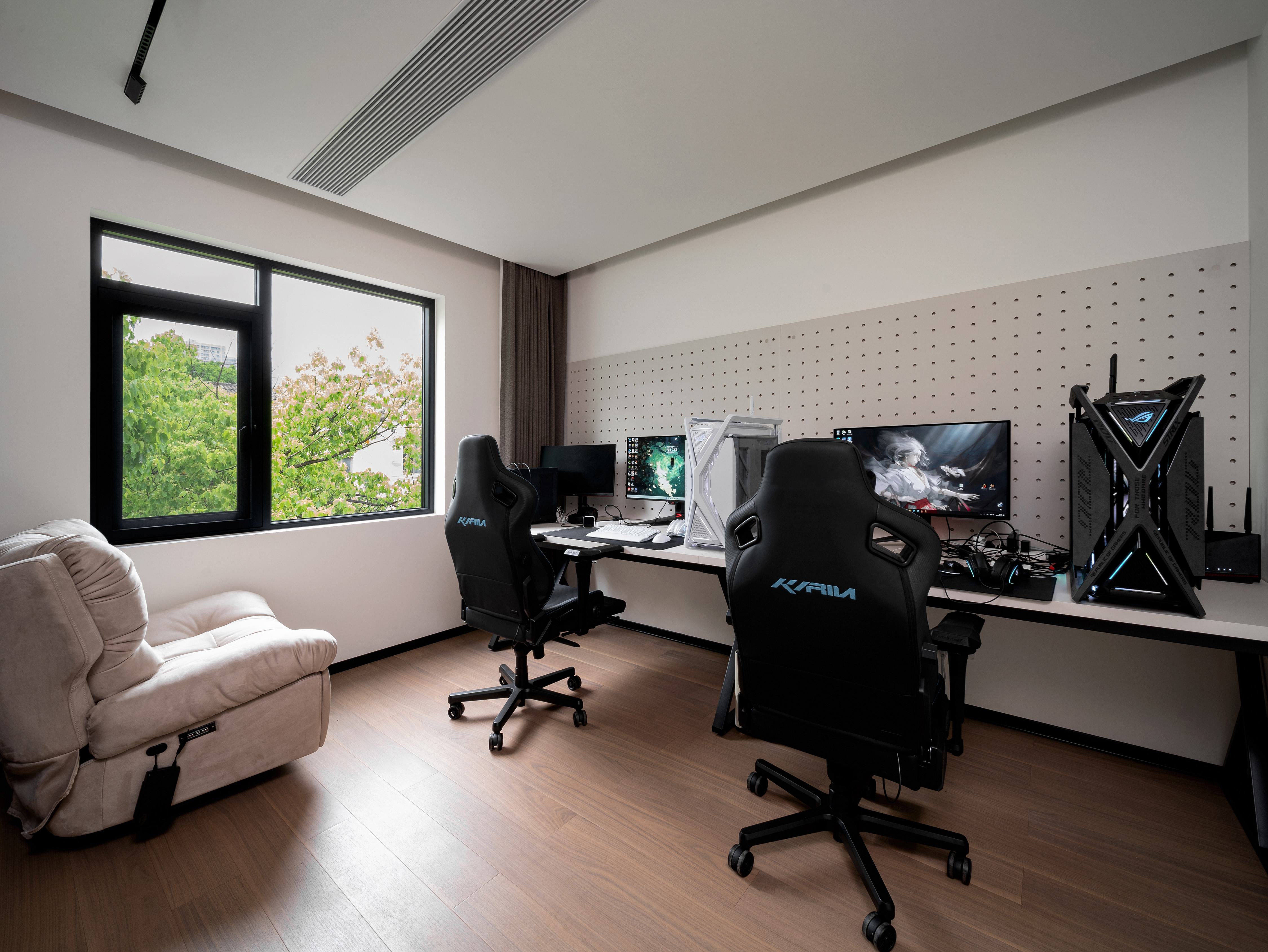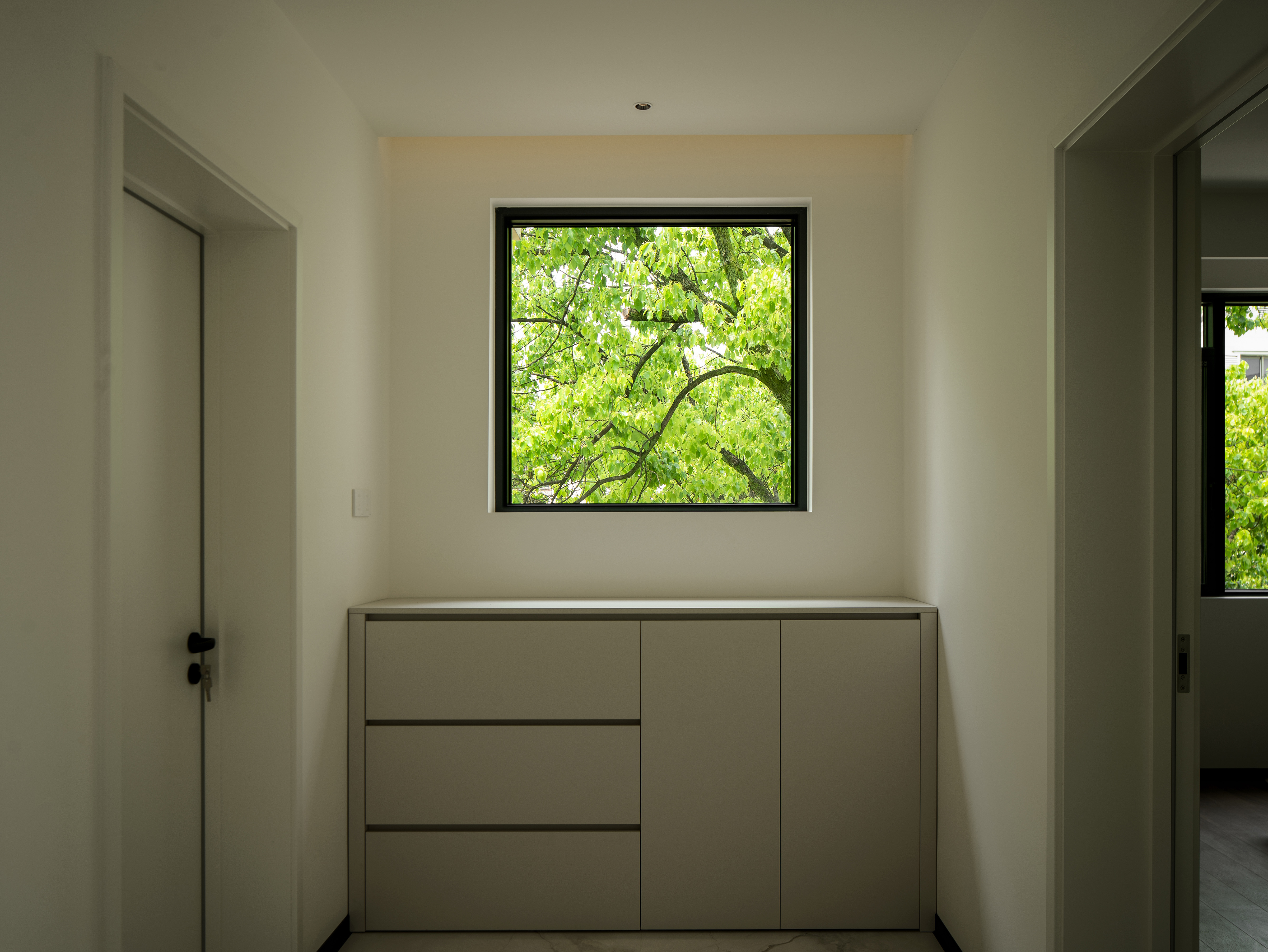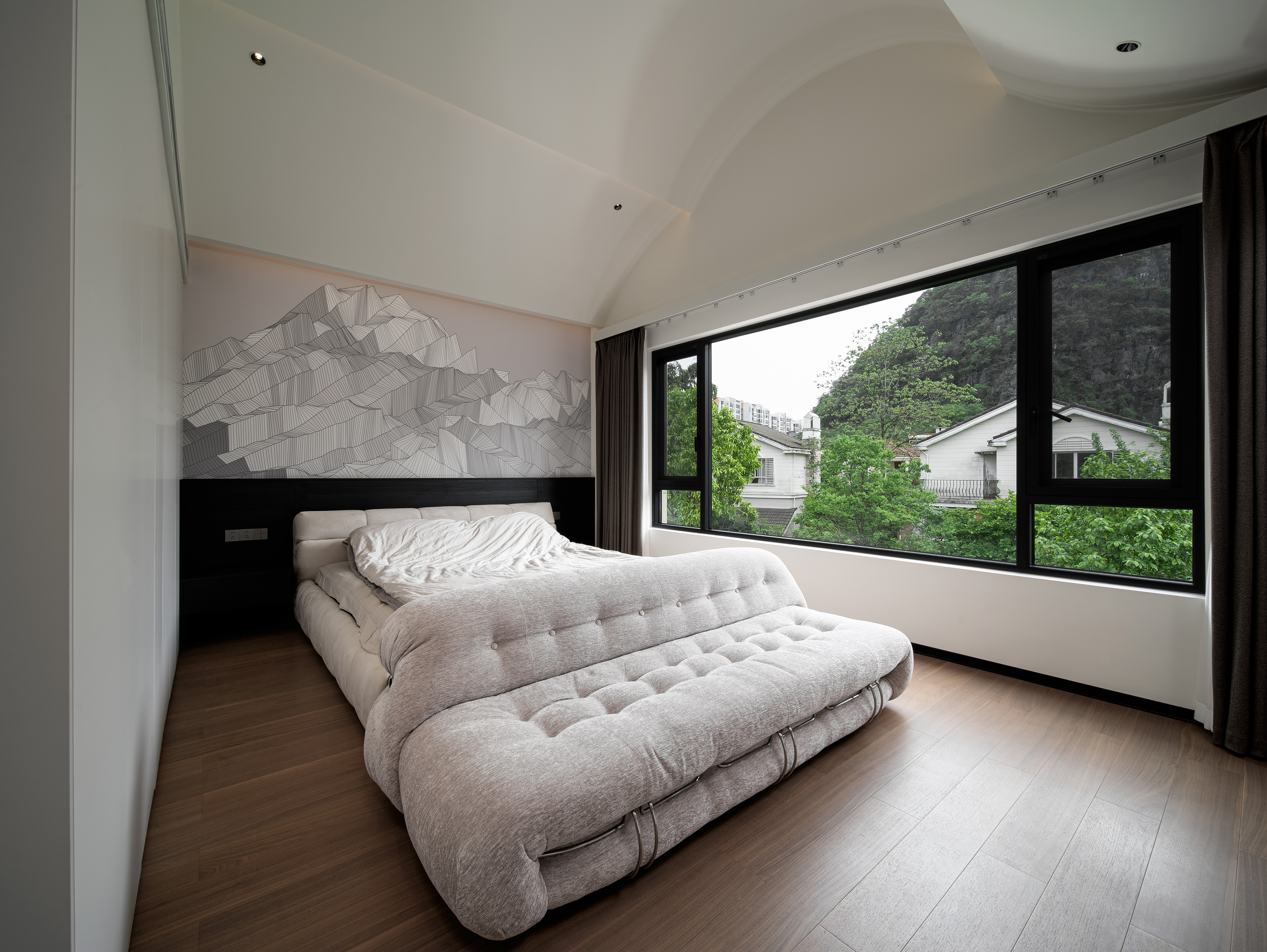 空间布局:简单的配色贯穿整个空间,使得自然的成为了一个整体,往上至下同一色系家具提升空间整体质感的同时也奠定了整个空间的统一性。以功能为第一要素,摒弃过多繁杂的修饰,让设计回归自然、舒适,简洁的白墙配上柔和的灰色地面,点缀以少量的黑色,色调层层推进,让空间更有层次感。