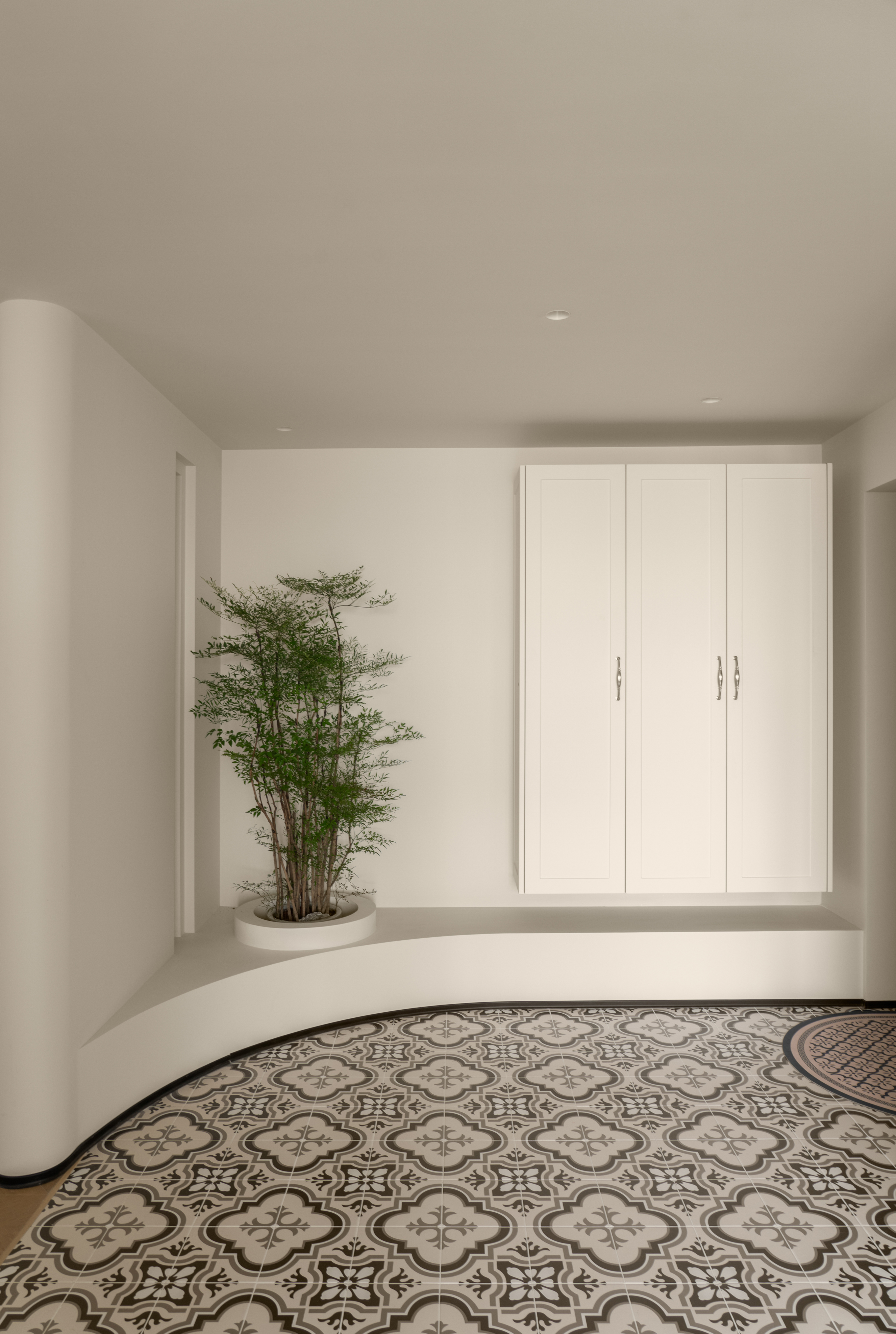 玄关弧形墙镂空隔断,凸显空间柔和之美,延伸视觉空间,悬浮鞋柜增加储物空间,绿植为空间注入自然清爽的气息。