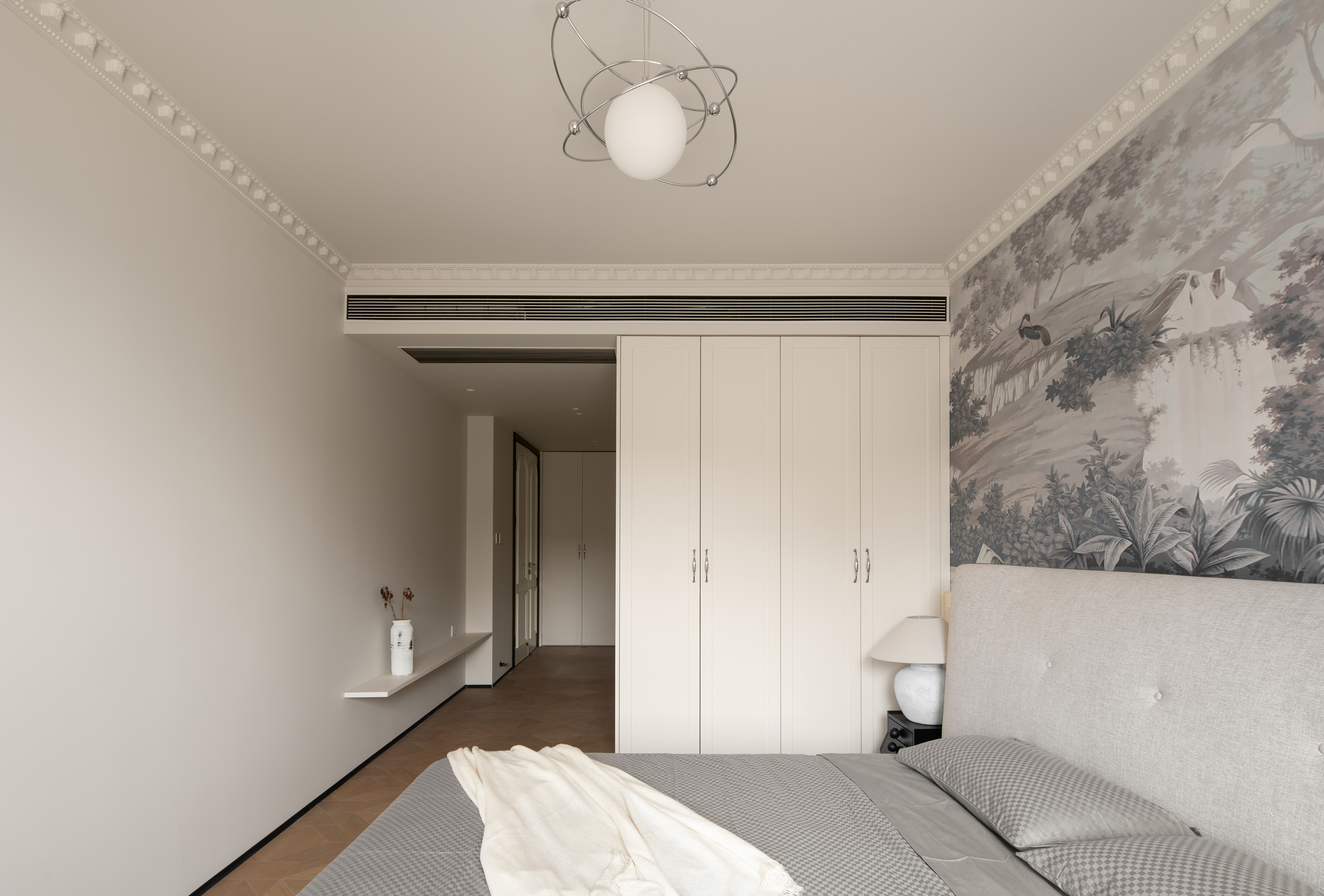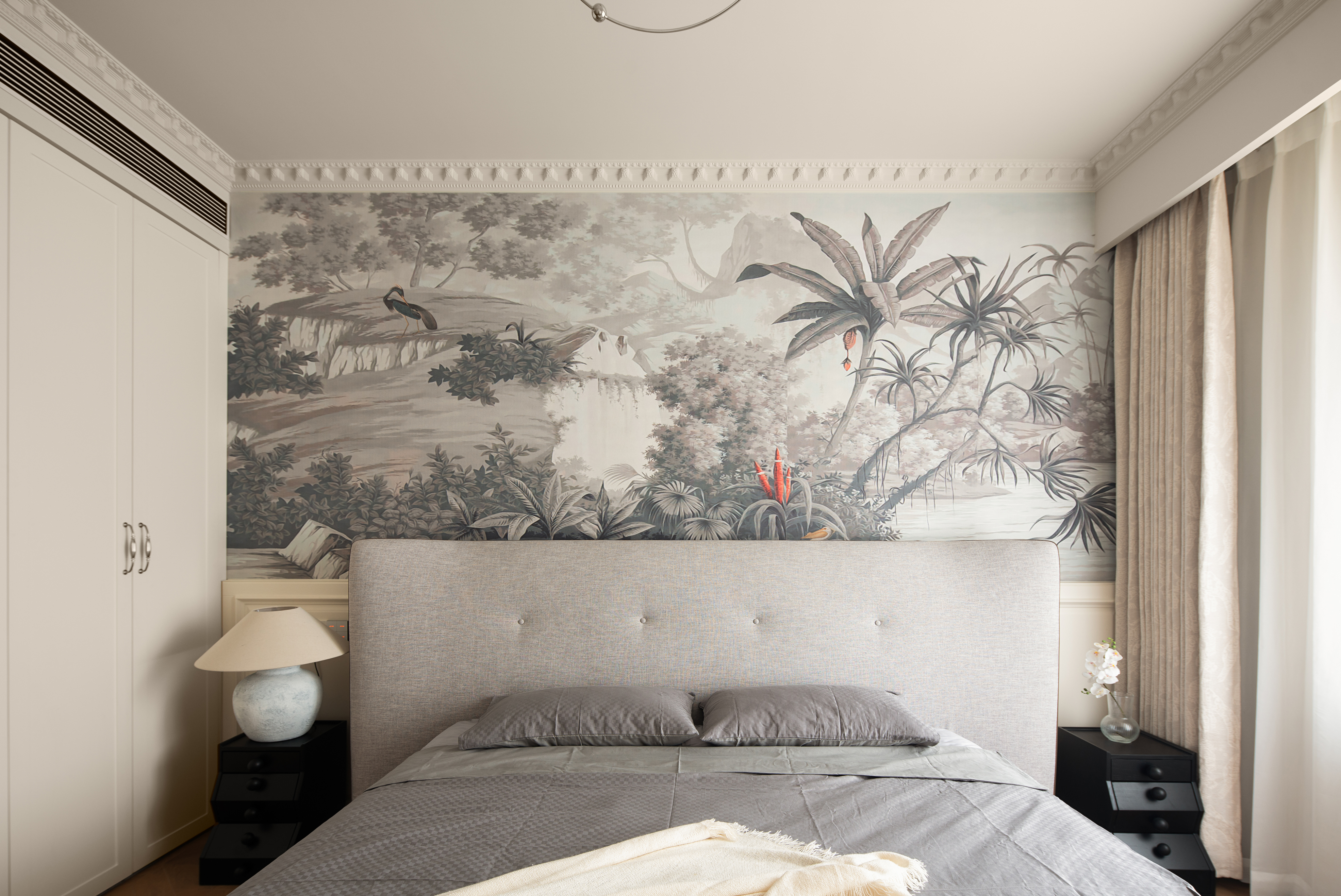 主卧采用田园复古风混搭,低饱和床头壁纸丰富空间层次,富有生机与活力,与天然的材质相结合,发散出优雅温馨的气息。
