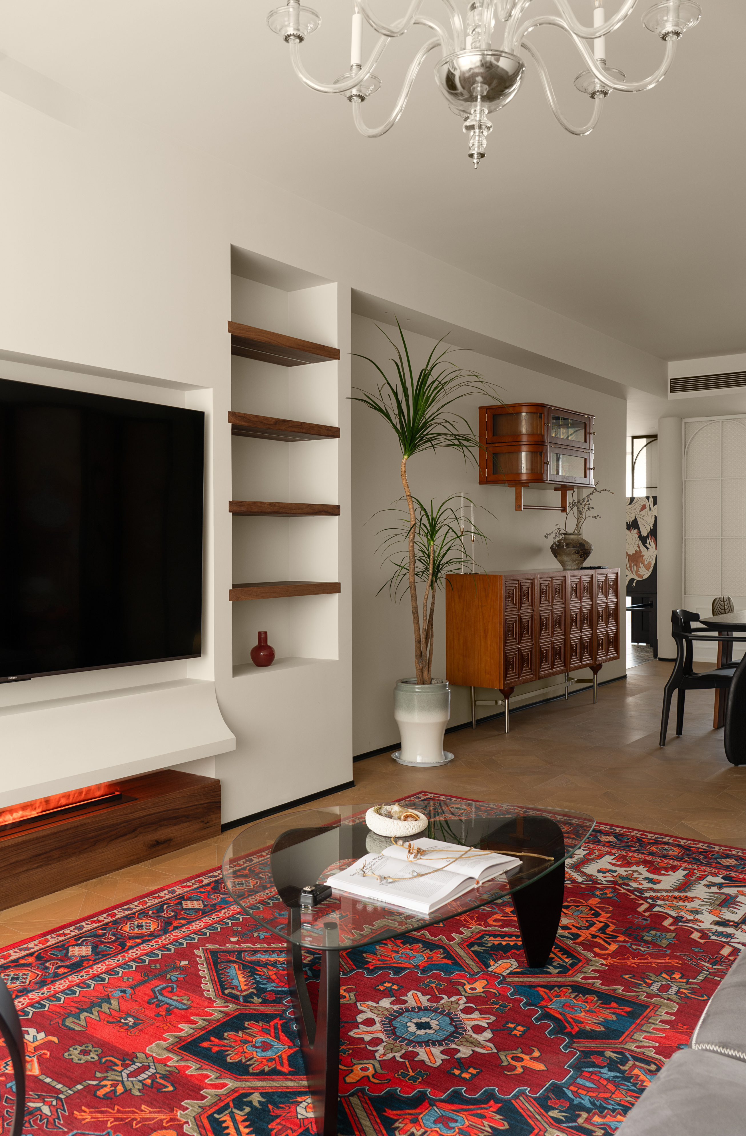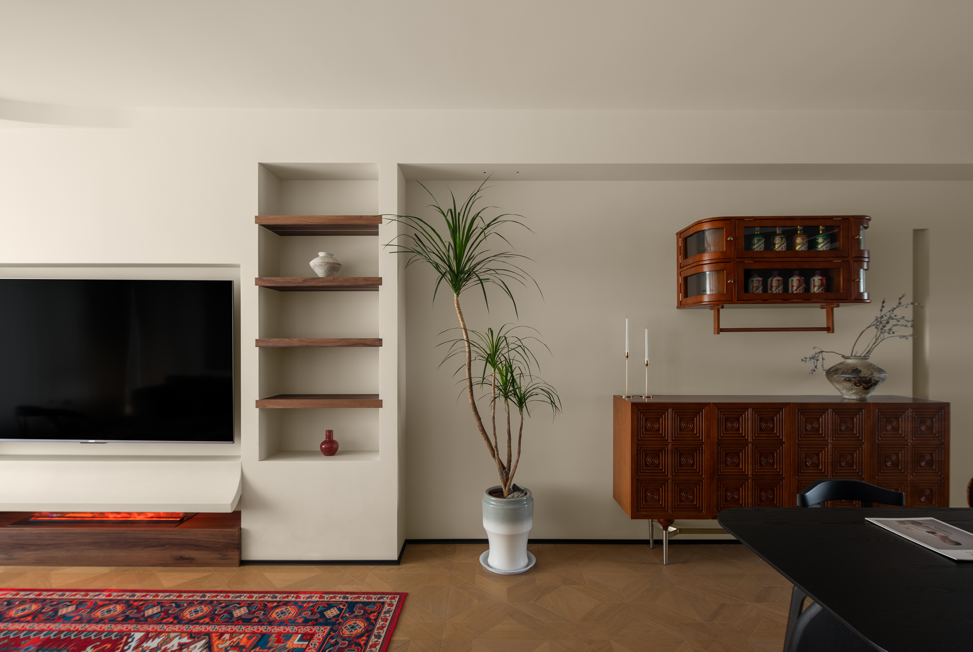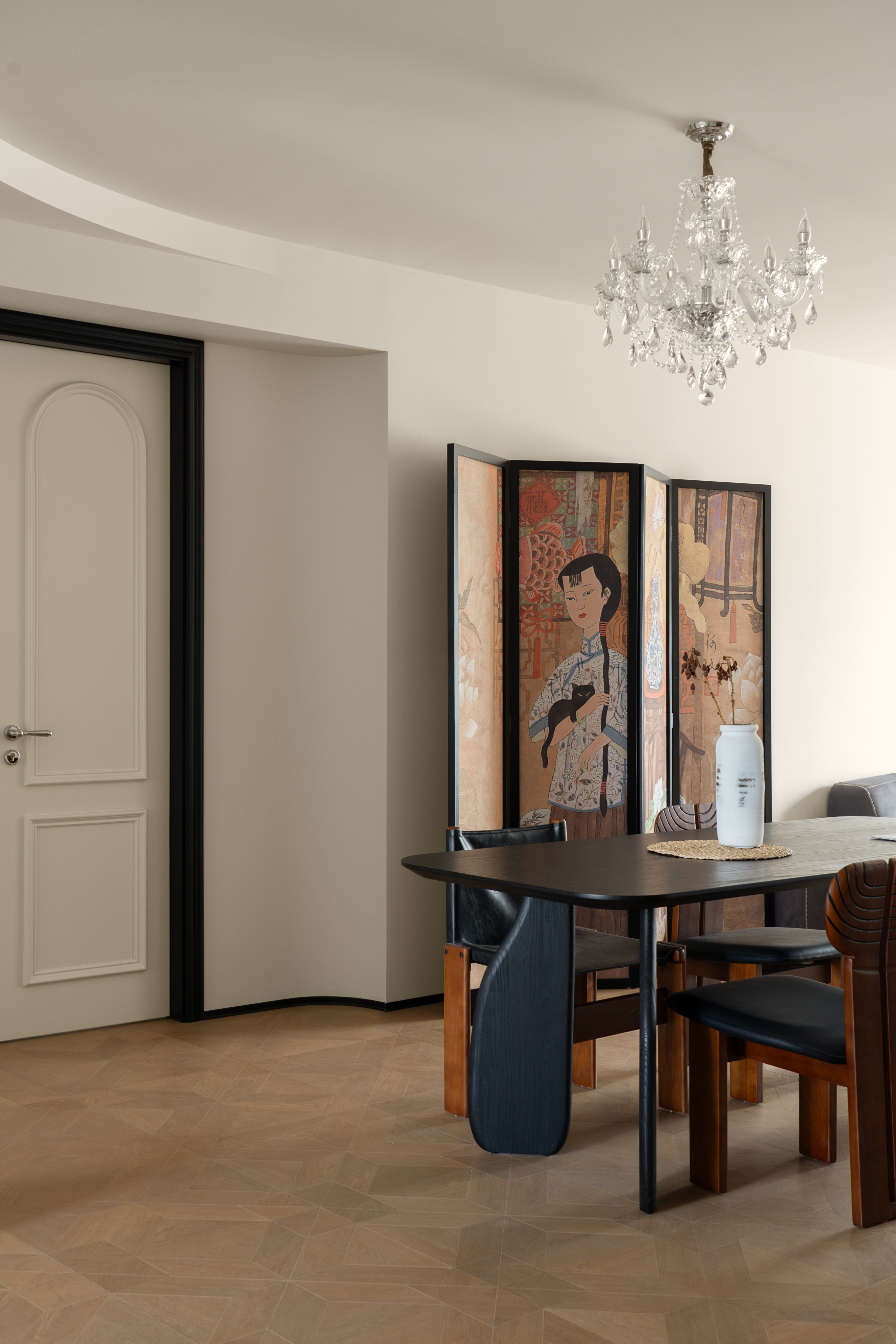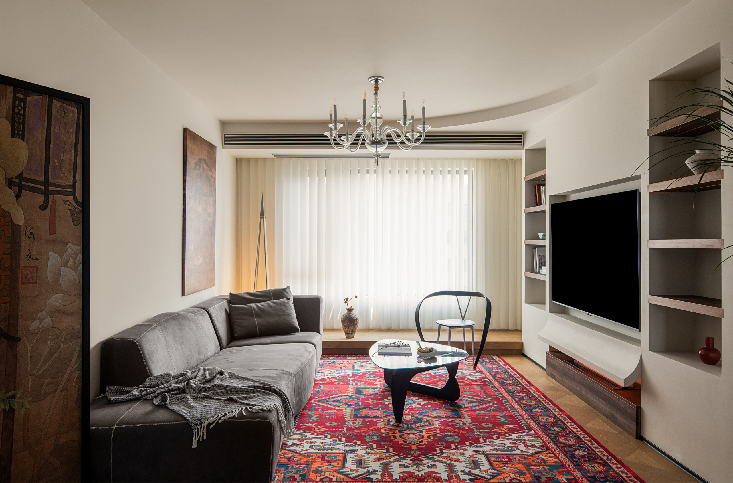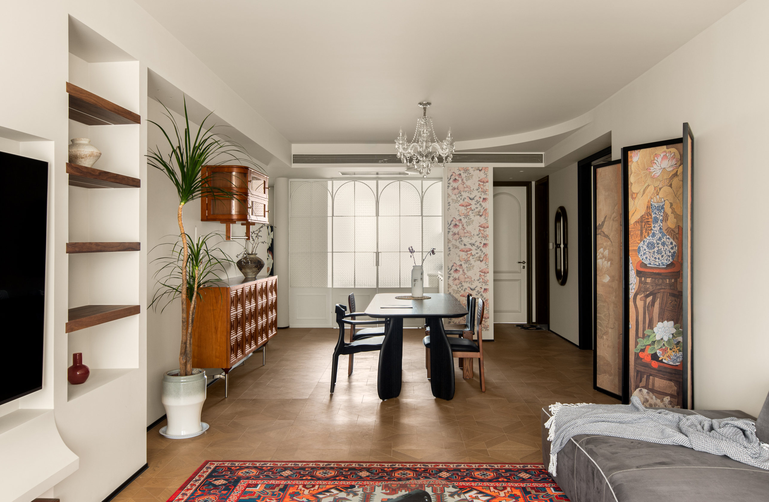 客厅作为家的核心区域,没有拘泥于风格的框架表达,给家人营造更多相处情景的可能性,通过屏风、地毯、沙发自然过渡,让各个功能区在完整的空间内,各有边界。