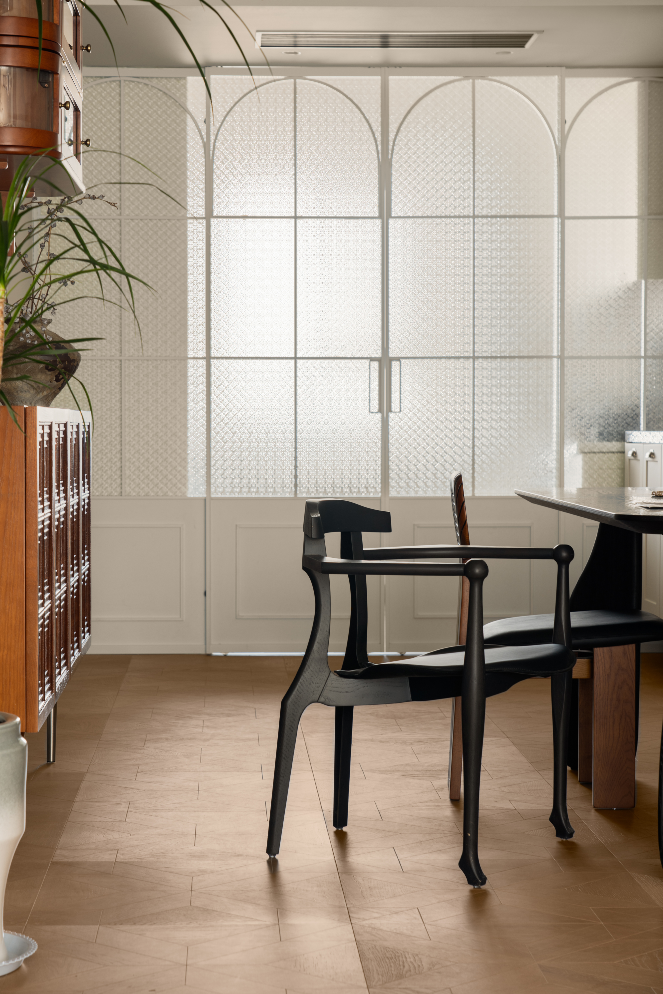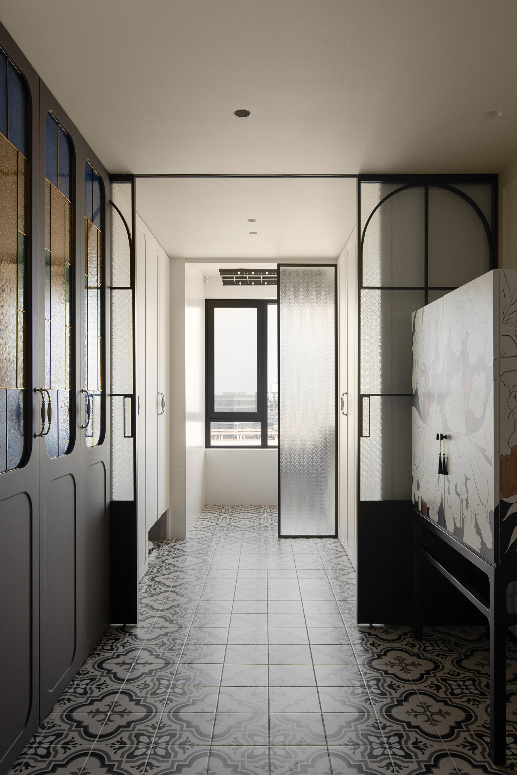 经典的复古弧形格玻璃门搭配三色玻璃衣柜,为空间增添了独特的复古情调与怀旧浪漫的氛围,还能够在空间中引入自然光线,增强通透感和视觉开阔感。