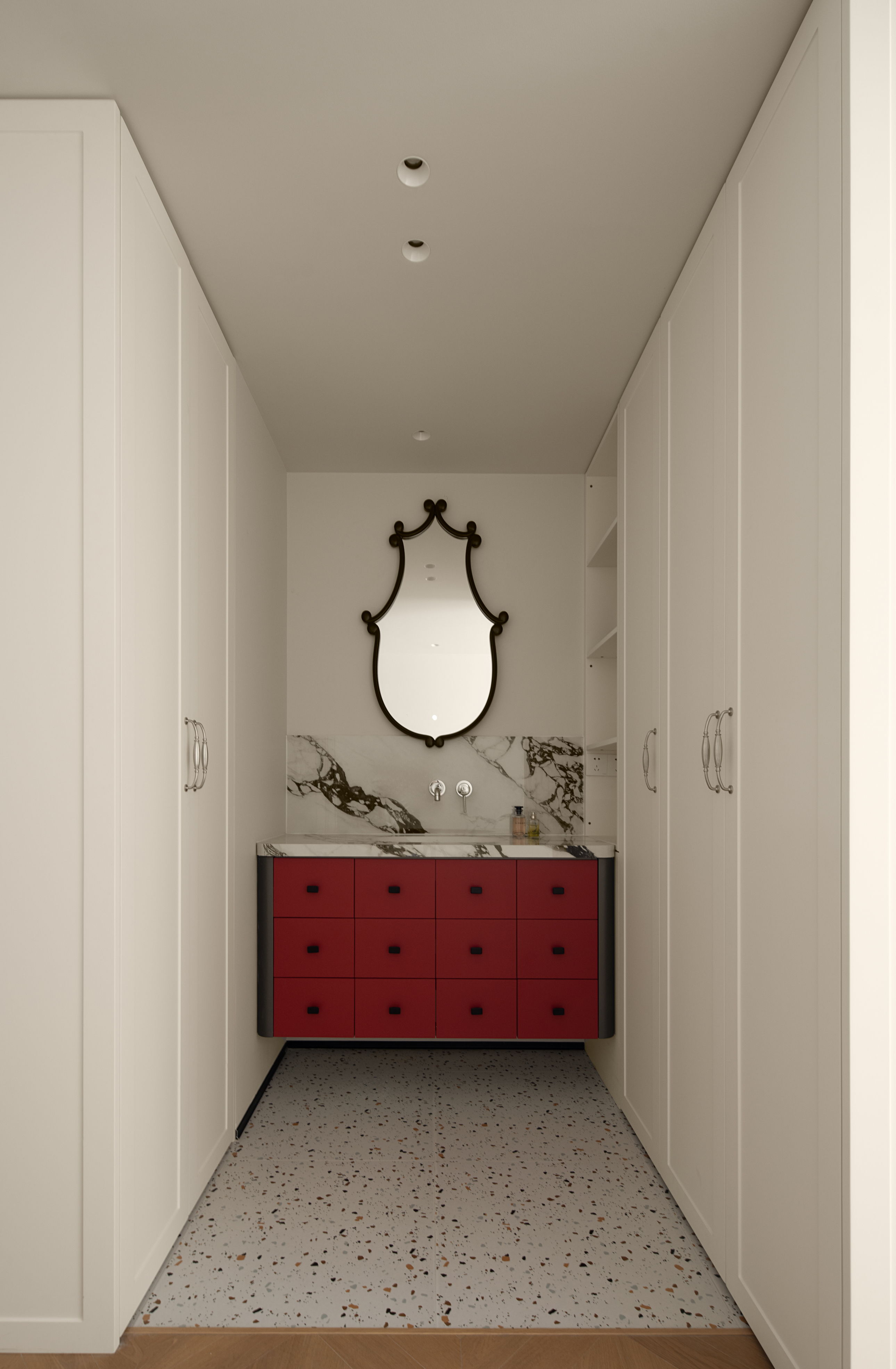 洗漱区域单独划分,红色悬空储物柜进行调色,沿墙铺开的通顶柜,让收纳功能达到更大化,对称设计强化了空间的秩序美感,开放格便于日常使用。