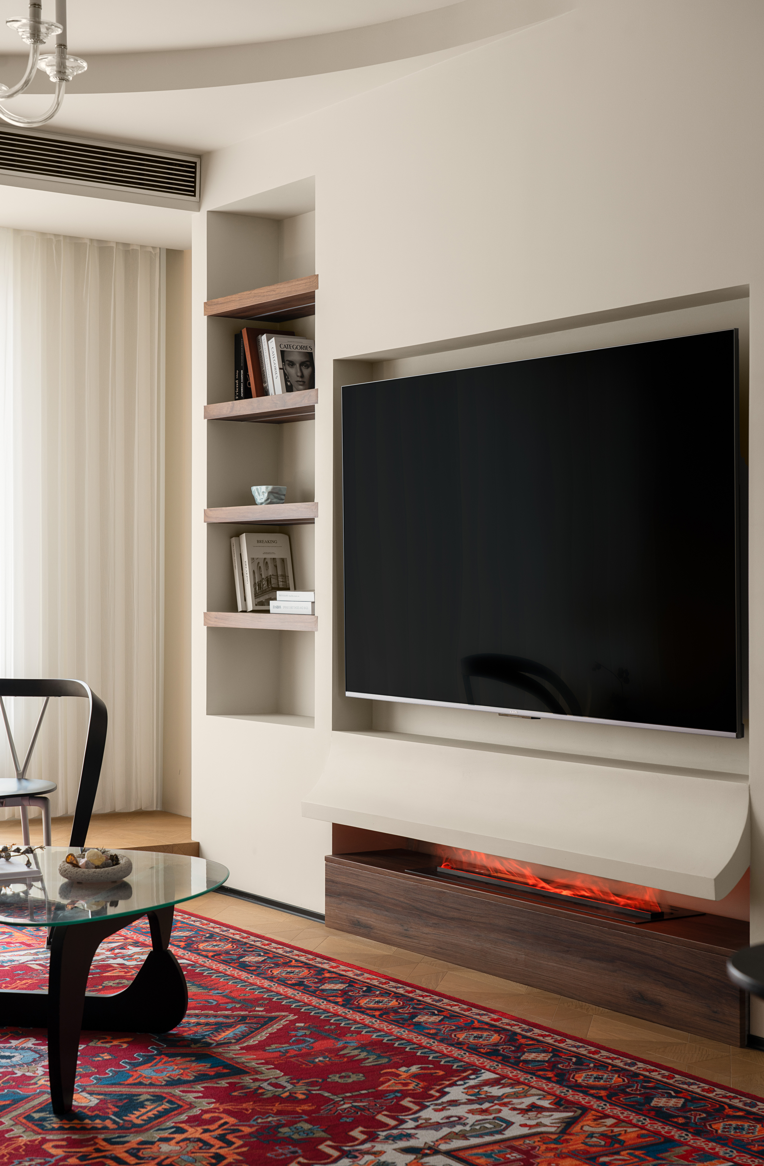 电视下方打破传统收纳形式做壁炉设计,瞬间为家注入暖意。