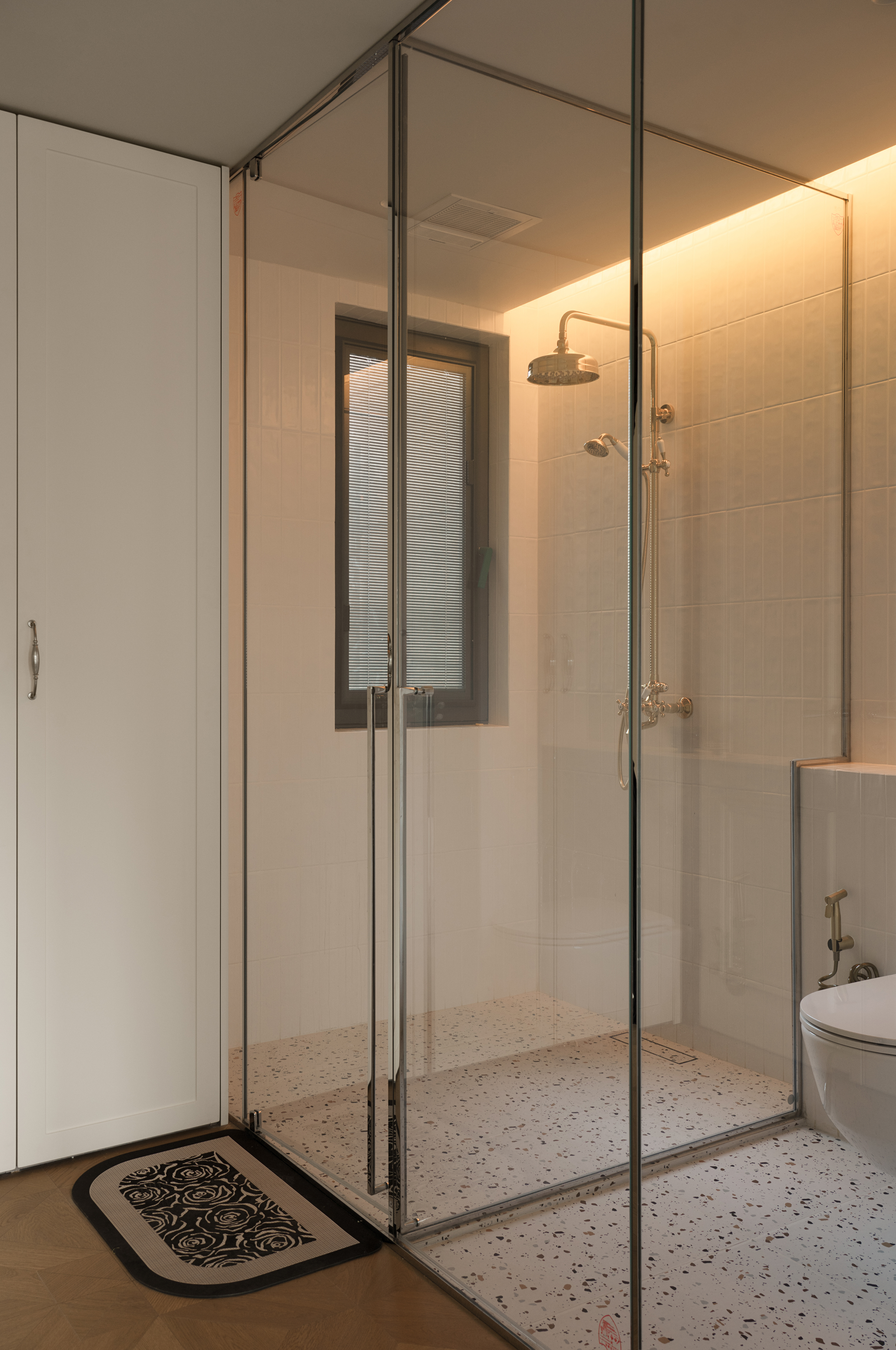 主卫采用大胆的设计,通透的玻璃门后期会增加渐变磨砂感,淋浴与马桶做到干湿分离更舒适。