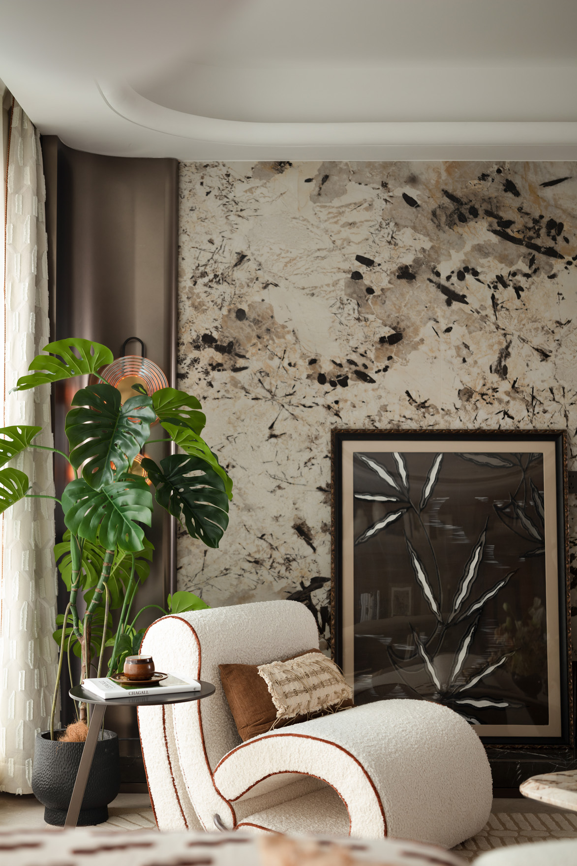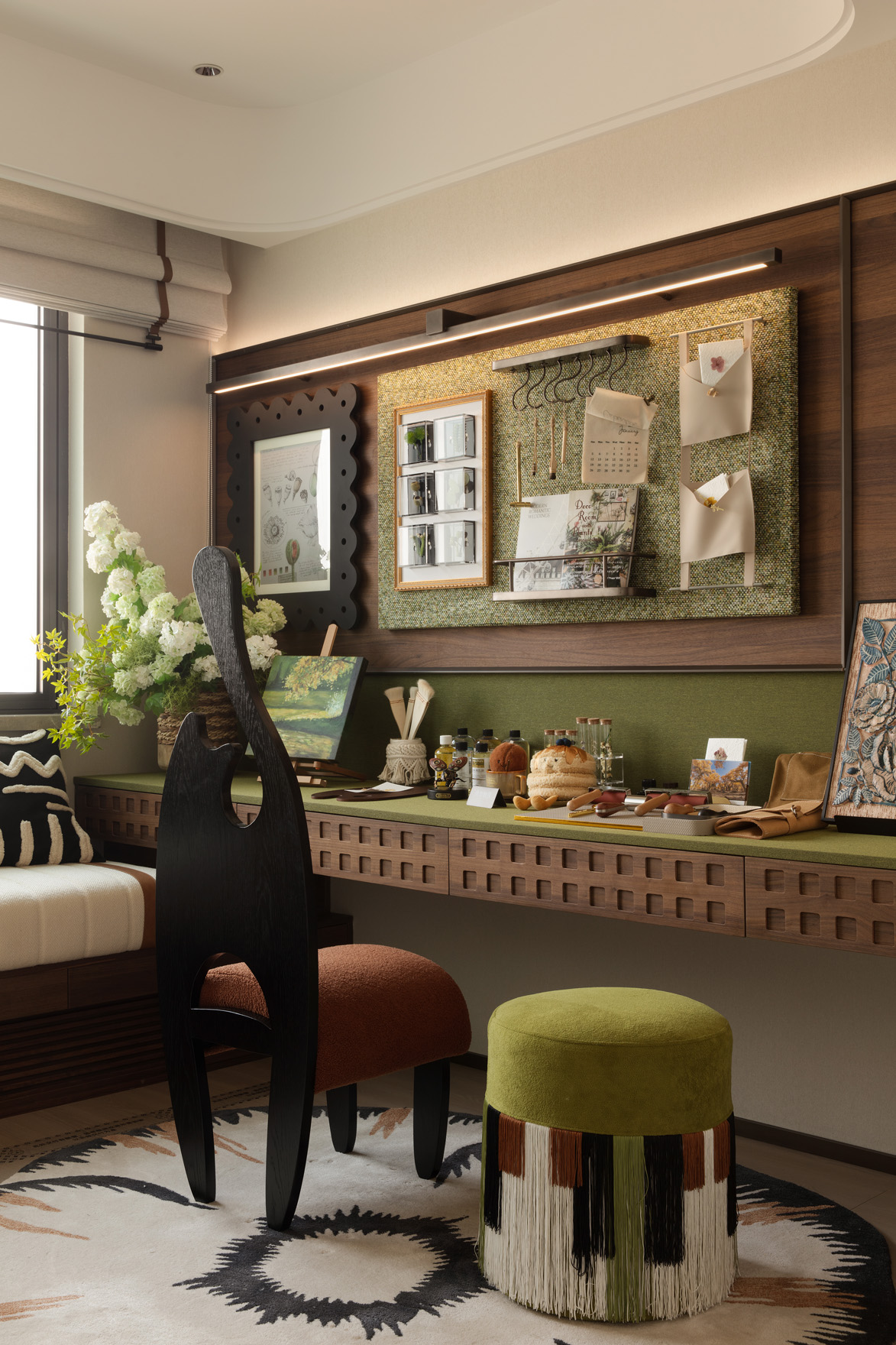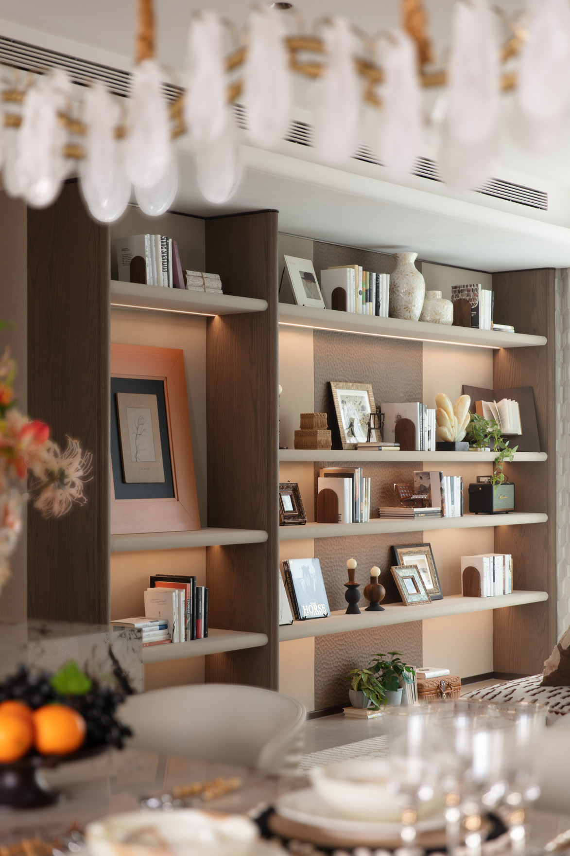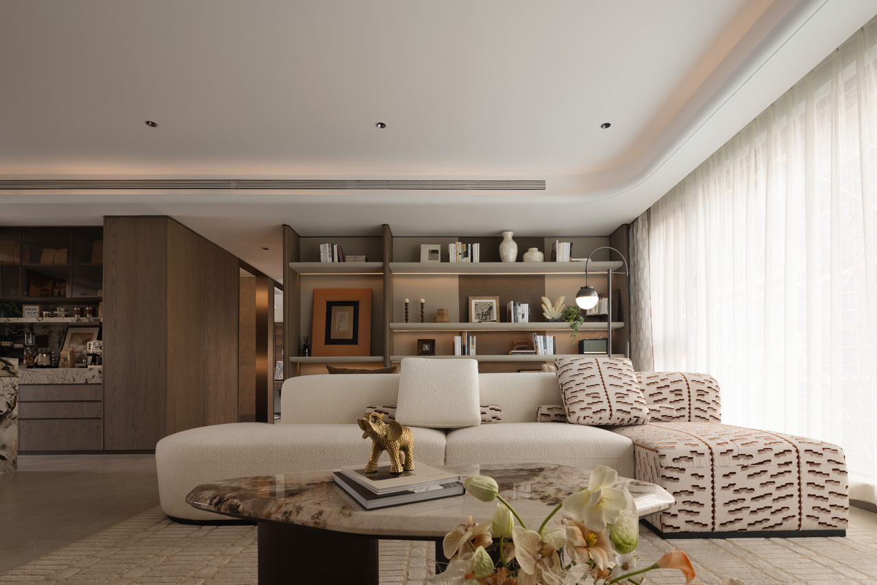 沙发背后,书架与艺术品悄然叠成一道精神山水。木格层叠,书籍纸页间藏着经年的折痕与走心的批注,是思想沉淀的痕迹;不逐整齐划一的陈列,反倒如自然生长的群落。