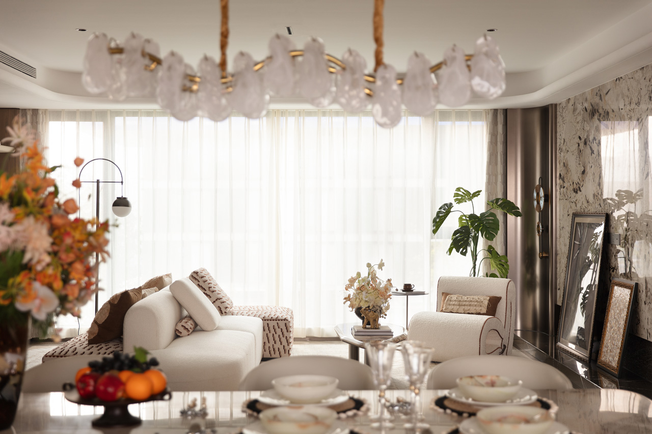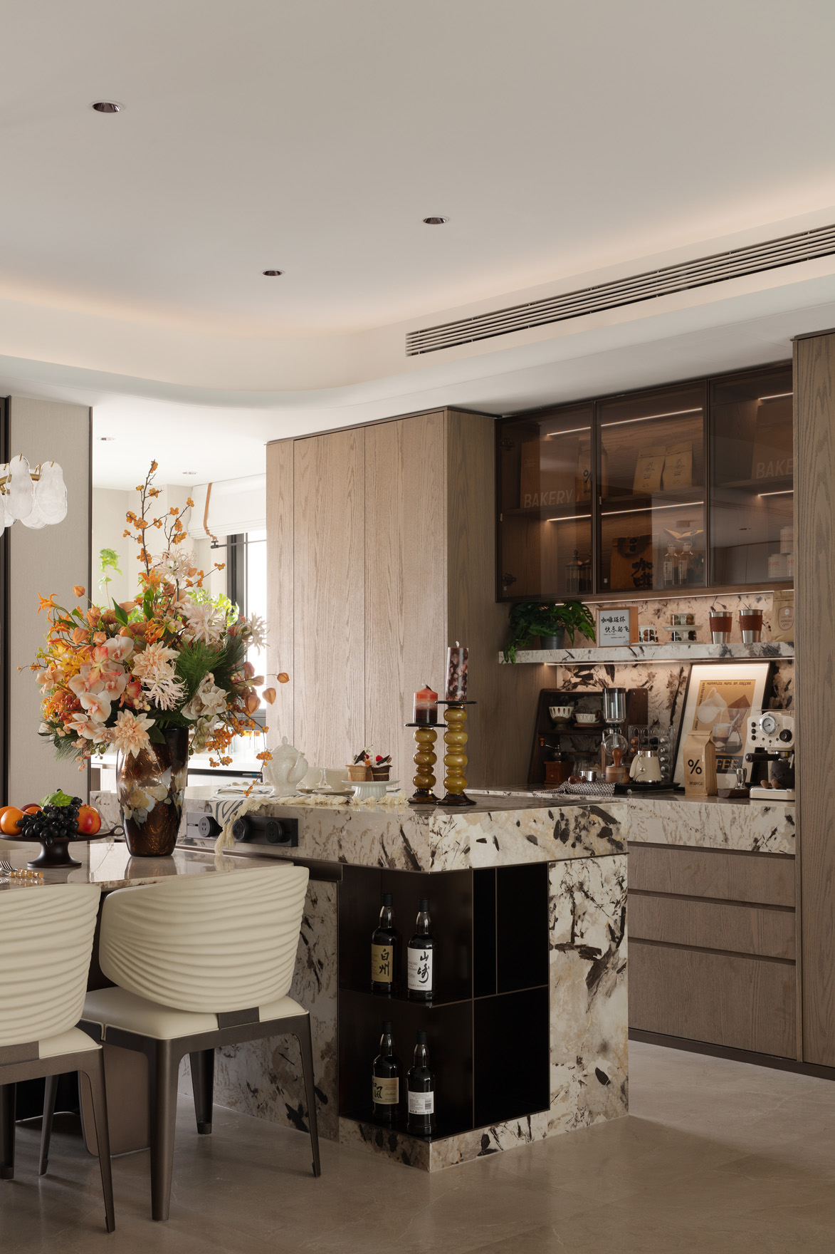 餐厅延续温润底色,云雾琉璃灯漫洒暖光,皮质雕花椅静立两侧,奢石金属餐桌承载三餐烟火。与厨房相连的开放式布局,让家的暖意不受阻隔,自由流淌。