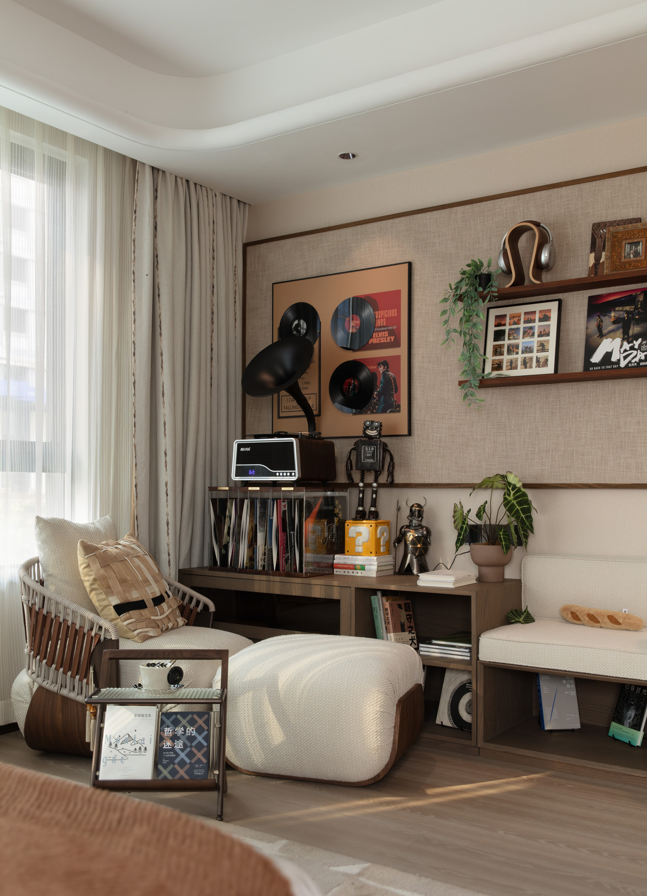 卧室早已不止于休憩之所,更藏着多元生活场景。 黑胶流转的低吟、书页翻动的轻响,皆在此间自在生长。