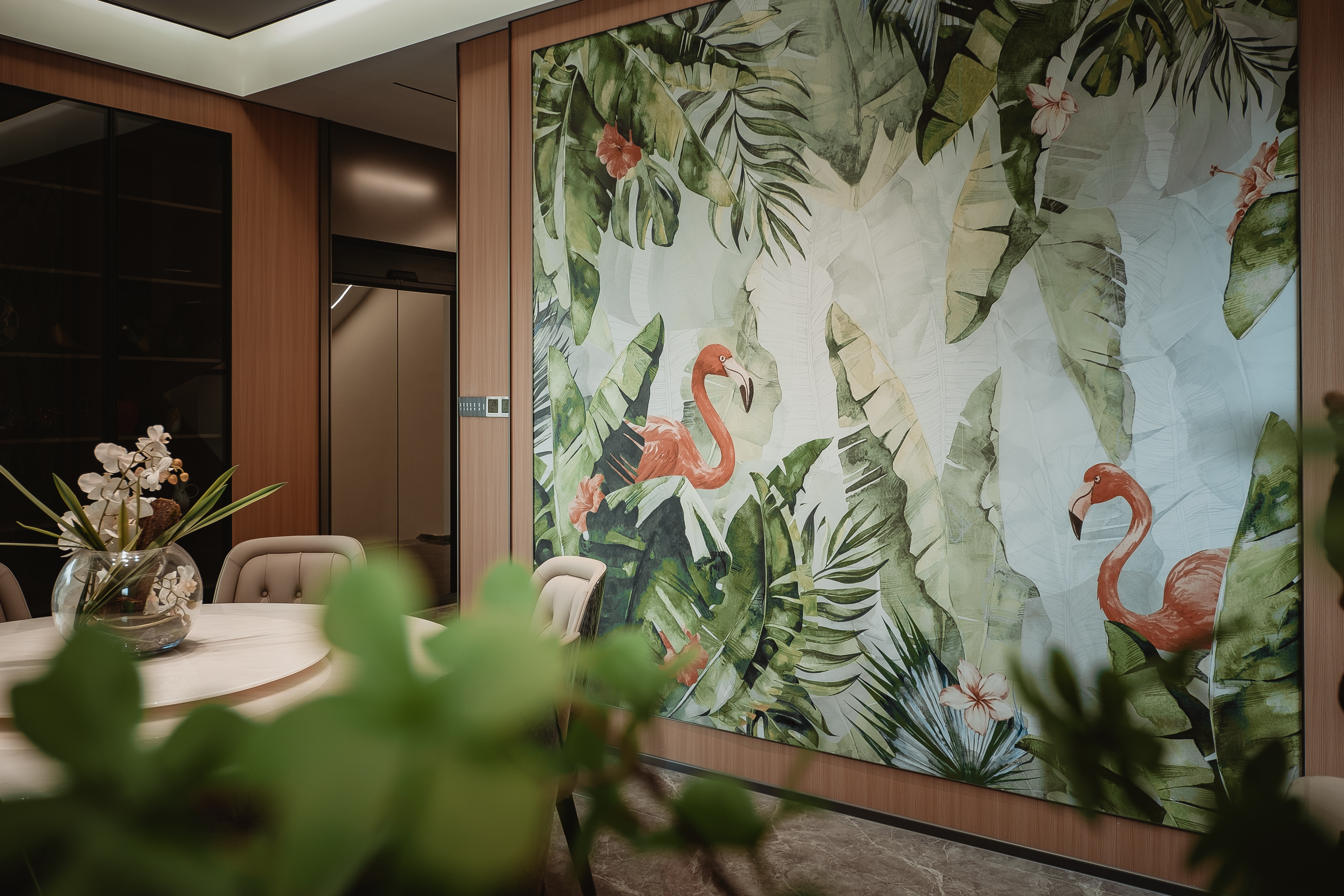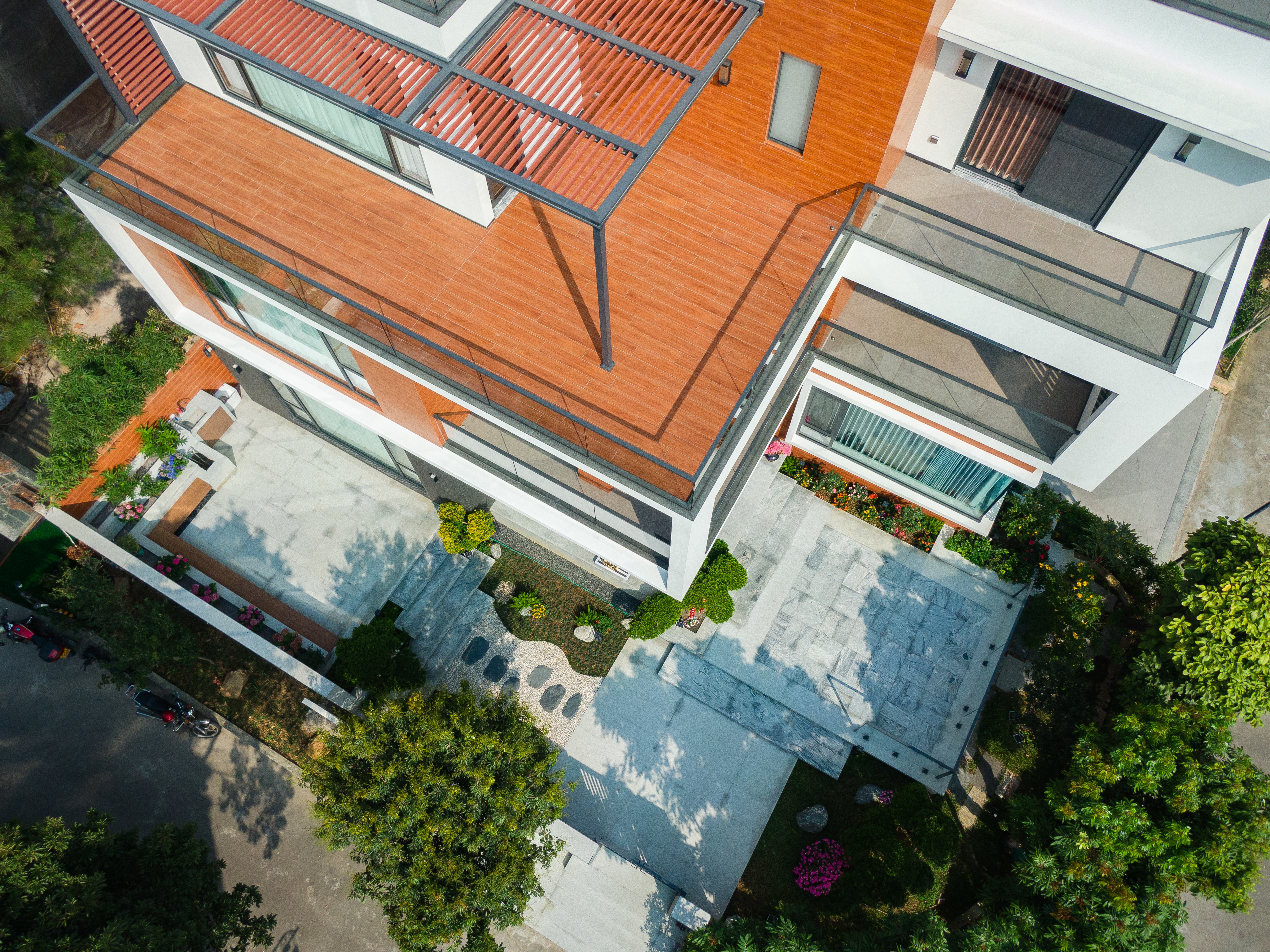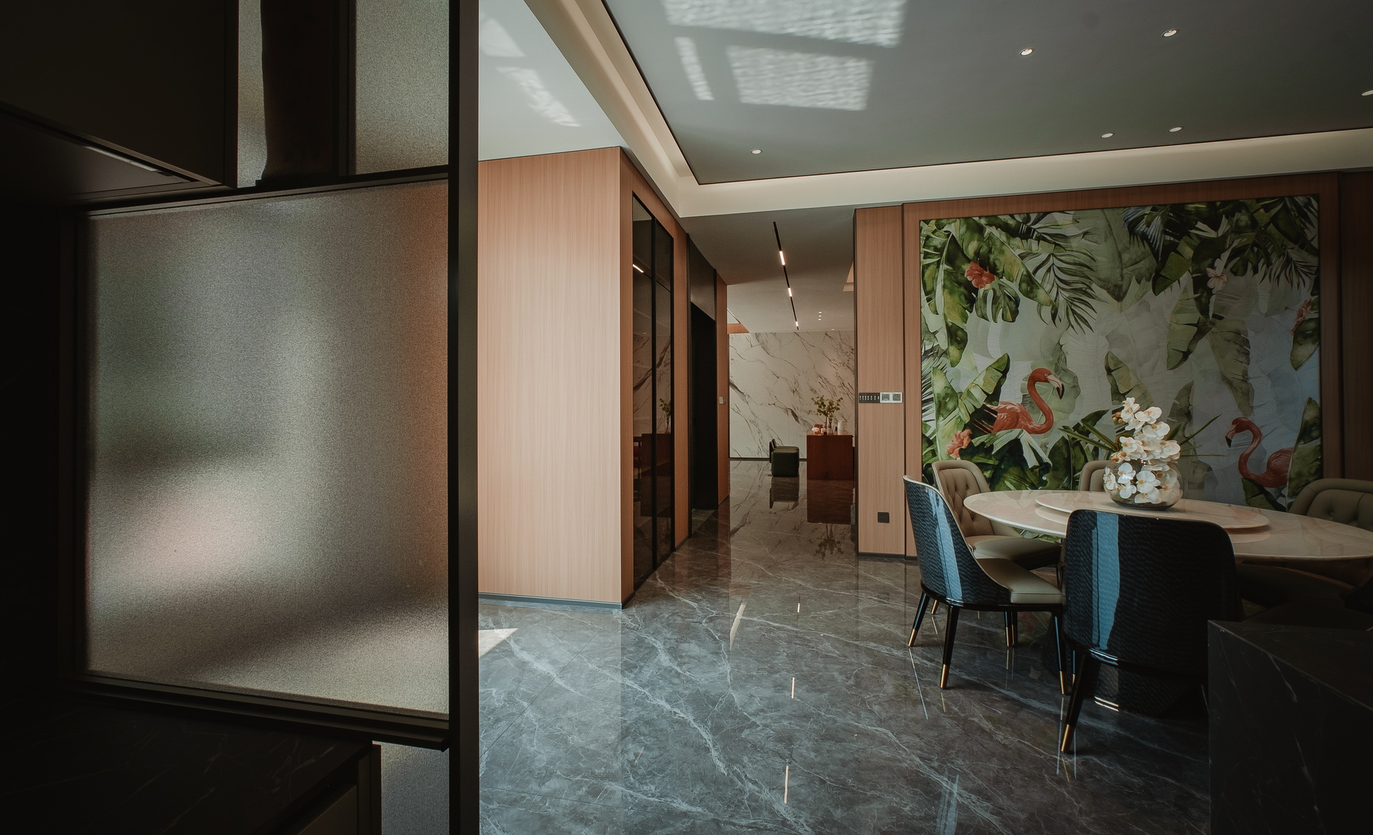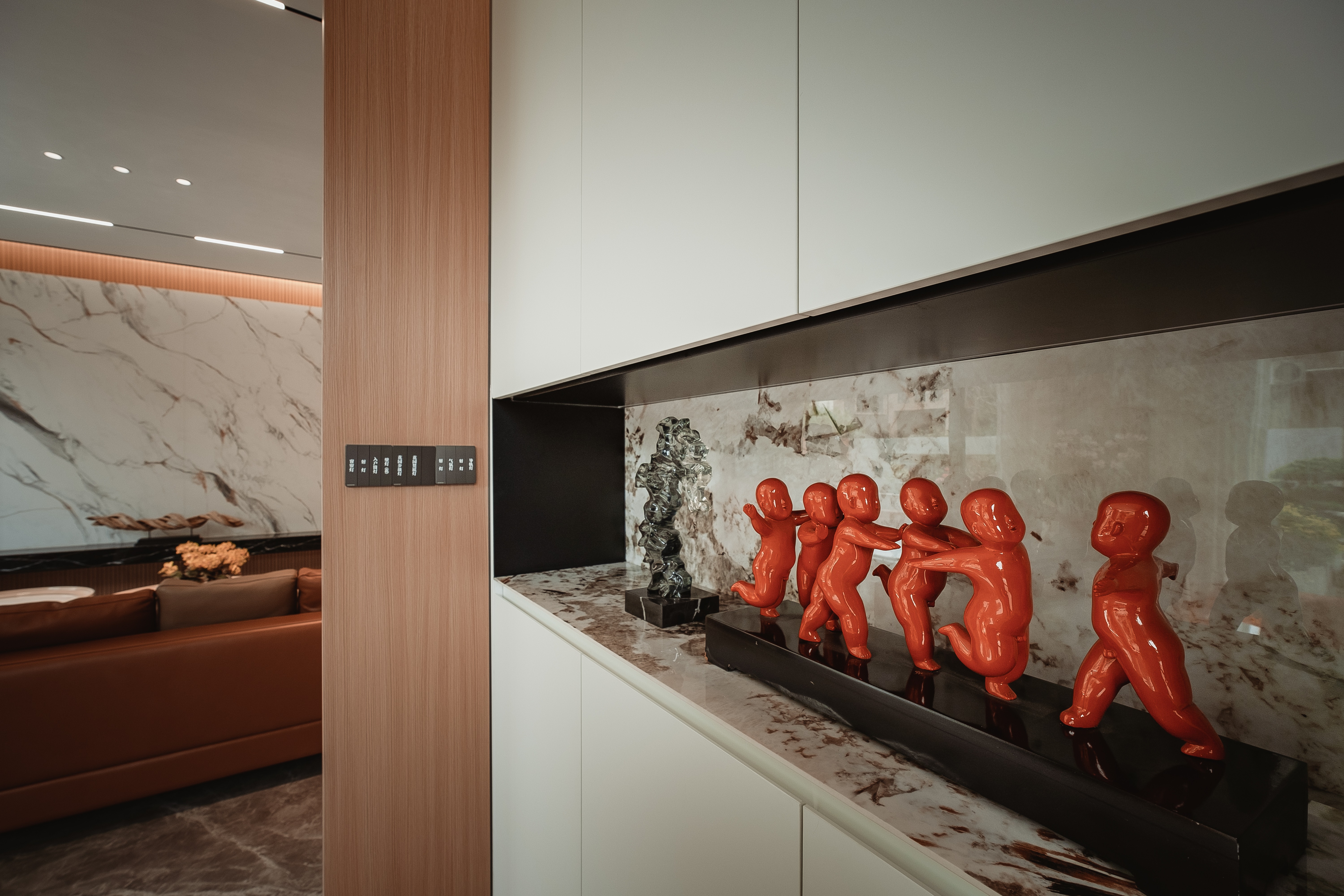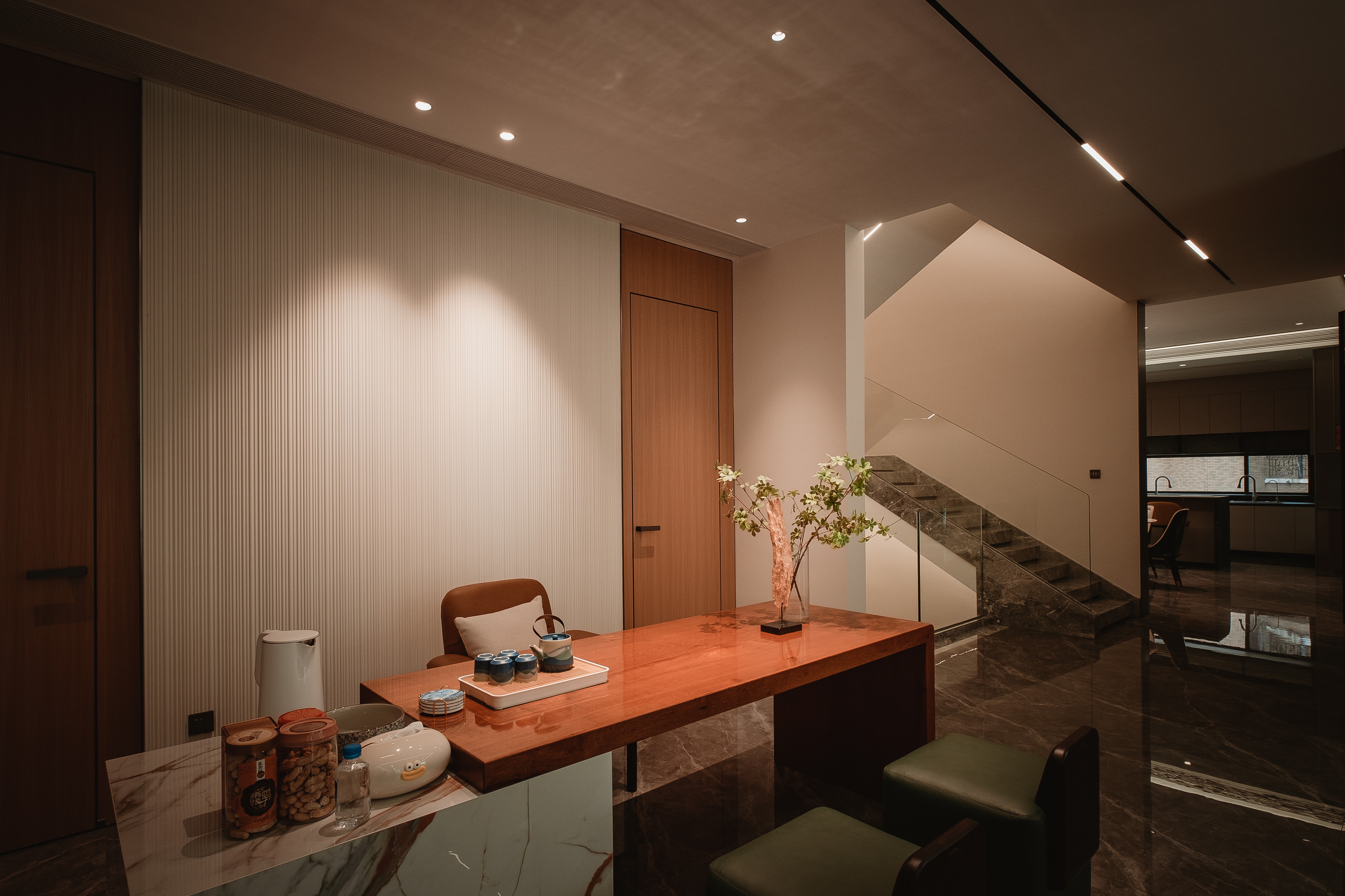 设计选材:建筑外观上选用大面积的外墙涂料,营造干净简约的视觉效果,与几何构成的风格非常匹配,室内以岩板护墙板及涂料为主,营造出干净明快,现代舒适的居家氛围