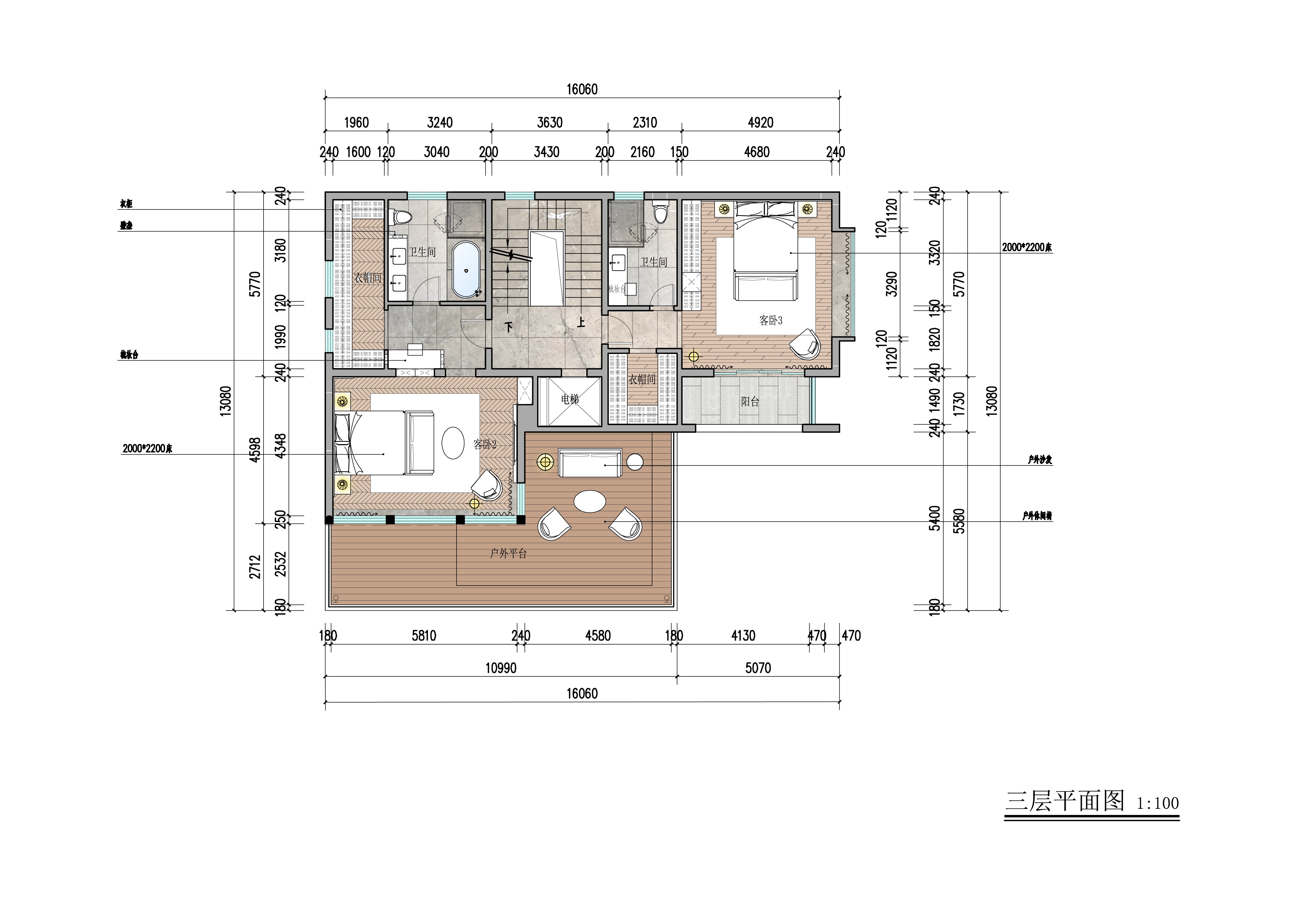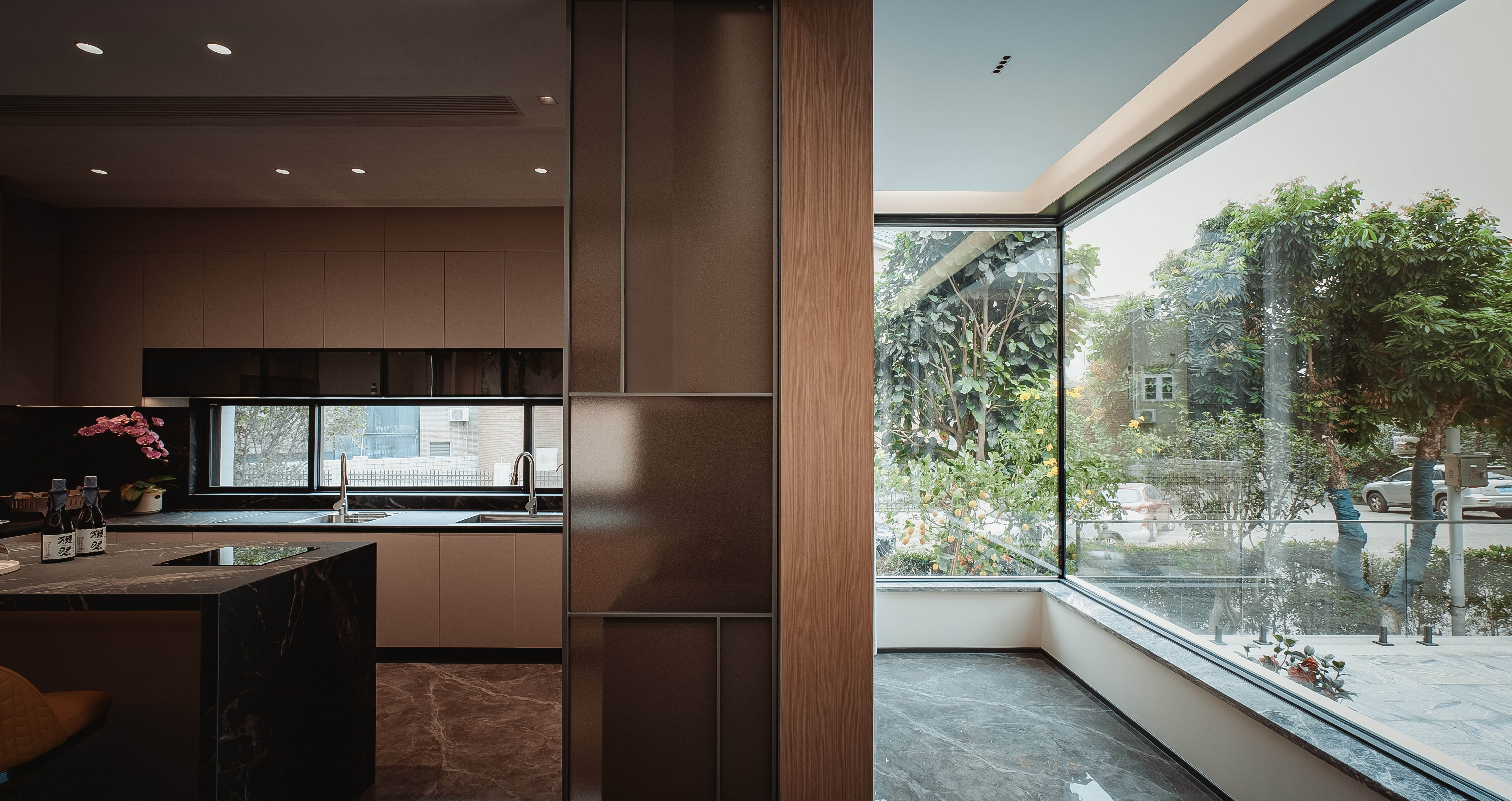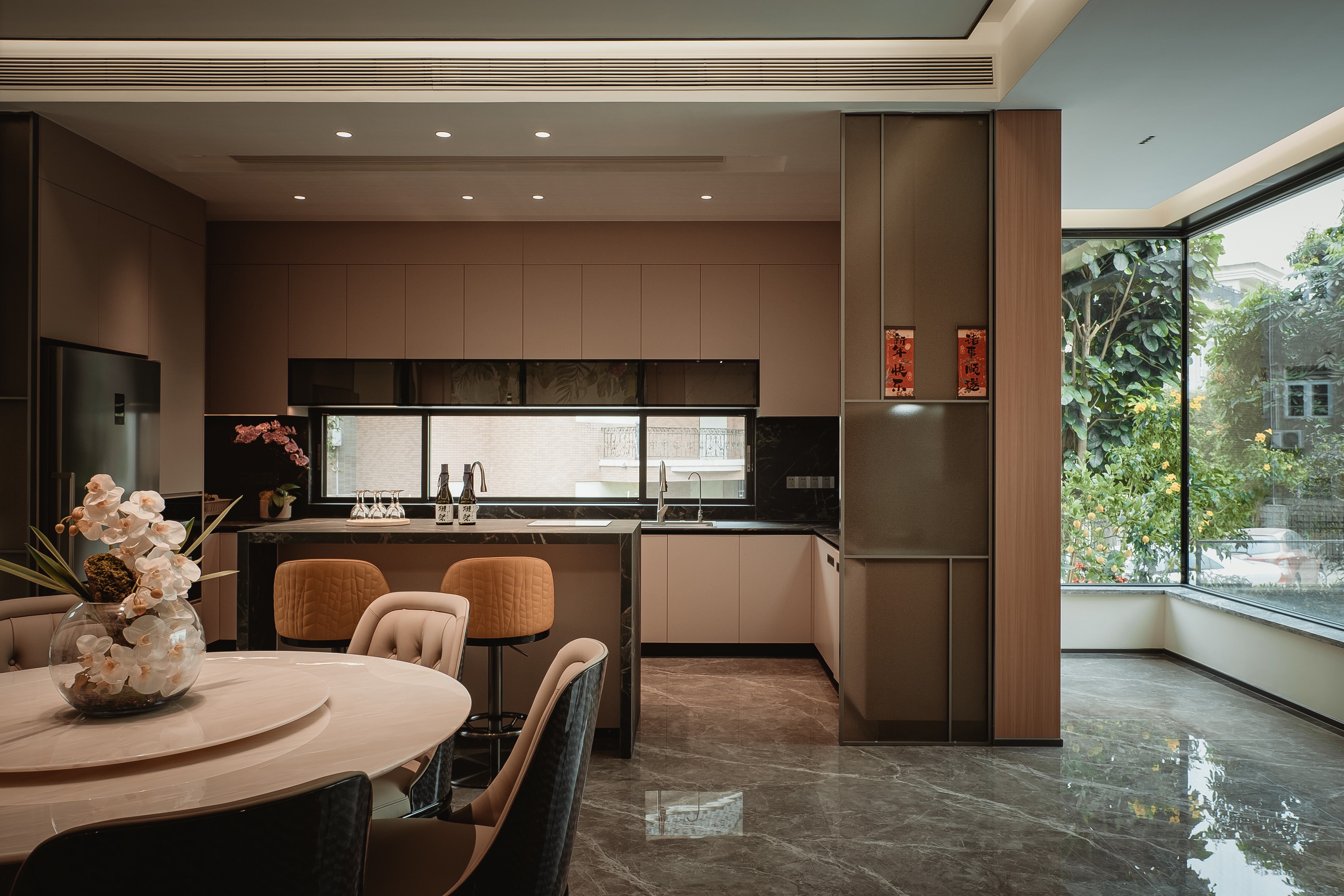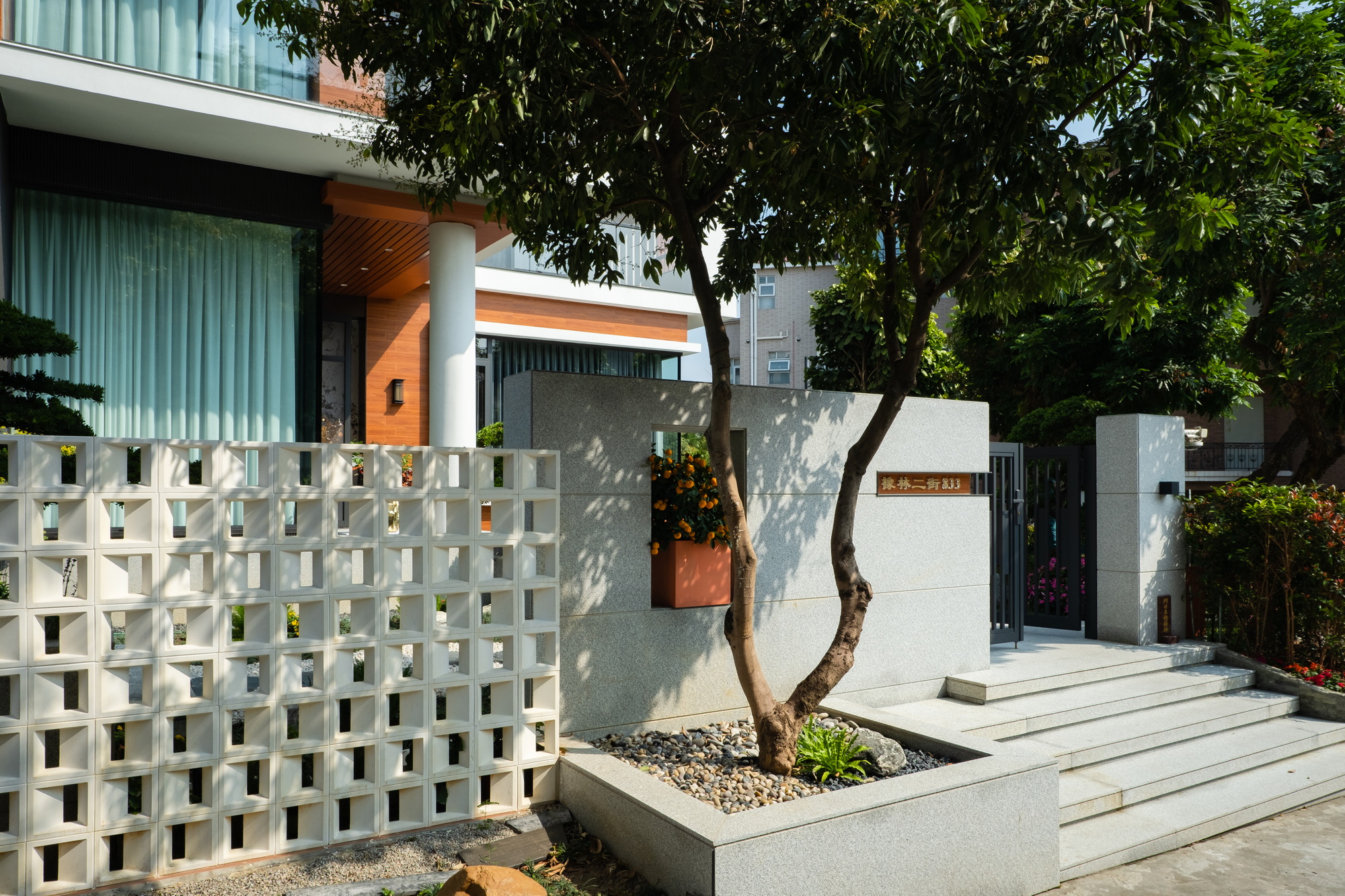 空间布局:L型的空间布局,以电梯为L型转轴,围合东南向的开放庭院,使室内空间的各主要空间都能享受庭院的绿意光影和自然风水