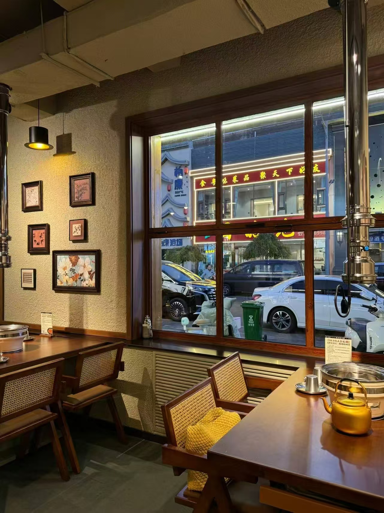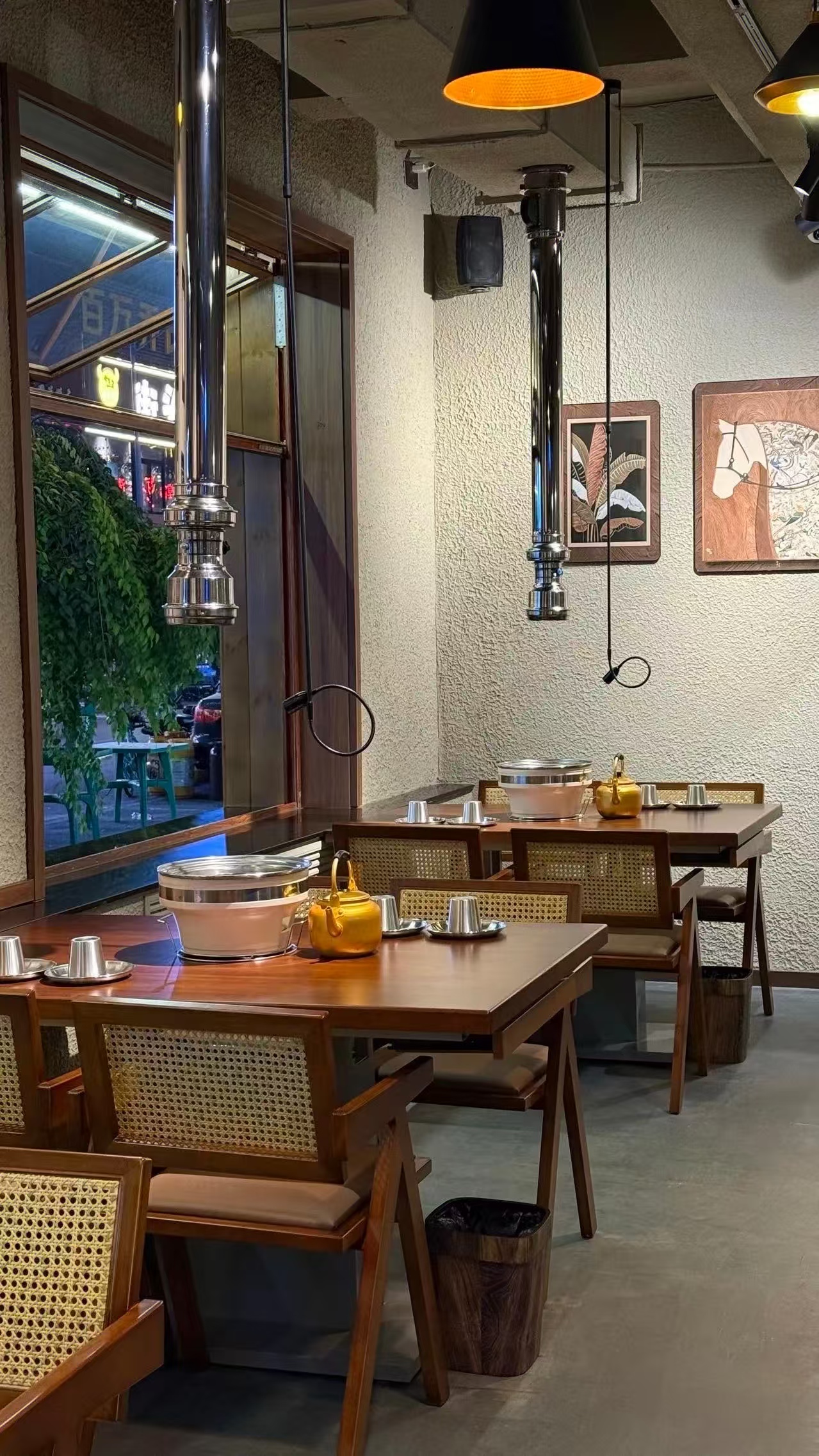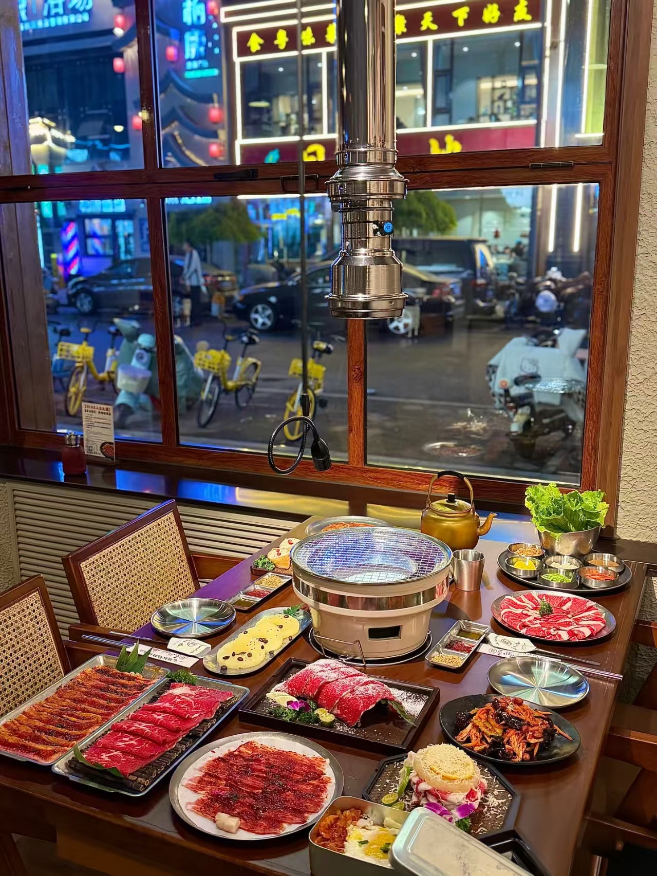 空间布局:临街景观式卡座布局:利用大面积落地窗设置靠窗卡座,将街道市井景象引入室内,既增加空间通透感,又打造“坐看街景吃烤肉”的独特体验,同时靠窗区域成为天然打卡点,提升用户自发传播的意愿。
