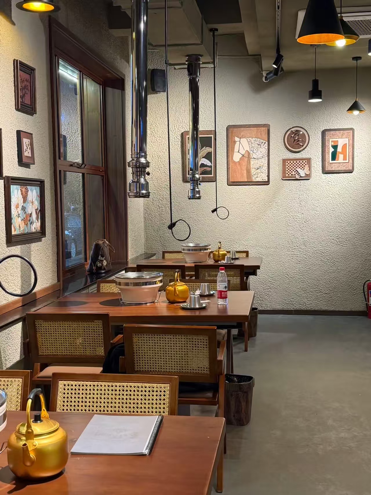 空间意境:融合“复古市井风+轻工业风+中式烟火气”的复合风格,以“松弛、怀旧、有温度”为基调构建空间氛围。核心视觉上,墙面采用肌理漆打造粗粝的复古质感,搭配实木书法招牌、复古相框挂画、黑胶唱片装饰,复刻老市井的怀旧氛围;材质碰撞上,木质餐桌、藤编座椅的自然温润,与金属排烟管、工业风吊灯的冷硬质感形成对比,平衡烟火气与实用性;细节点缀上,临街落地窗引入街景烟火,节日主题装饰(圣诞蝴蝶结、圣诞树)与花艺摆盘的餐食区打造打卡点,让复古空间兼具新鲜感,契合年轻客群的审美与社交需求。