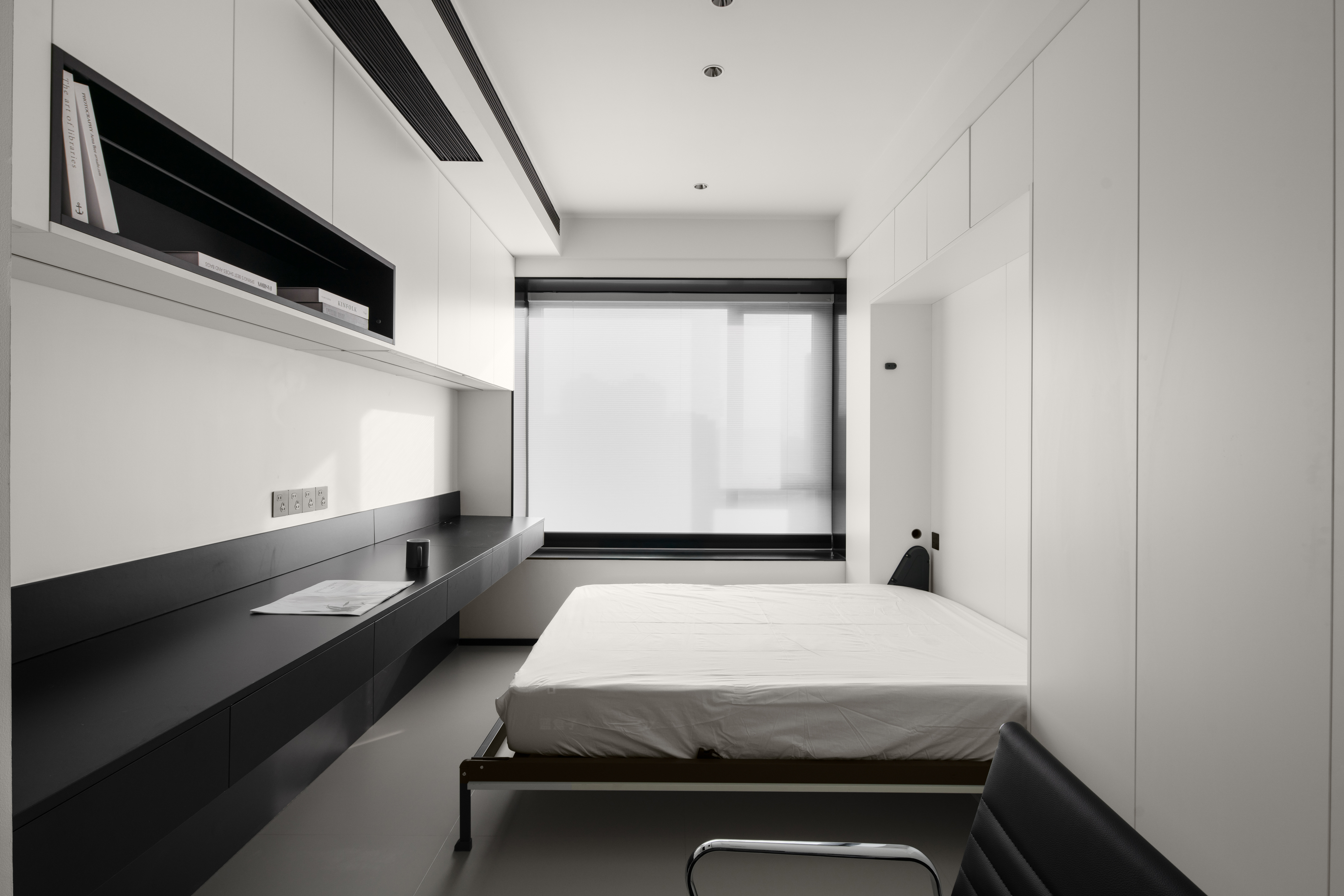 书房被设计师改造的更具多功能性,左侧承担书房功能,无论是办公储物都能满足业主的需求。右侧加装墨菲床,平日隐形不占空间,收起来和柜子融为一体;在有客人留宿需求时,可下翻延展开成正常床使用,更省空间,灵活性更强。