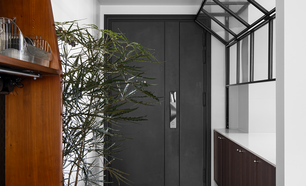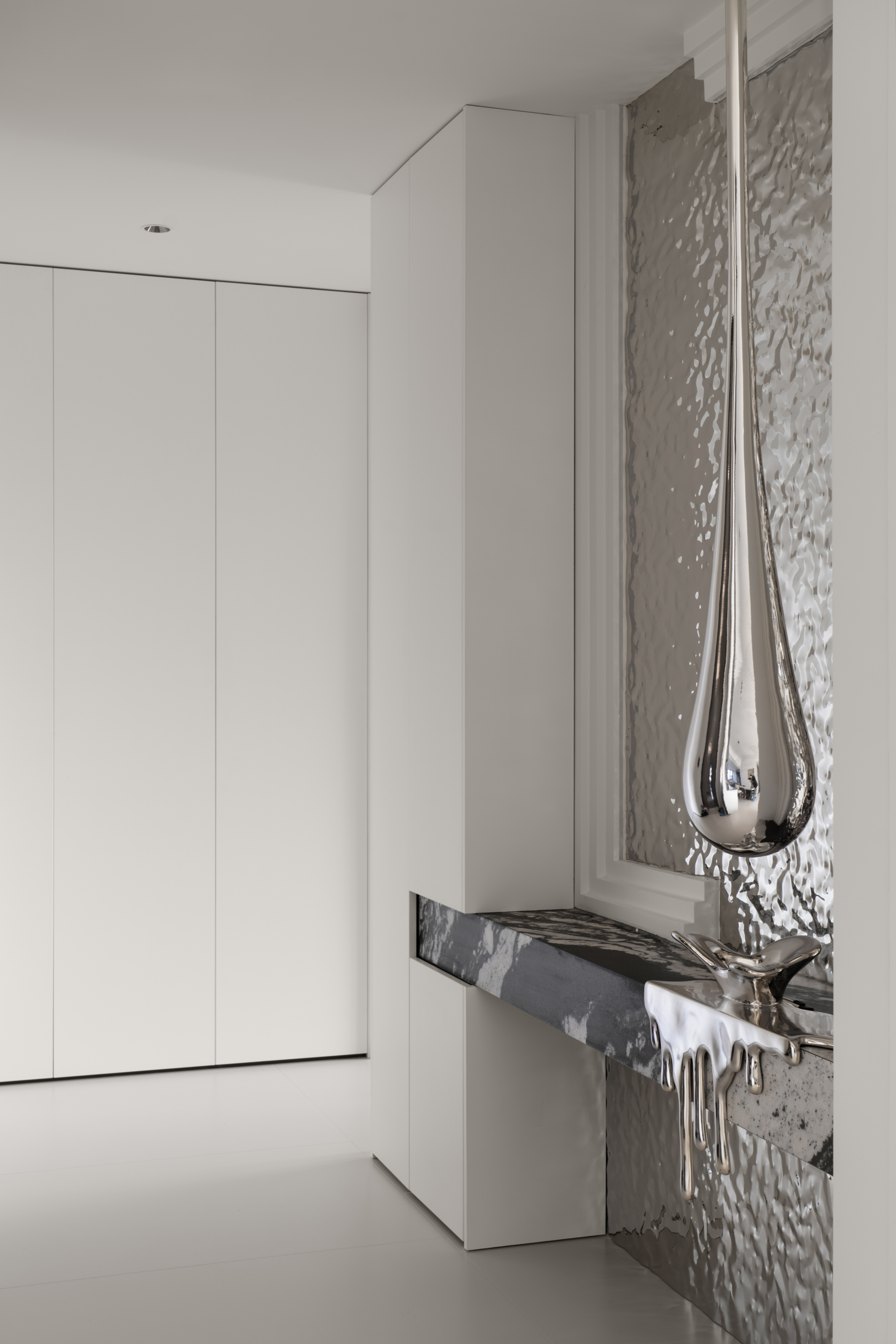 入户做装置艺术设计,保证入户隐私性的同时也是眼前一亮的存在。不锈钢水波纹板搭配水滴吊饰,金属质感的艺术装饰和石材形成了强烈的对比,既提升了视觉效果,又不失简约大气。