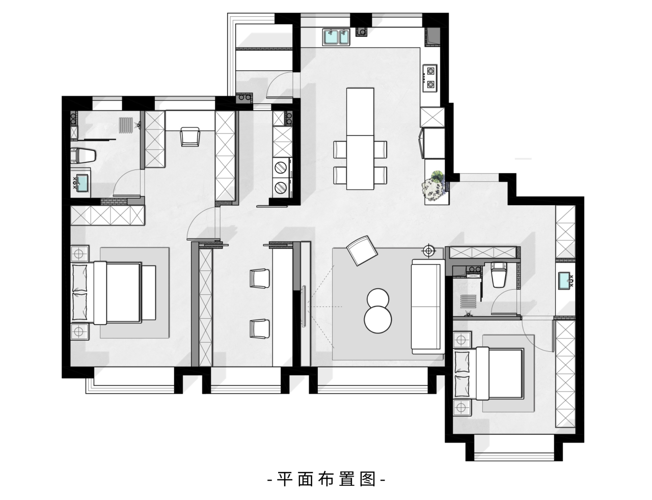 空间布局:根据业主需求,重新整合餐厨空间,改为开放式餐厨一体