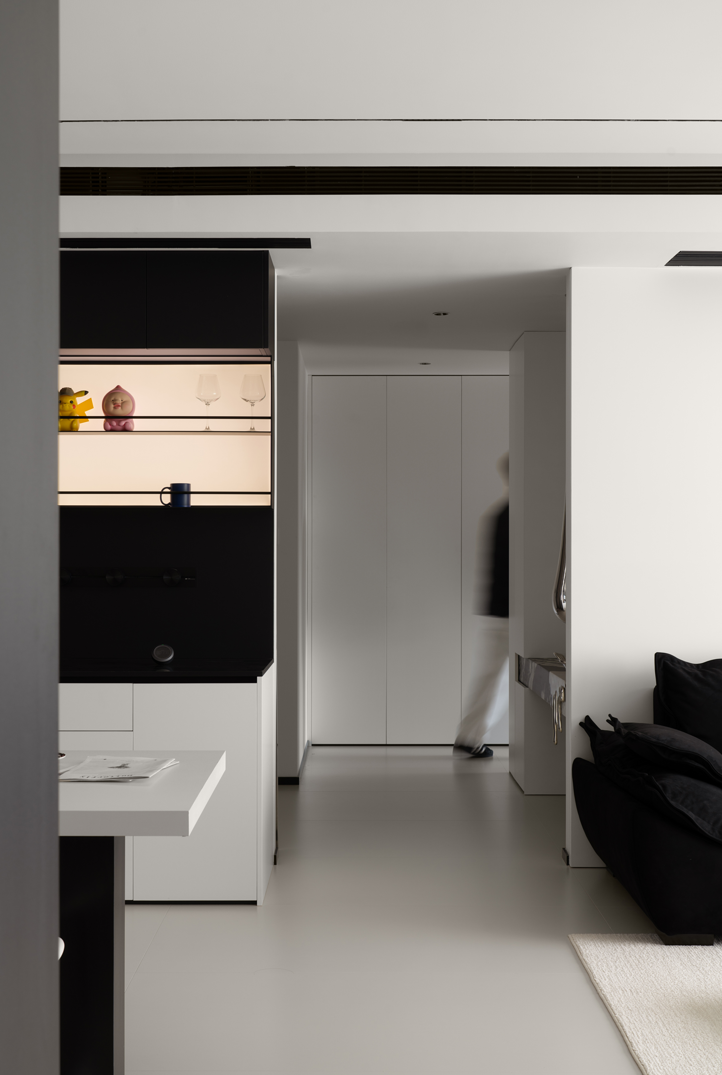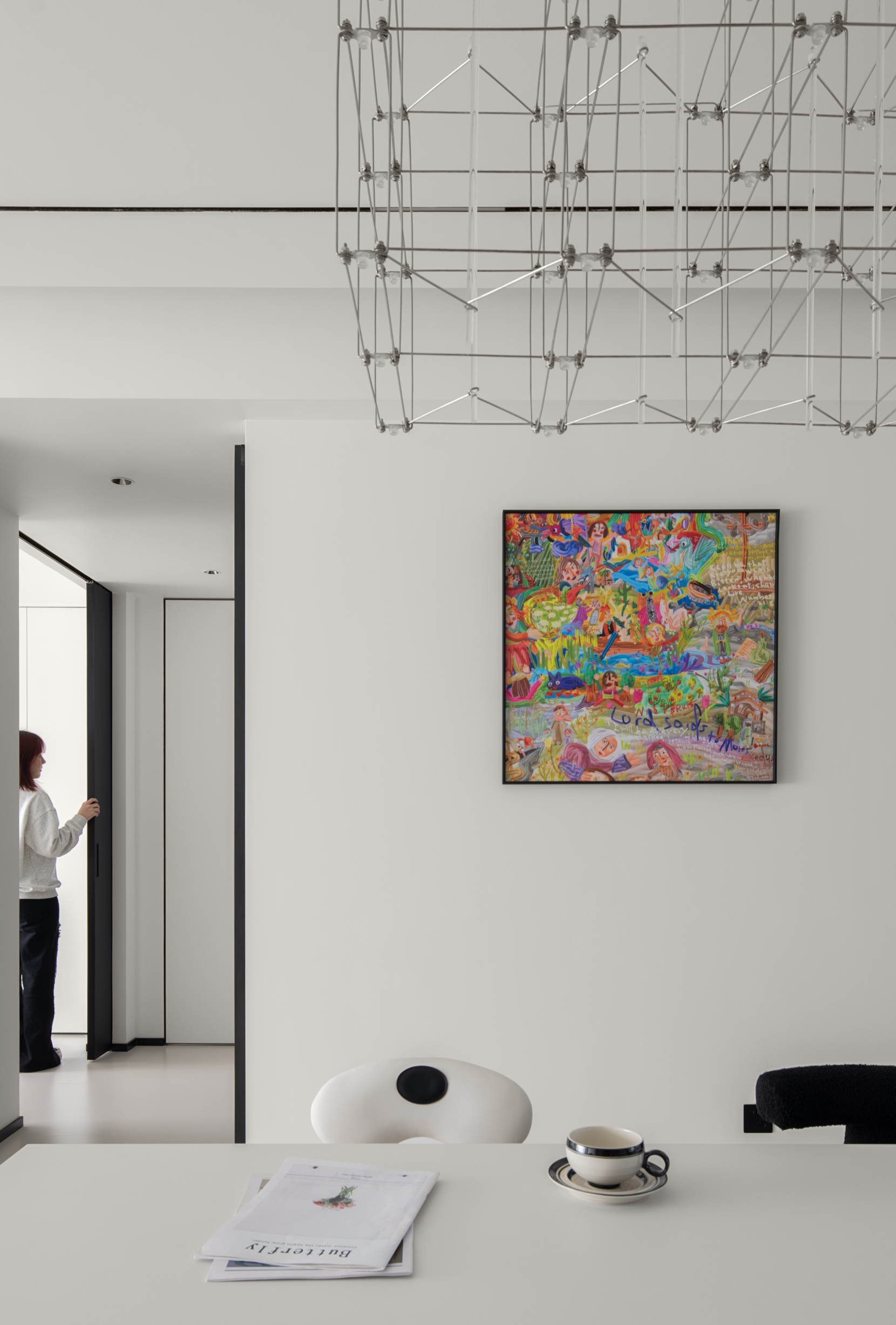 一侧做餐边柜,展示区设计灯箱背景,纯黑的背板和暖调的灯光,让极简的克制中又多了一丝温情和柔和。另一侧确保空间呼吸感,不适合做过于复杂的设计,因此设计师选择一幅色彩鲜明、画面丰富的挂画为点缀,同时也调和了黑白的冷静。